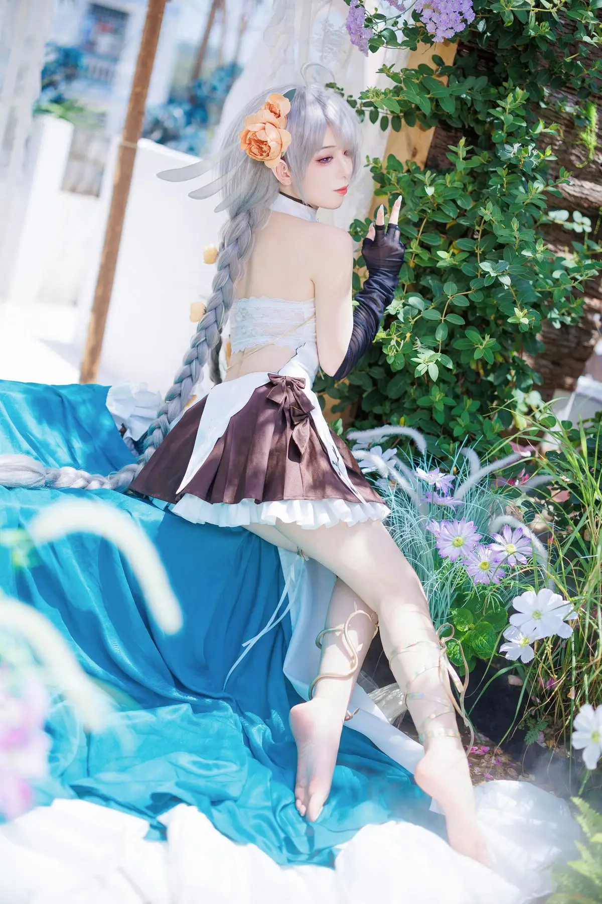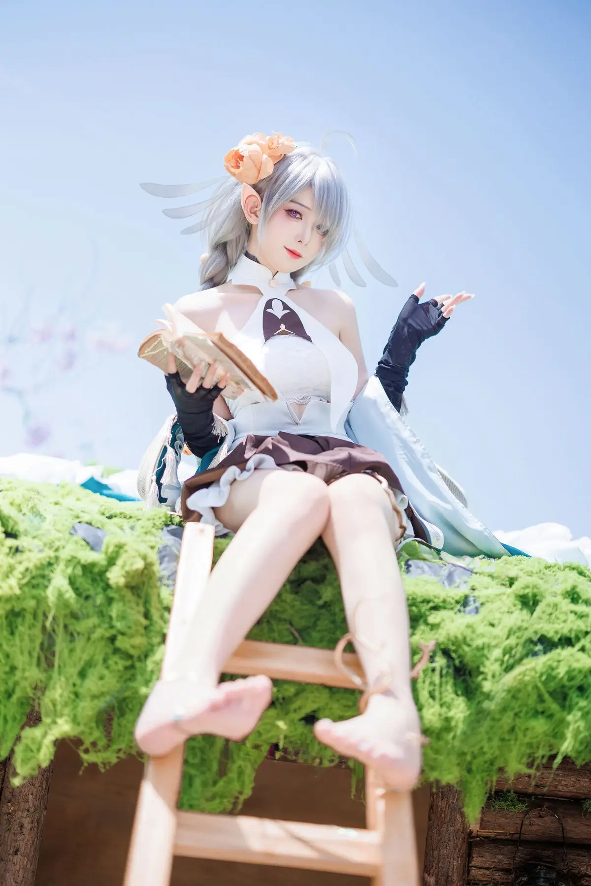 Immerse yourself in a magical realm with Coser Feng Jiang Jiang V as the captivating Aifoshen. This beautiful fairy-like character is adorned in an exquisitely crafted white and light blue costume complemented by platinum hair featuring a vibrant orange flower and distinctive elf ears. With a gentle demeanor and alluring gaze Feng Jiang Jiang V poses gracefully amidst lush green foliage under the warm sunlight creating a vivid and poetic scene. The pristine natural backdrop with a clear blue sky further accentuates the character's delicate and otherworldly charm. This is more than just a cosplay photoshoot it is an artistic masterpiece showcasing the meticulous dedication and passion of the artist. Explore this unique collection to fully appreciate the elegance and allure.
