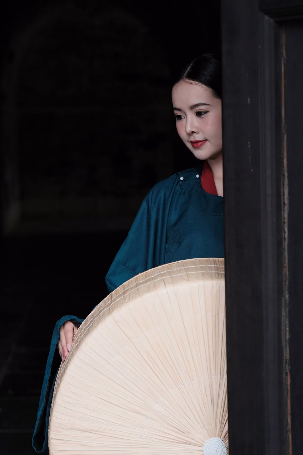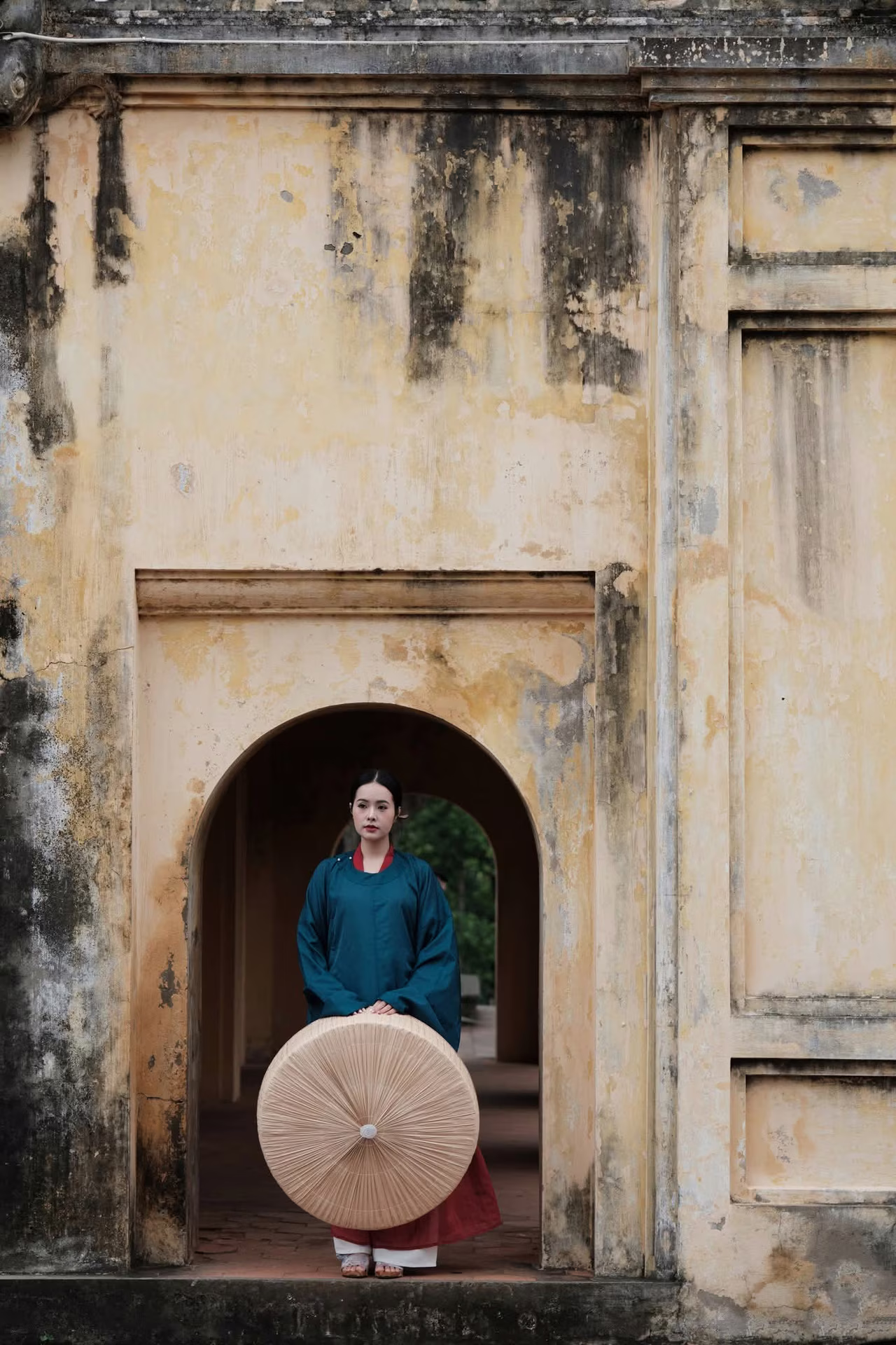 This photograph portrays a woman with captivating East Asian beauty her deep eyes holding many mysteries. Her delicate face elegant makeup and attire echoing traditional influences create a harmonious blend of past and present. The girl stands as a vivid symbol of cultural fusion where classic grace intertwines with a modern confident demeanor. This is not merely a portrait but a narrative about the beauty of Vietnamese people about the essence of traditional culture preserved and shining brightly in the new era sparking curiosity about the story behind each gaze.