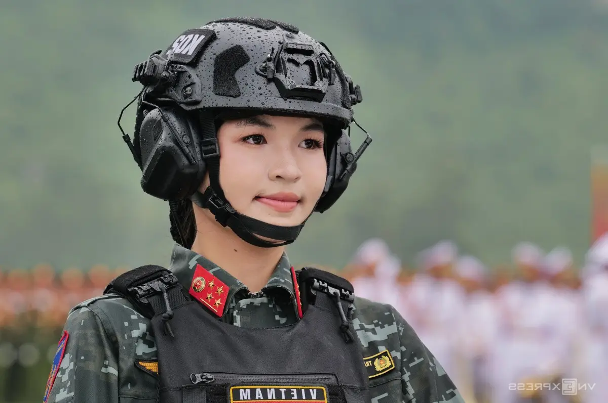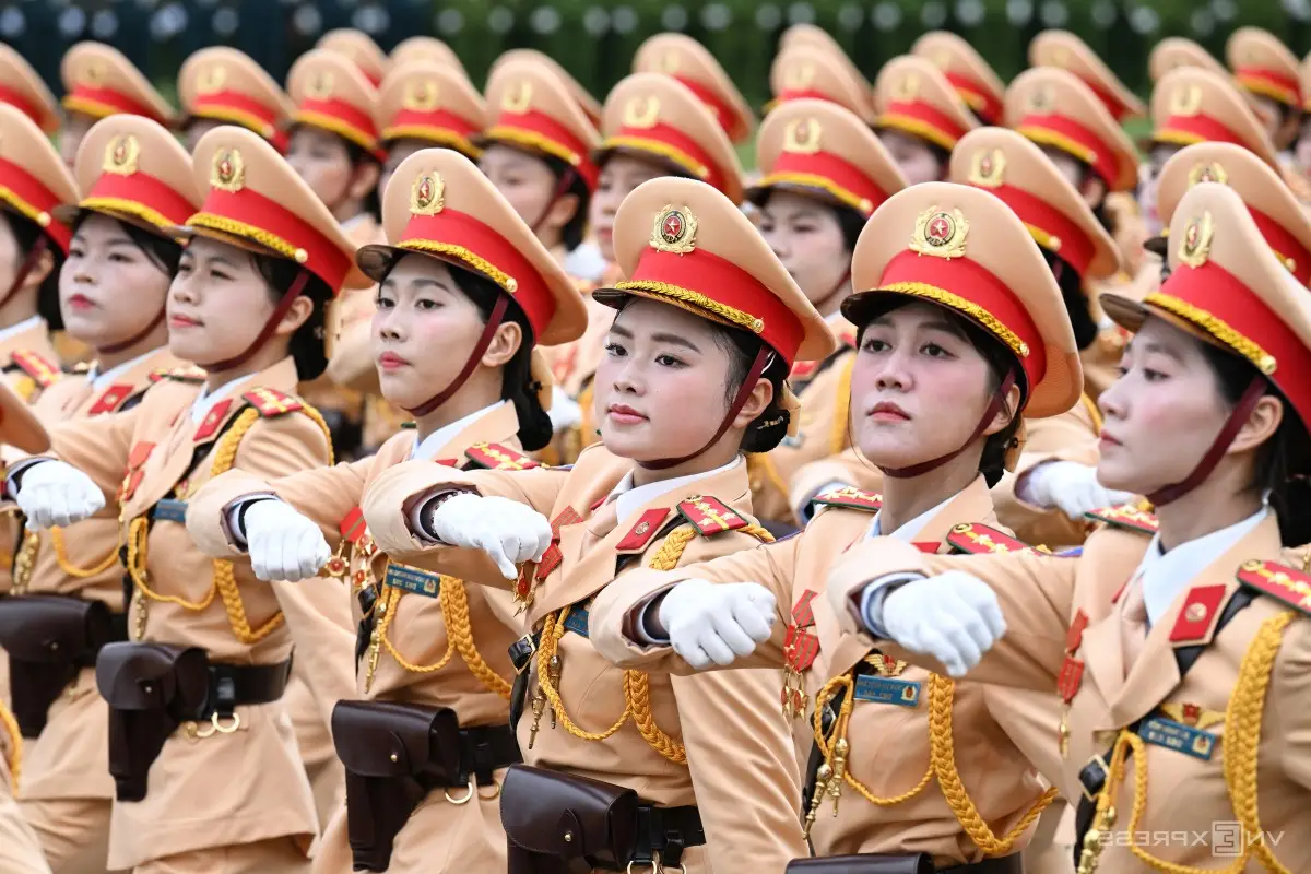 This stunning image captures a powerful moment of Vietnamese female soldiers during their parade rehearsal. Dressed in camouflage uniforms, serious combat helmets, and characteristic gear, they march in perfect unison, radiating a strong sense of discipline and high readiness. Each firm step and determined gaze reflects their unwavering will, national pride, and profound responsibility as soldiers. This is more than just a training session; it is a vivid symbol of the strength, proud beauty, and silent dedication of women in the military. This inspiring scene evokes patriotism and trust in Vietnam's robust armed forces, contributing to the nation's peace and security.