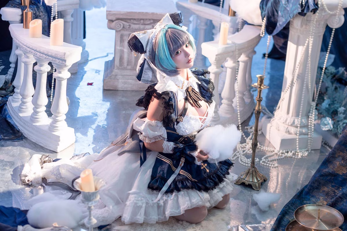 This stunning image features coser Chunmomo in a captivating cosplay transformation. She embodies a character adorned in an exquisite costume reminiscent of gothic or maid styles highlighted by intricate lace ruffles and harmonious colors. Her unique two-toned hair with a striking vibrant blue streak immediately catches the eye. Chunmomo exudes a gentle aura and alluring beauty through her gaze and graceful pose. The cosplay not only showcases meticulous craftsmanship but also enhances her natural charm and exceptional ability to portray the character. This particular image is part of her self-portrait collection Part01 promising many more impressive moments.