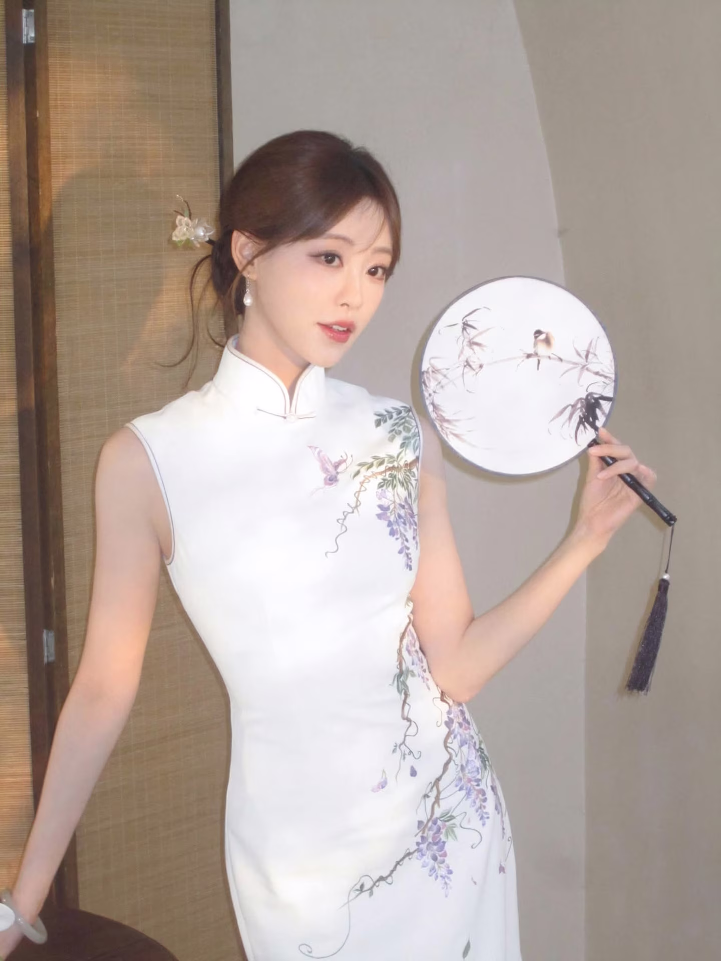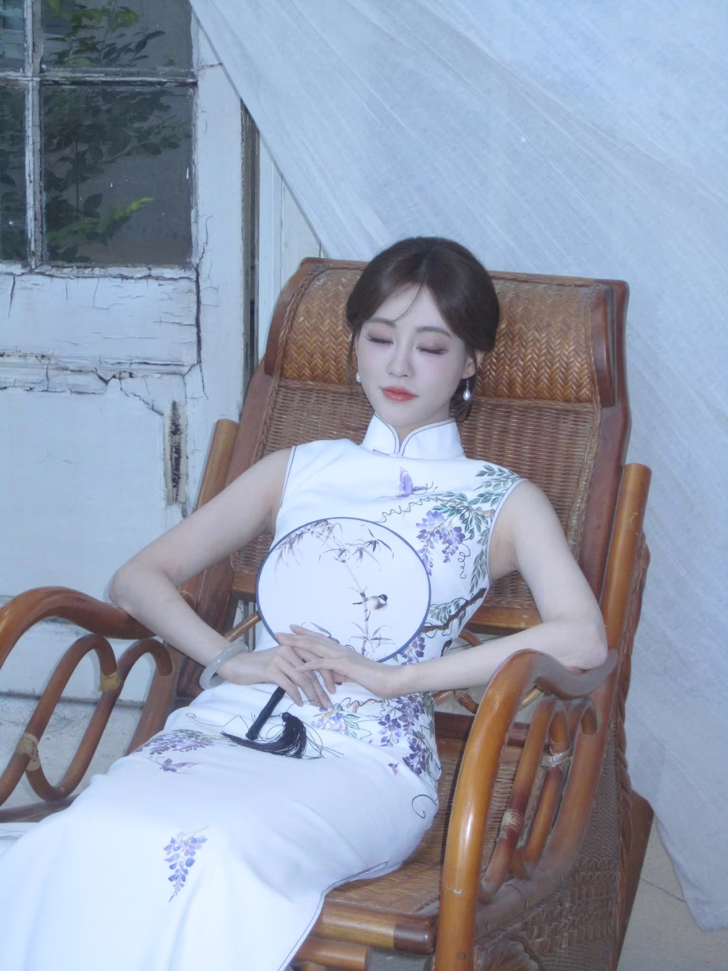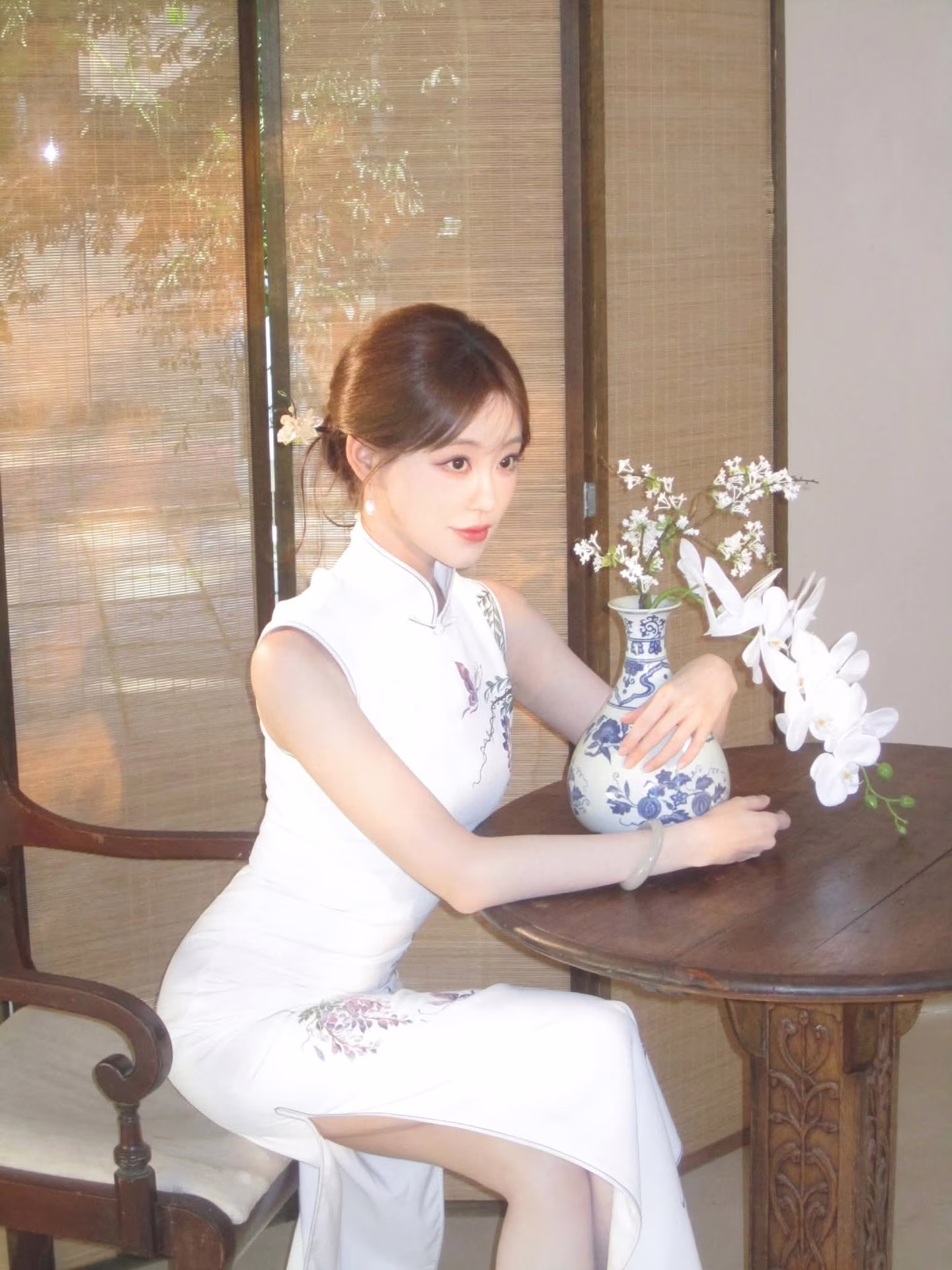 This captivating image beautifully portrays an enchanting and elegant Asian beauty. The woman, adorned in a pristine white cheongsam with subtle embroidery, exudes grace and sophistication. Her delicate posture, gently touching a classic blue and white porcelain vase filled with pure white flowers, creates a serene and poetic scene. The traditional charm is accentuated by her attire and the timeless setting, evoking a sense of refined Asian culture. Every detail, from her neatly styled hair and delicate earrings to her contemplative gaze, contributes to a perfect portrait that captivates the viewer, stirring deep emotions for a beauty that transcends time and trends.