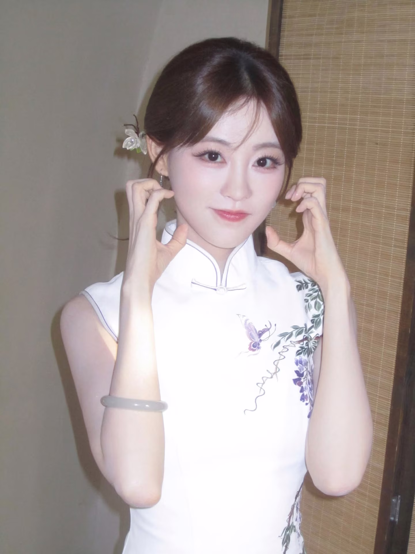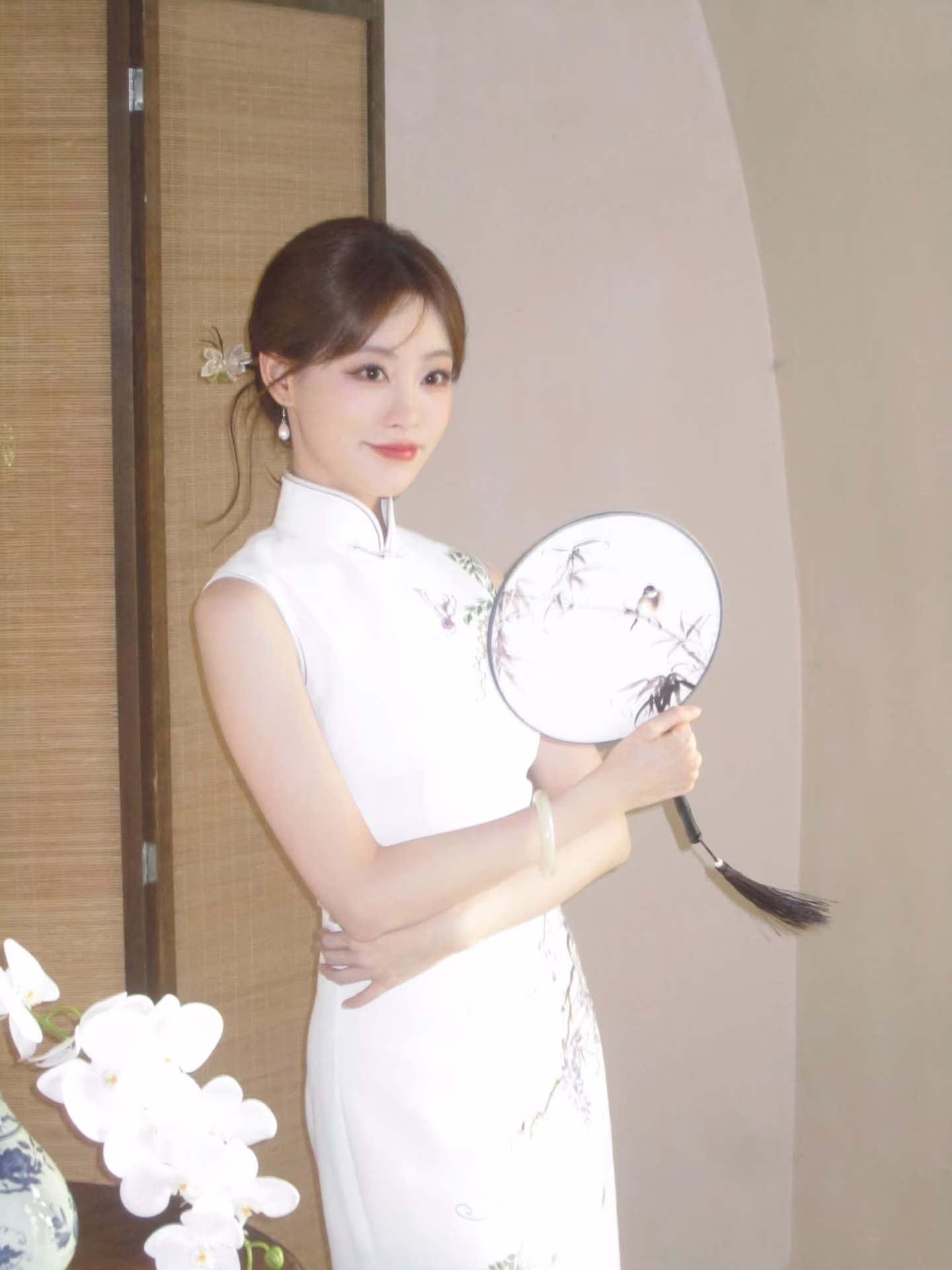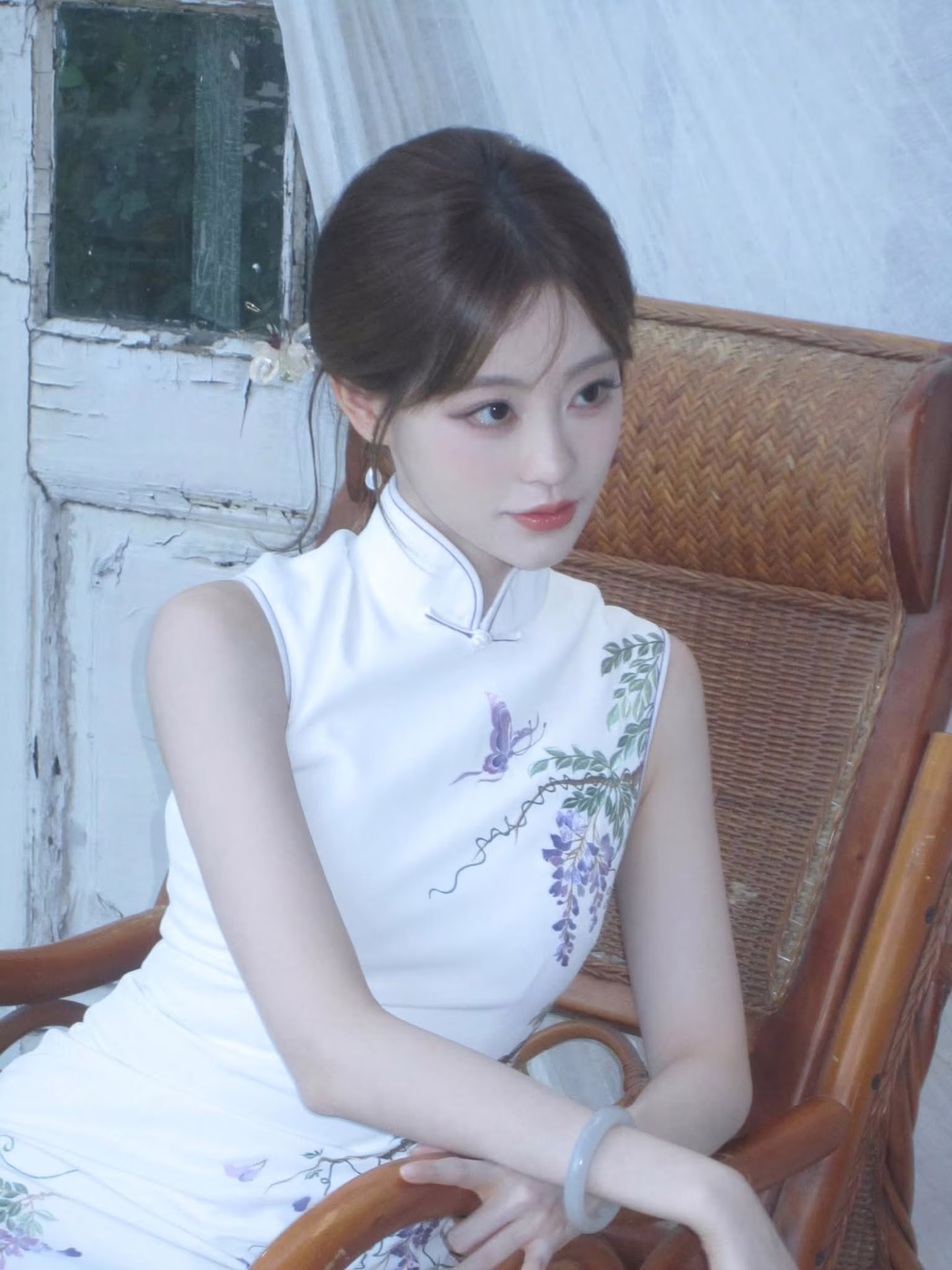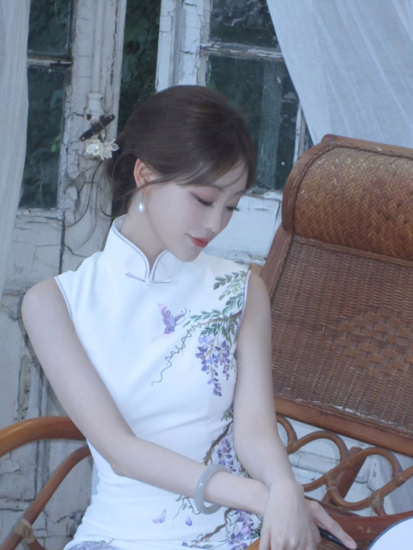 This captivating image beautifully portrays an enchanting and elegant Asian beauty. The woman, adorned in a pristine white cheongsam with subtle embroidery, exudes grace and sophistication. Her delicate posture, gently touching a classic blue and white porcelain vase filled with pure white flowers, creates a serene and poetic scene. The traditional charm is accentuated by her attire and the timeless setting, evoking a sense of refined Asian culture. Every detail, from her neatly styled hair and delicate earrings to her contemplative gaze, contributes to a perfect portrait that captivates the viewer, stirring deep emotions for a beauty that transcends time and trends.