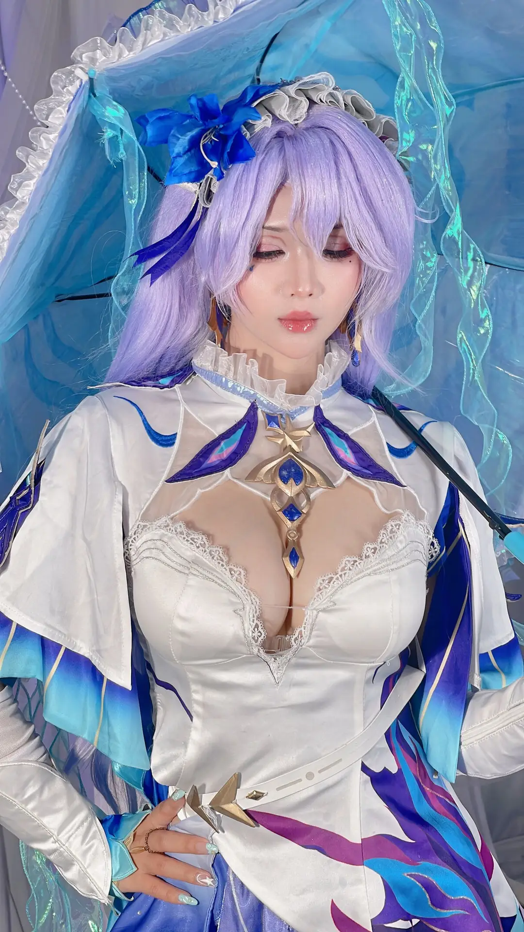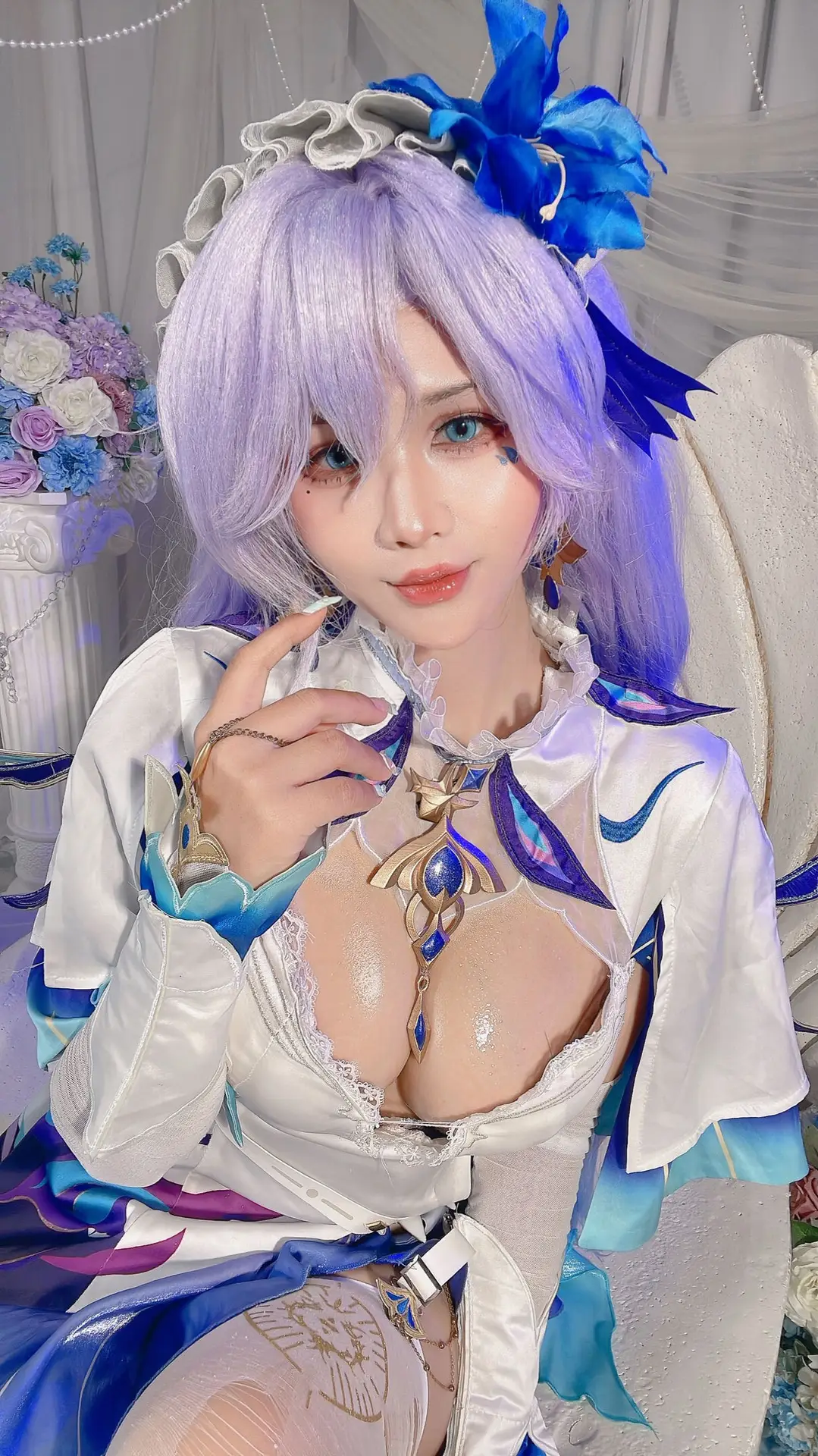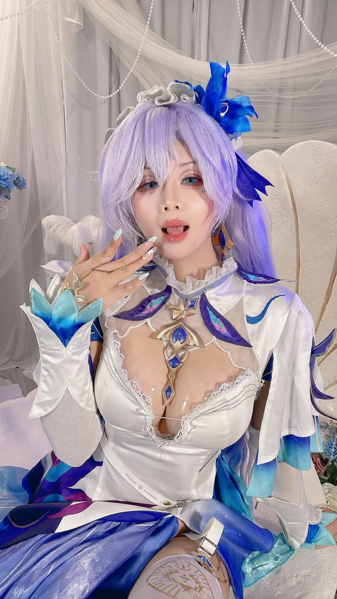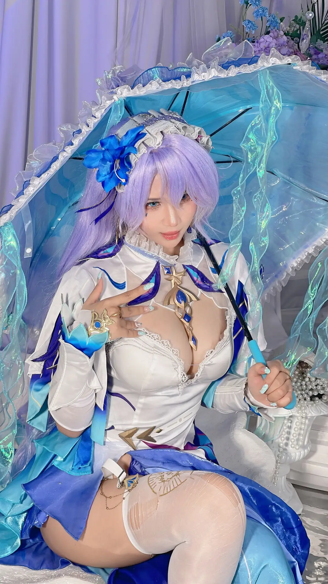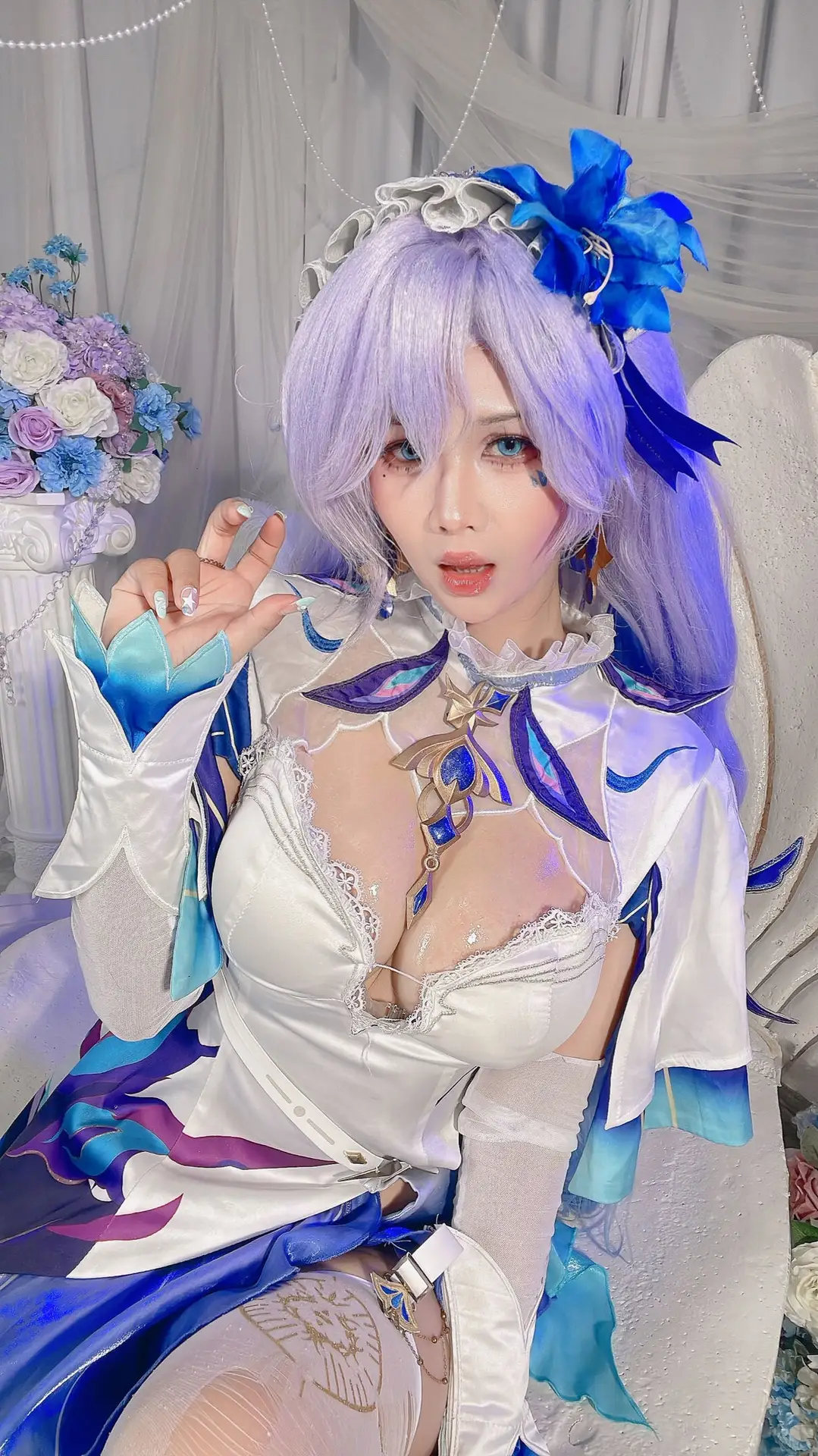 In this captivating image cosplayer Pyon masterfully embodies Cantarella from the game Wuthering Waves. Cantarella emerges with flowing lavender hair and mesmerizing blue eyes exuding an irresistible charm. The pristine white and ethereal blue costume is meticulously designed highlighting her graceful figure and alluring curves. Intricate blue floral details in her hair and sparkling gold accessories around her neck further accentuate the character's opulent and elegant beauty. Pyon's gaze radiates confidence mixed with a touch of mystery making it impossible for viewers to look away. This is truly a remarkable cosplay offering an authentic and vibrant portrayal of Cantarella within the Wuthering Waves universe.#CantarellaCosplay #WutheringWaves #CoserPyon #GameCosplay #AnimeCosplay
