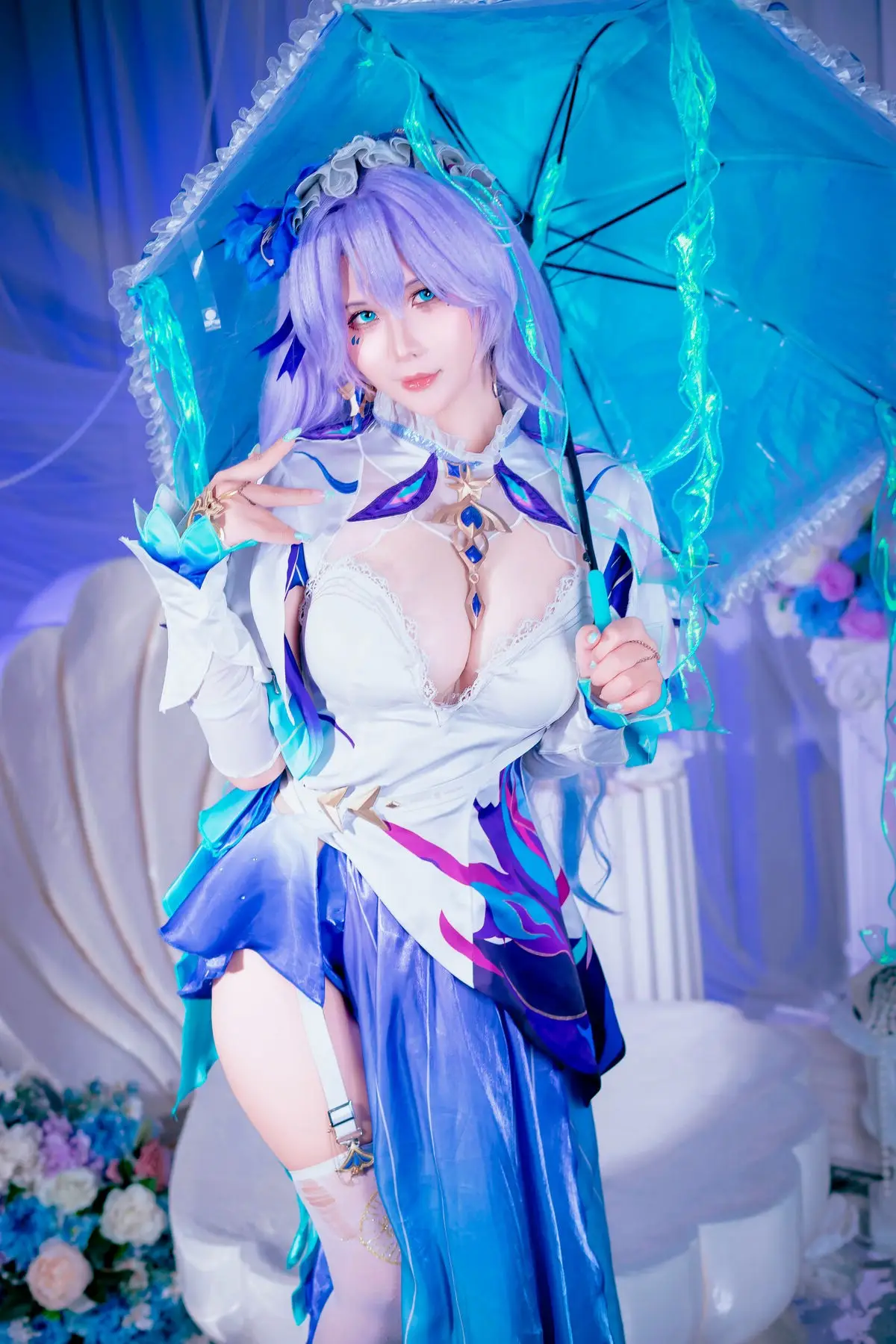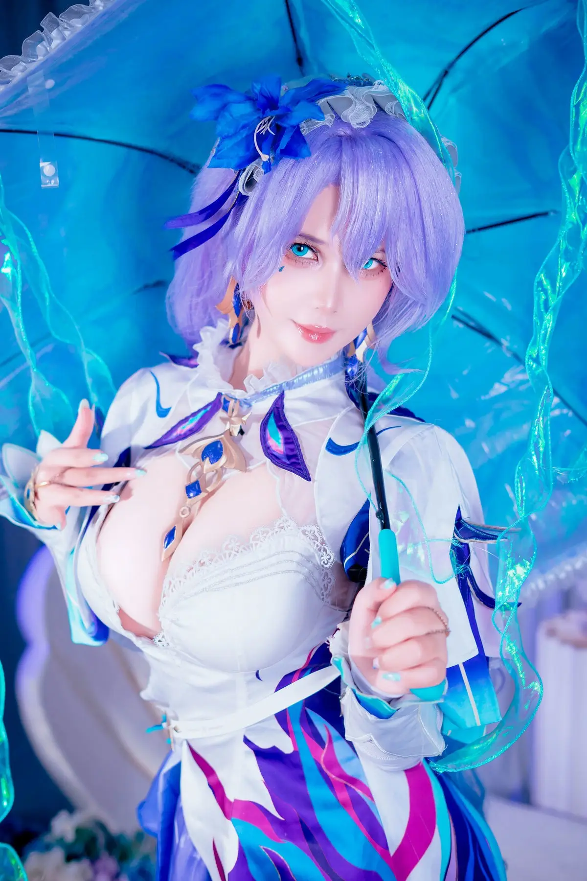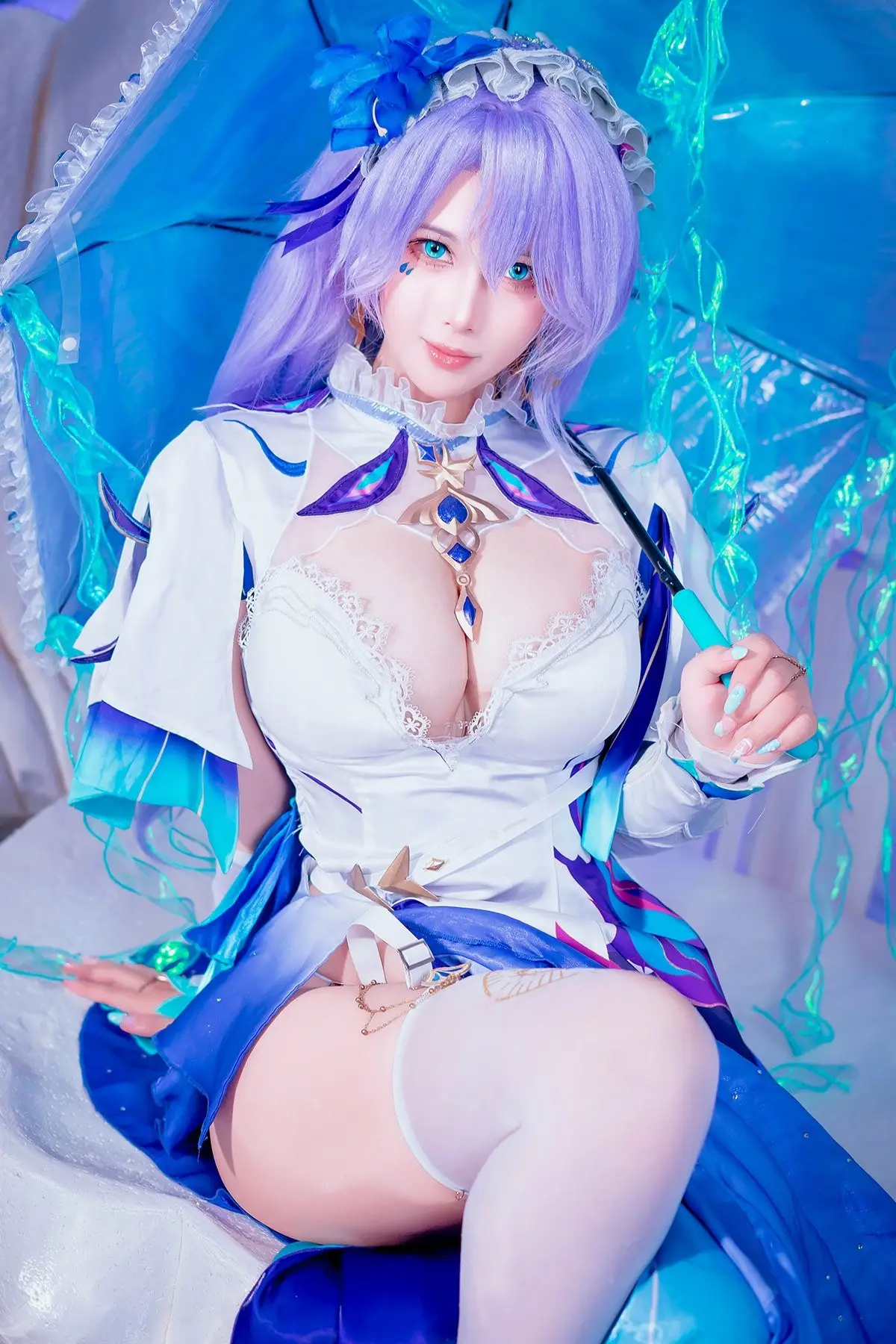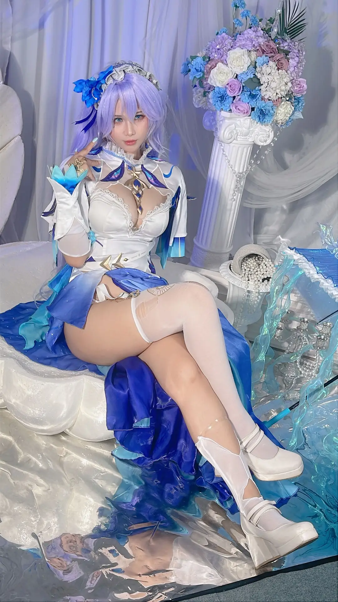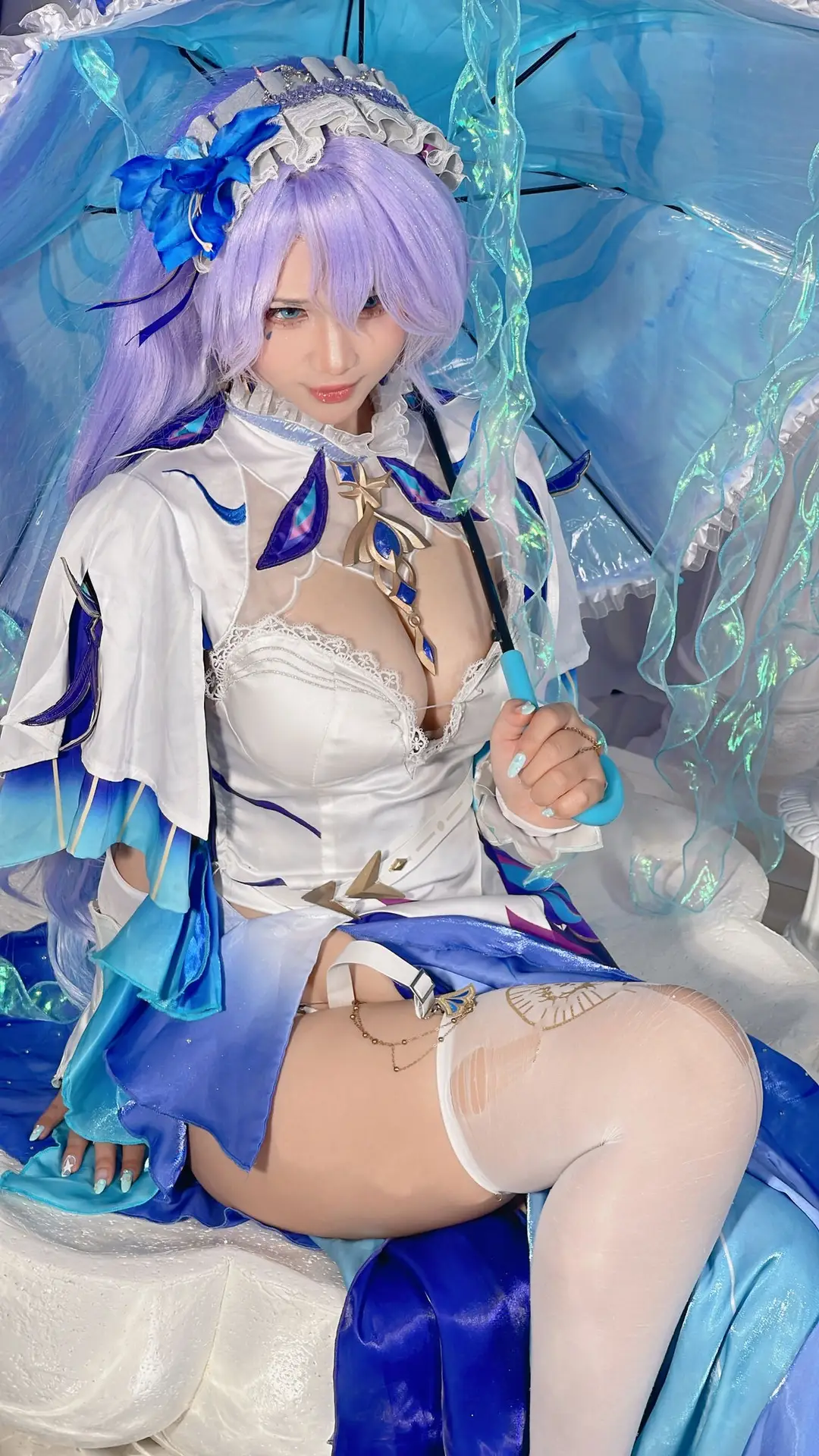 In this captivating image cosplayer Pyon masterfully embodies Cantarella from the game Wuthering Waves. Cantarella emerges with flowing lavender hair and mesmerizing blue eyes exuding an irresistible charm. The pristine white and ethereal blue costume is meticulously designed highlighting her graceful figure and alluring curves. Intricate blue floral details in her hair and sparkling gold accessories around her neck further accentuate the character's opulent and elegant beauty. Pyon's gaze radiates confidence mixed with a touch of mystery making it impossible for viewers to look away. This is truly a remarkable cosplay offering an authentic and vibrant portrayal of Cantarella within the Wuthering Waves universe.#CantarellaCosplay #WutheringWaves #CoserPyon #GameCosplay #AnimeCosplay