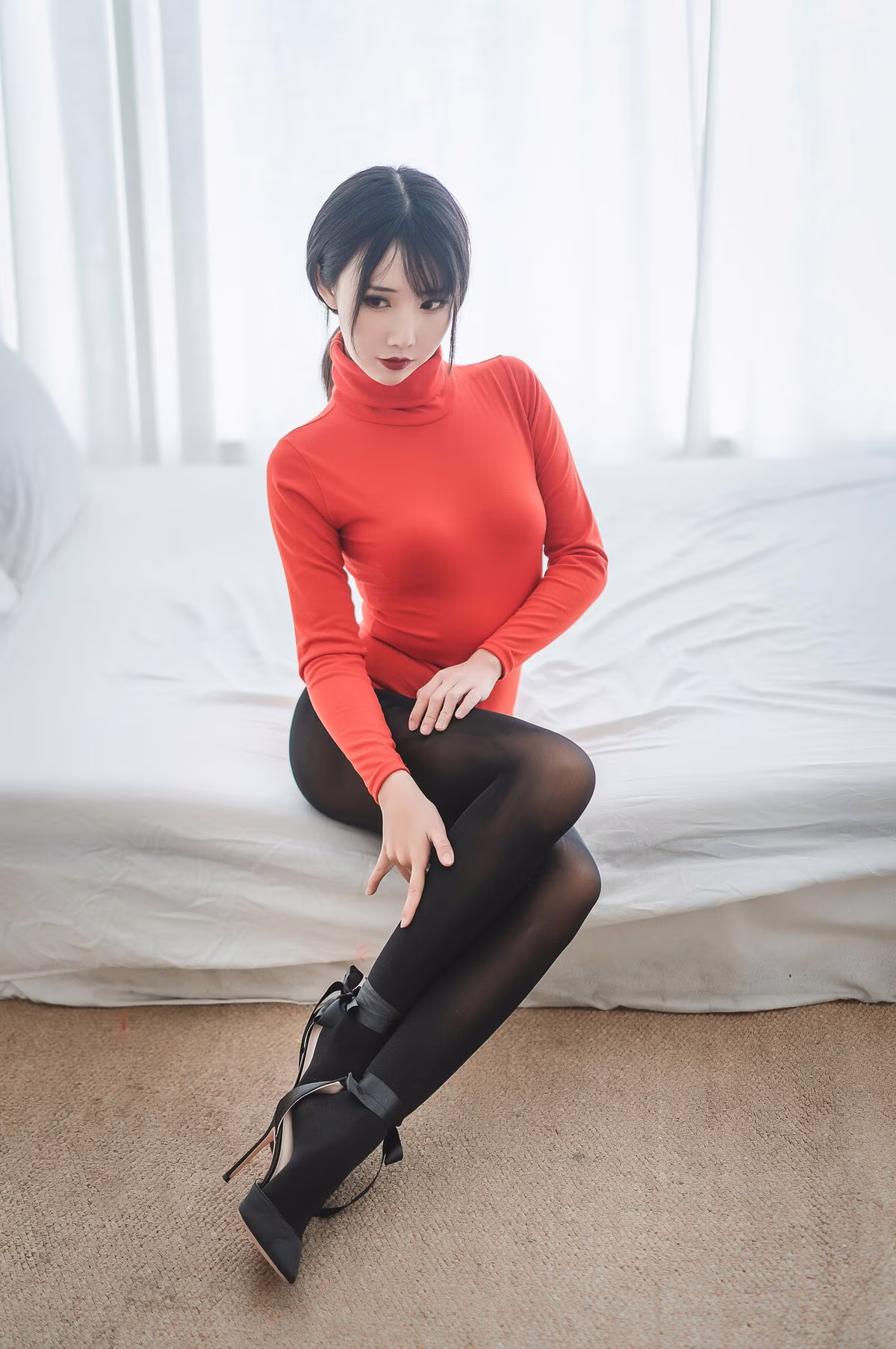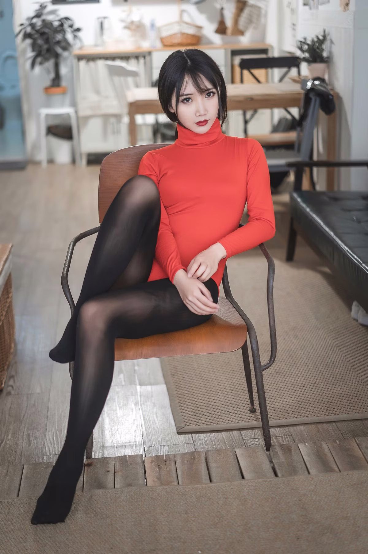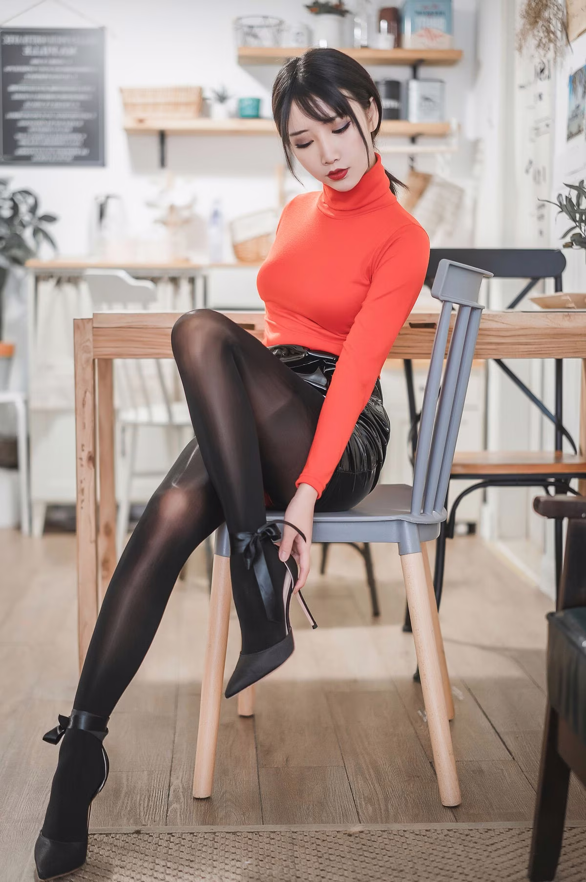 Coser Mian Bing Xian Er exudes captivating charm in an ensemble perfectly blending elegance and edgy style. Her vibrant red turtleneck sweater beautifully highlights her radiant complexion and slender physique. Paired with a glossy black faux leather skirt, it creates a striking contrast and embodies contemporary fashion. Her long graceful legs are subtly showcased through sheer black pantyhose complemented by stylish high heels lending an irresistible allure. With her enchanting gaze and confident posture Mian Bing Xian Er projects a professional aura transforming the everyday setting into a sophisticated fashion statement. She truly embodies modern confidence and captivating beauty.