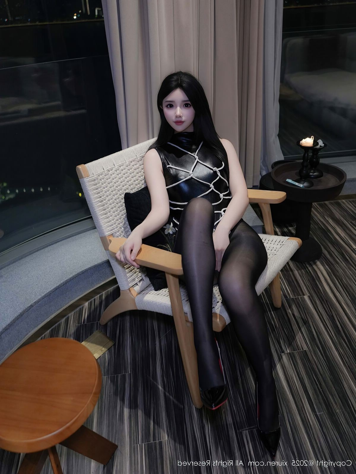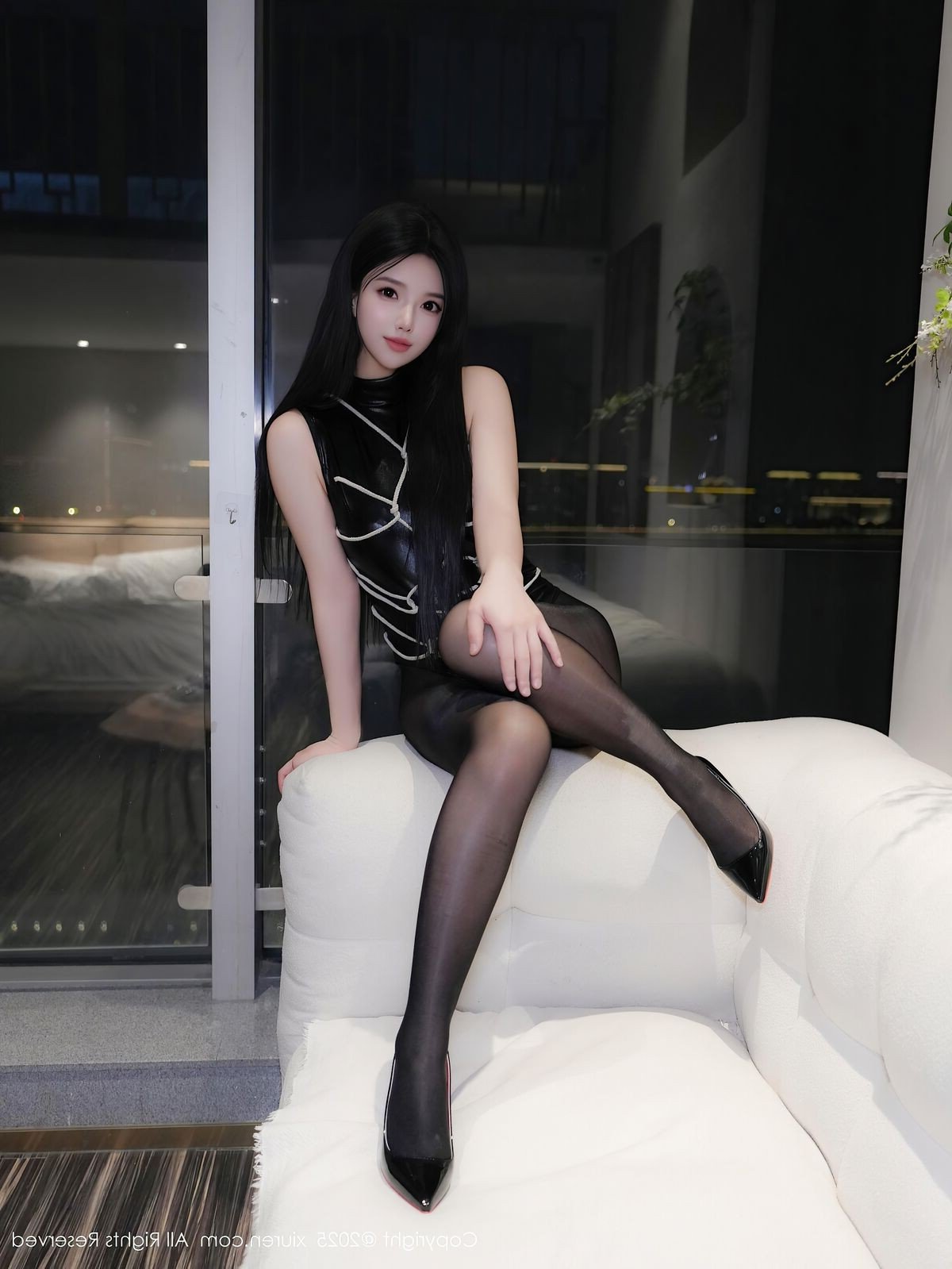 This captivating image showcases model Mu Yan Yan Yan Jiang in a stunning and alluring style from the XiuRen No.10299 collection. She exudes an air of elegant confidence, dressed in a sleek black sleeveless dress adorned with unique chain detailing. Her long, slender legs are accentuated by sheer black stockings and sharp pointed high heels, creating a cohesive and sophisticated ensemble. With her magnetic gaze and poised demeanor, Mu Yan Yan Yan Jiang not only embodies modern fashion but also projects an irresistible charm. The blurred city lights visible through the window in the background add a touch of urban glamour, elevating this into a high-fashion moment that powerfully asserts her strong and captivating personal style.
