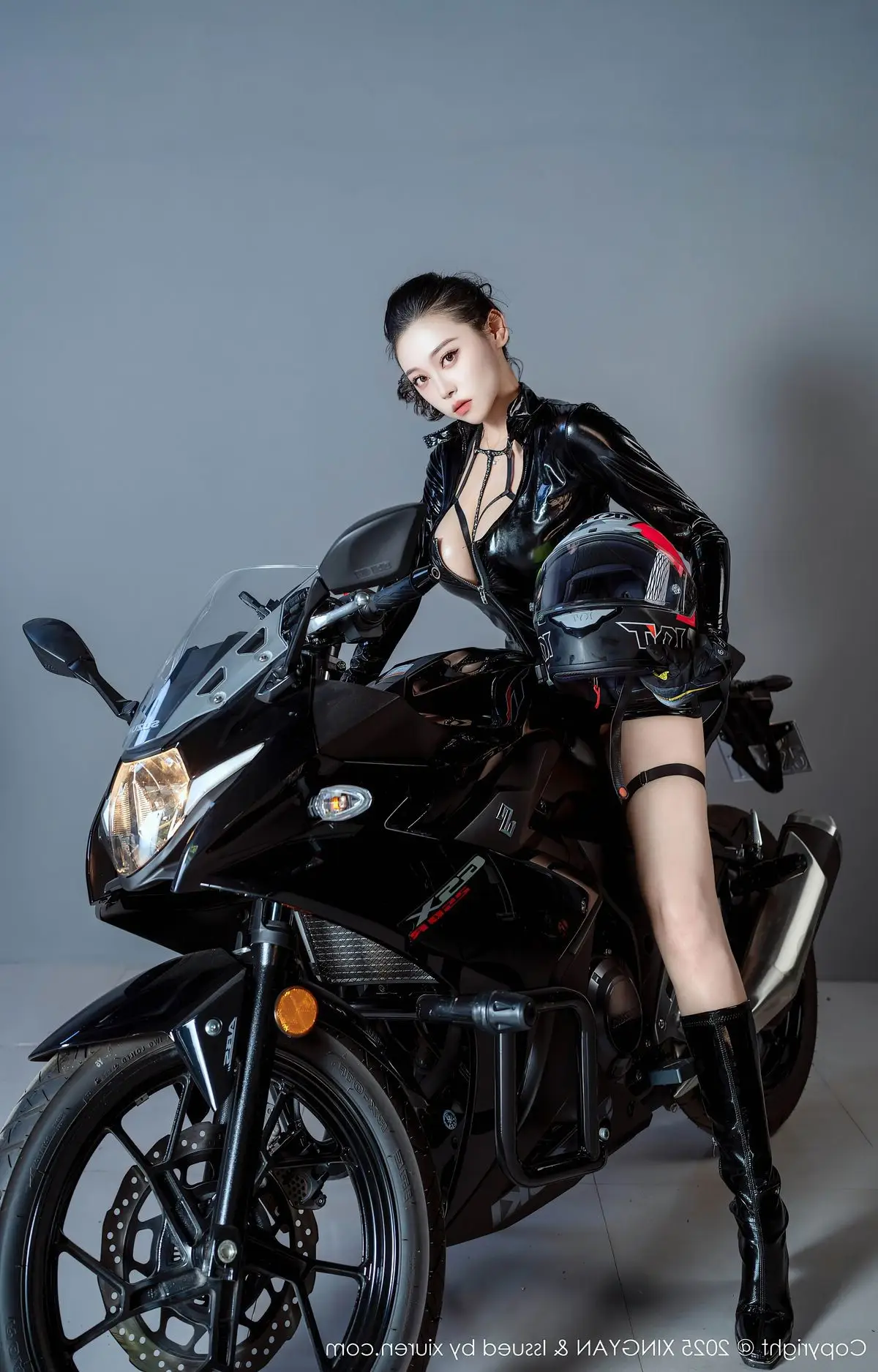 In this XingYan Star Face Vol.378 collection Qing Miao radiates captivating beauty and strong personality. She dons a sleek form-fitting black leather outfit highlighting her perfect figure. Every detail from the long gloves to the exquisite tailoring contributes to a powerful and seductive biker woman image. Her confident pose and sharp gaze while leaning on the powerful motorcycle further emphasize Qing Miao's alluring charisma. She is not just a model but also an emblem of modern freedom and contemporary style igniting curiosity and admiration from viewers. This is truly an impressive display showcasing Qing Miao's class and irresistible charm.