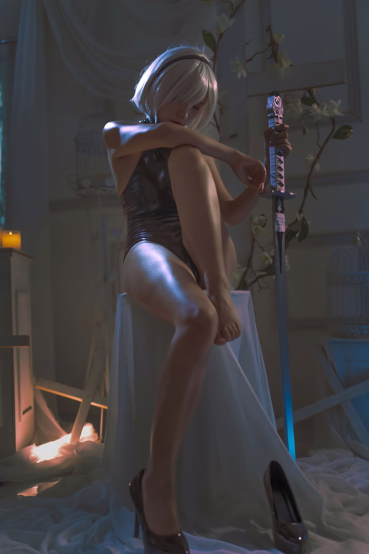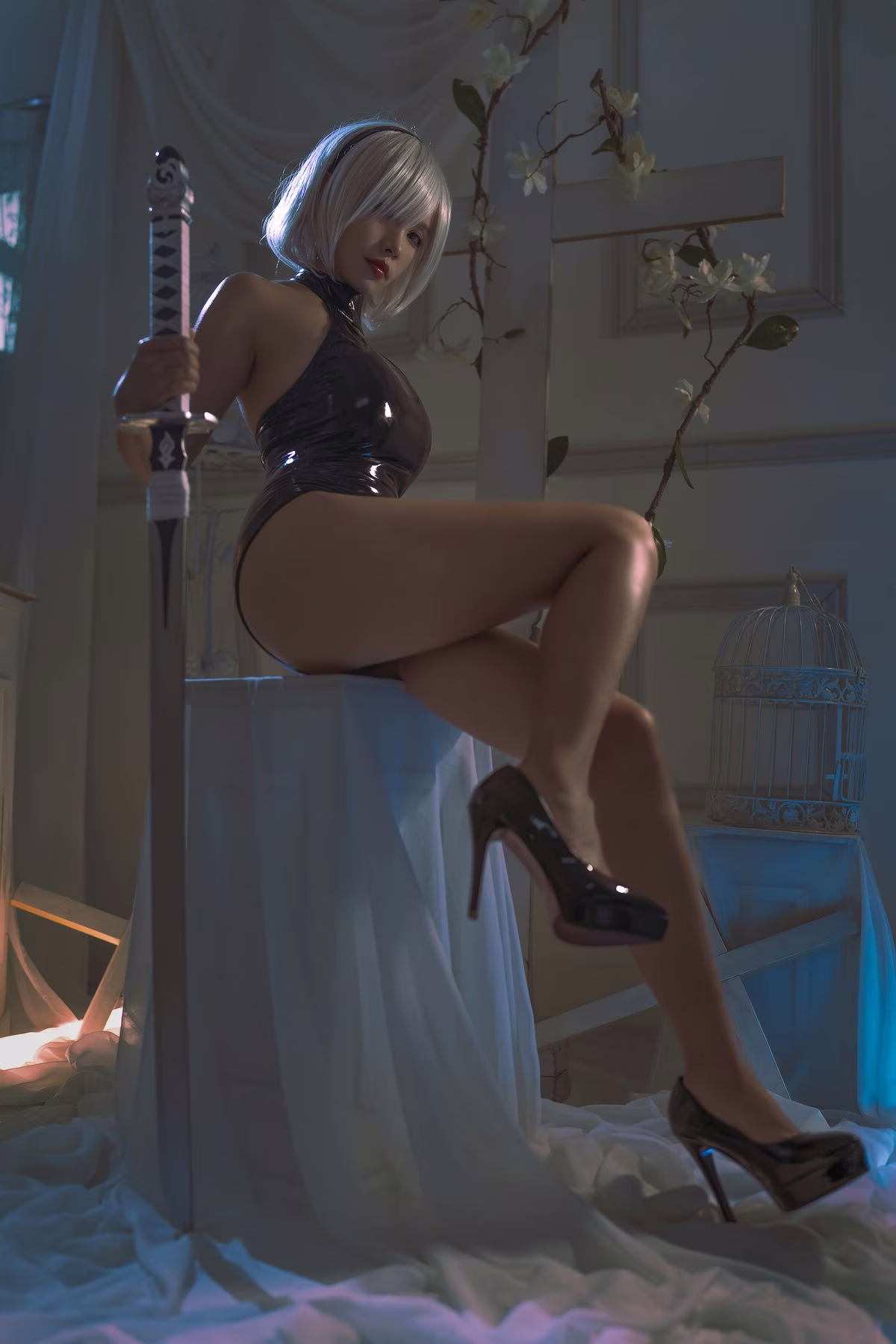 Coser Neko薇薇 delivers a striking and enigmatic portrayal in this captivating image. Adorned in a sleek, dark form-fitting outfit, complemented by her distinctive platinum blonde hair and eye-covering blindfold, Neko薇薇 exudes an aura of resilience and allure. Her stable kneeling pose, with both hands firmly gripping a large sword, conveys the intense focus and hidden strength of a formidable warrior. The dimly lit setting, enhanced by soft white fabric on the floor, accentuates her compelling demeanor, crafting an artistic photograph rich in depth. Viewers are drawn in by the perfect synergy of physical beauty and powerful presence.