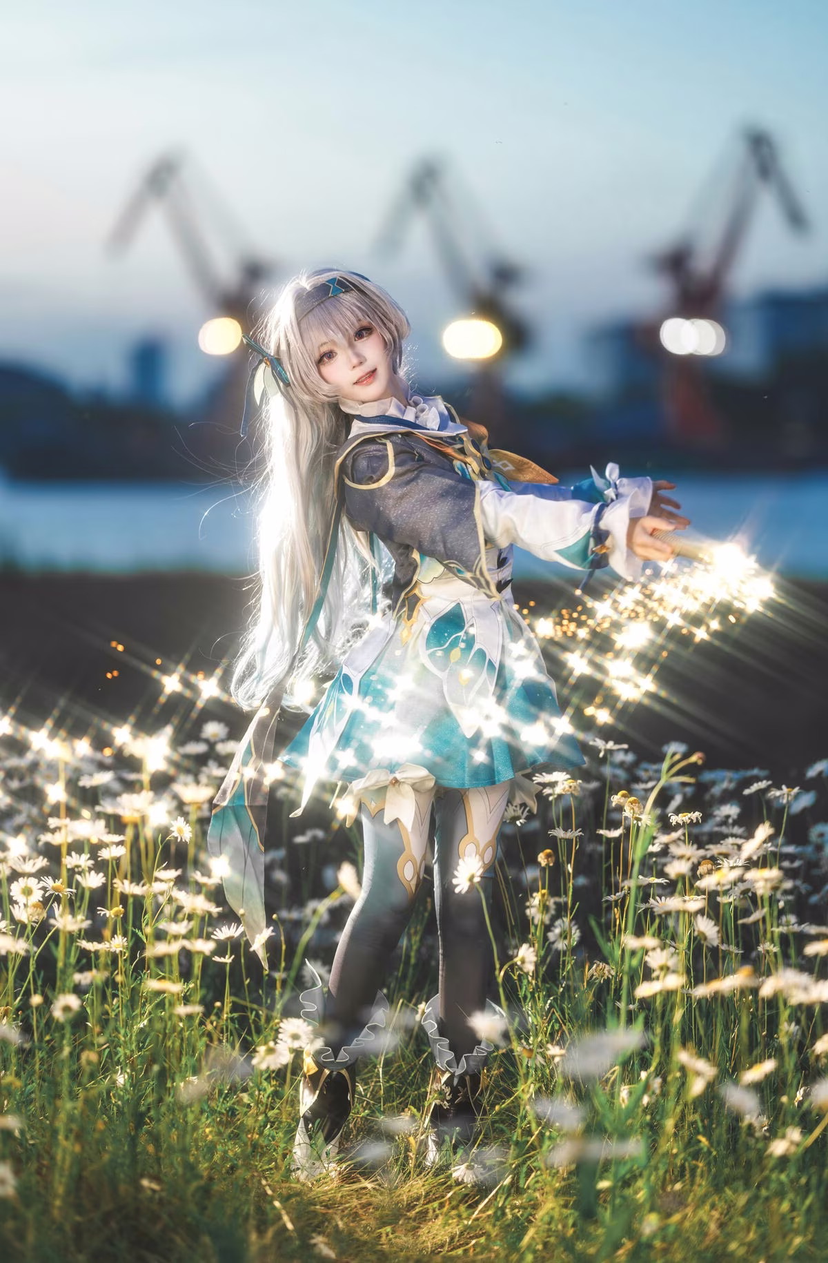 Coser Hana Shichi delivers a mesmerizing portrayal of Firefly from Honkai Star Rail bringing the beloved character to life with exquisite detail. Her meticulously crafted costume and delicate expression perfectly capture Fireflys ethereal charm. Set against a picturesque backdrop of soft white wildflowers bathed in golden light the image radiates a dreamlike serenity. Hana Shichis graceful pose and gentle gaze evoke a sense of peaceful wonder making this a truly captivating rendition. This stunning cosplay masterfully blends the fantasy of Honkai Star Rail with the tranquil beauty of nature inviting admirers into a world of enchanting artistry.