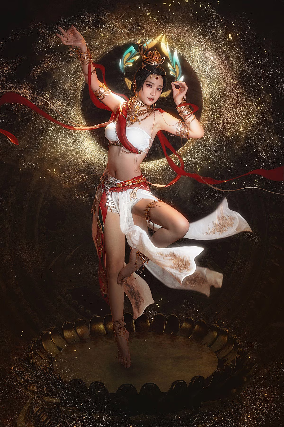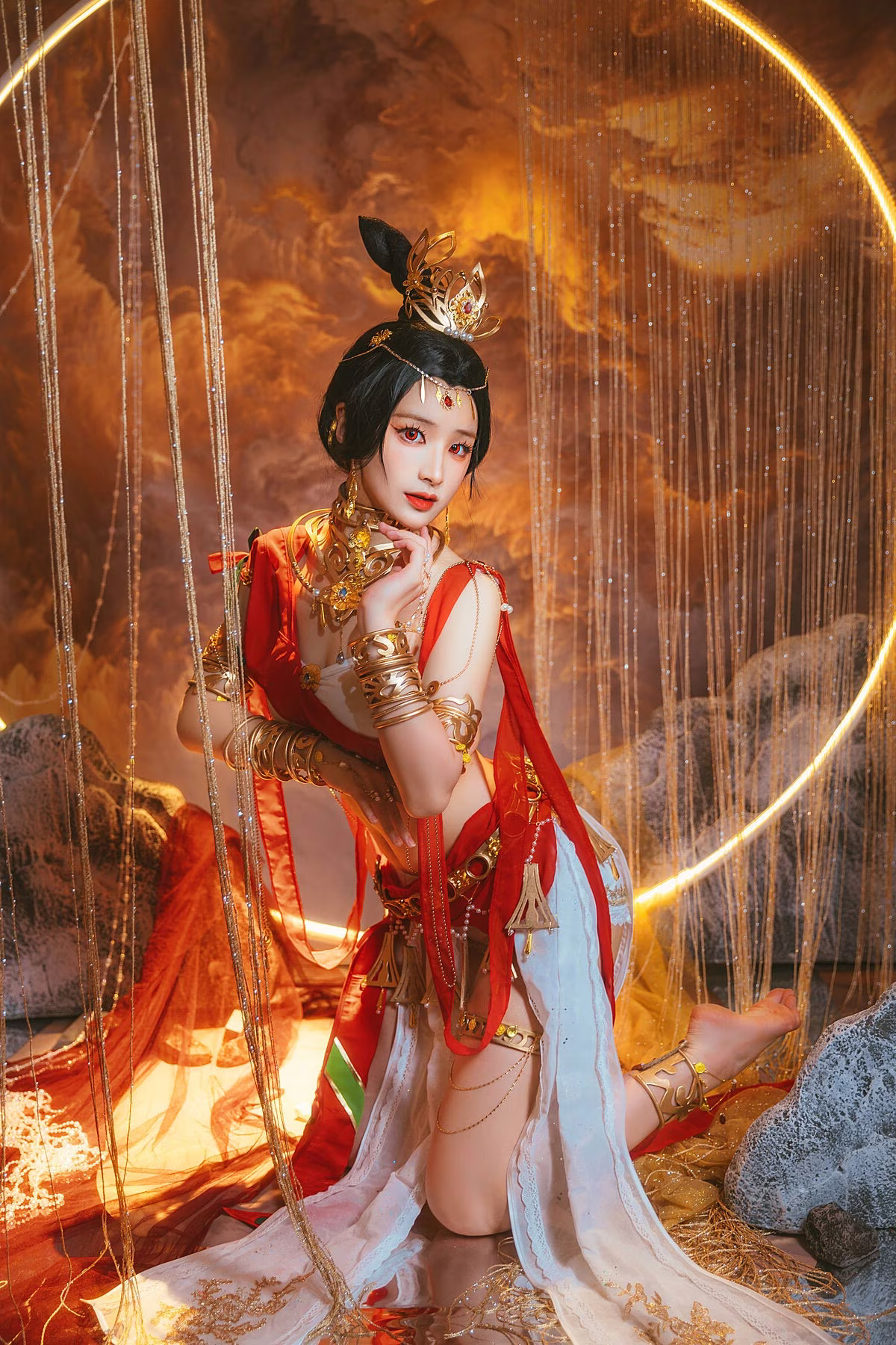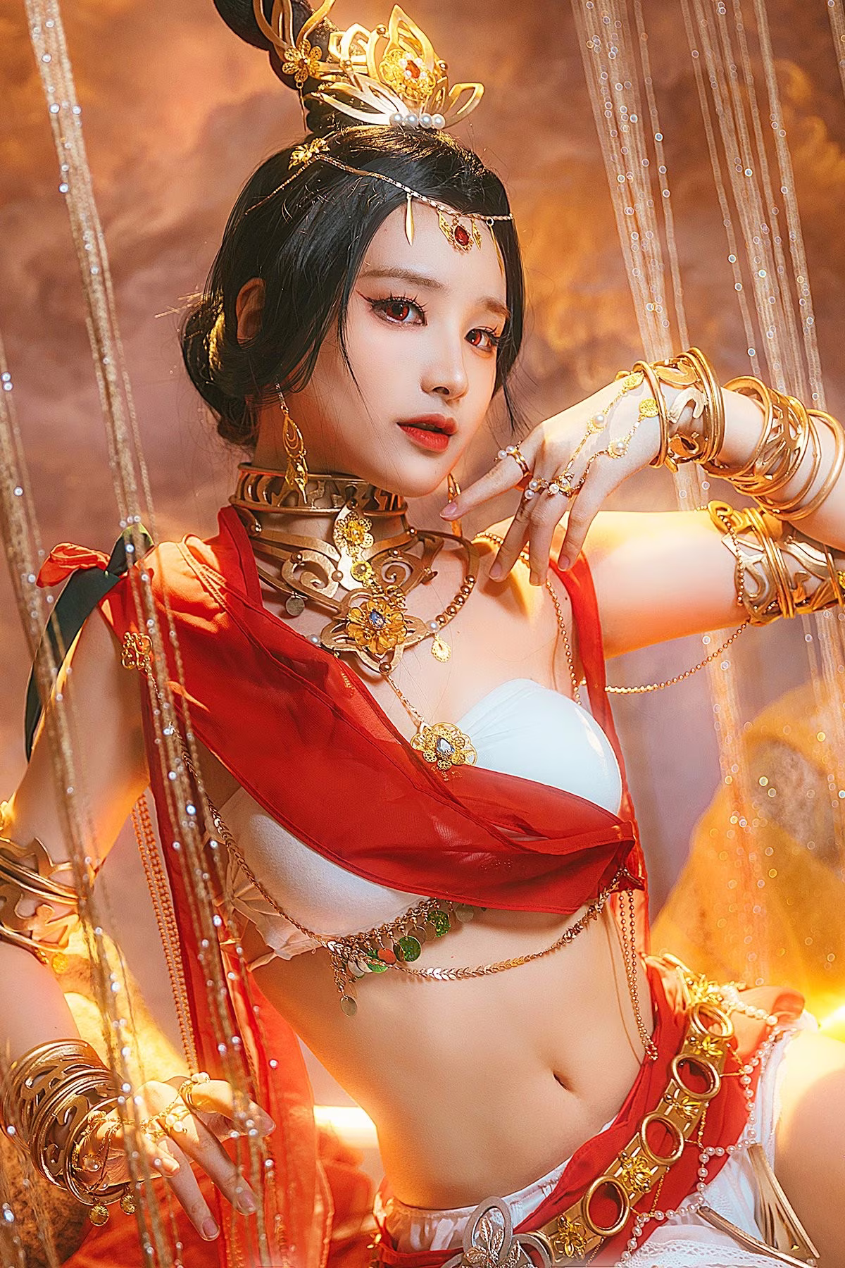 Immerse yourself in a mythical realm with Coser 幼愛Youmeko as she breathtakingly embodies the enchanting 飞天舞姬. This stunning image showcases an opulent costume, a harmonious blend of vibrant red and shimmering gold, accentuating Youmeko's regal beauty and alluring silhouette. Every detail, from the intricate hair accessories to the exquisite jewelry, reflects meticulous artistry in this cosplay masterpiece. Set against a mystical backdrop bathed in warm, golden light, Youmeko transcends her role as a mere Coser, becoming a celestial maiden descended from the heavens, captivating viewers with her divine grace and magnetic presence. Her subtle expressions and confident aura breathe life into the character, creating an irresistibly compelling work of art that leaves an unforgettable impression.