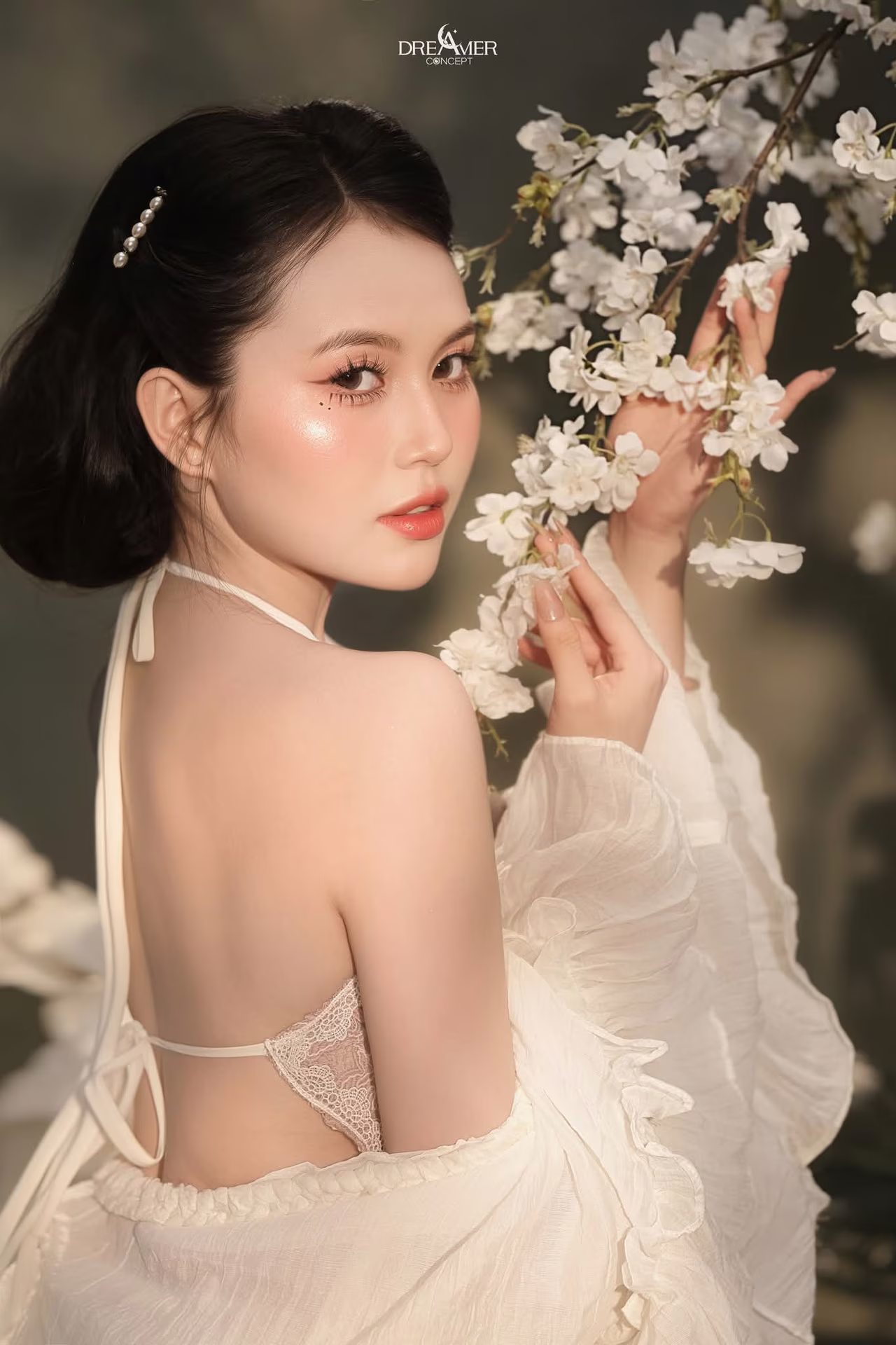 This stunning photograph features a Vietnamese woman adorned in a sophisticated, modern interpretation of the traditional Ao Yem, paired with a flowing silk skirt. She emanates a gentle, elegant, and noble beauty, evoking timeless traditional values while maintaining a contemporary appeal. Holding a delicate fan and with her hair neatly styled, she poses gracefully amidst a classic setting adorned with pristine white flowers and exquisitely carved wooden furniture. This artistic photograph deeply conveys an Oriental aesthetic, showcasing a harmonious blend of traditional charm and modern essence, captivating the viewer with its serene elegance. #Vietnamese #pretty #charm