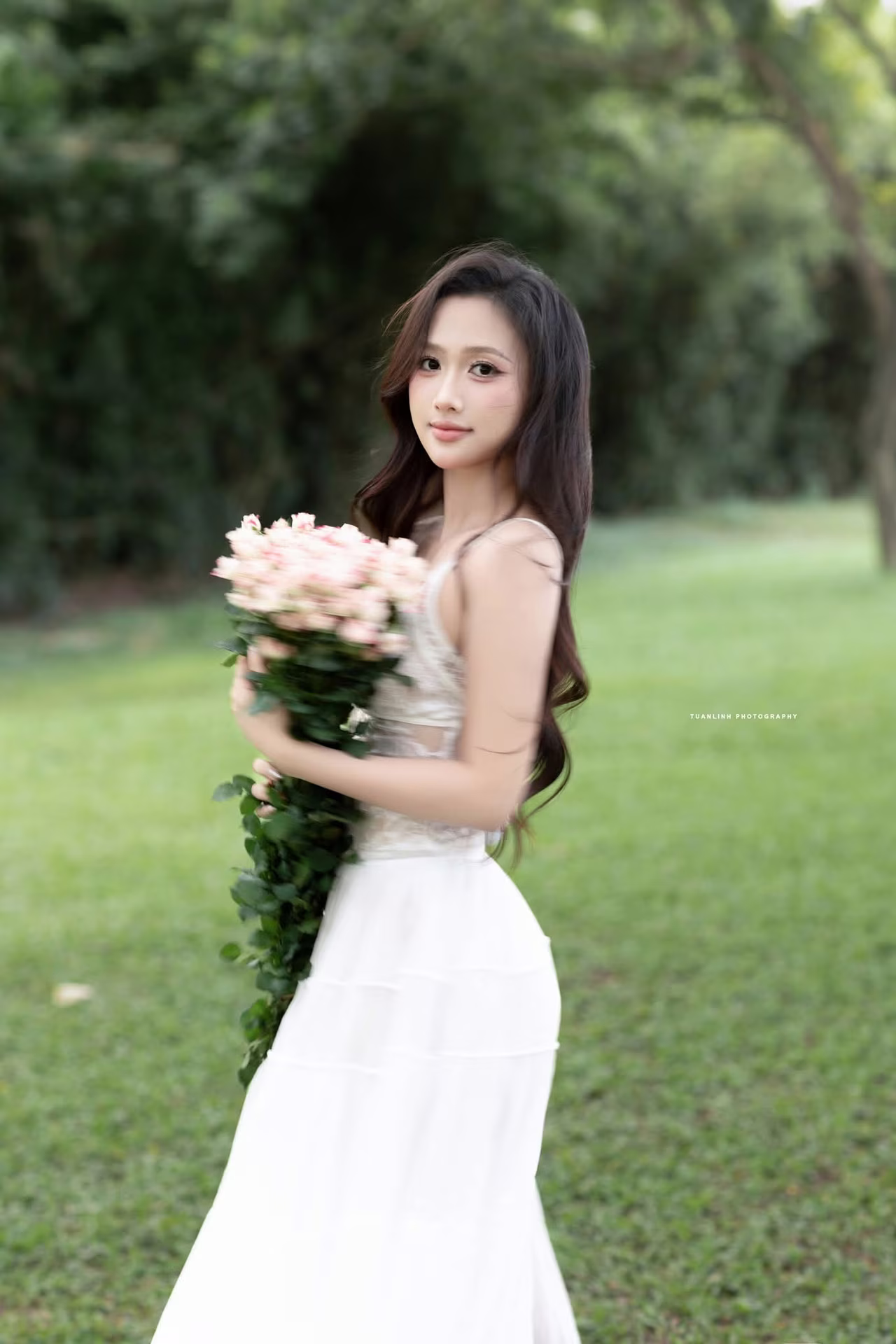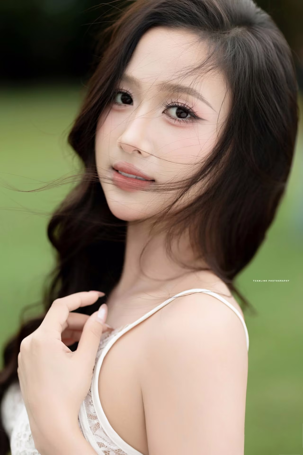 This photograph beautifully captures the pure and gentle charm of a Vietnamese young woman. She possesses long, smooth black hair flowing naturally, highlighting her elegant oval face and sweet smile. Dressed in a delicate white lace dress, she sits gracefully on a lush green lawn, creating a harmonious and poetic scene. Her eyes reflect an innocent, dreamy gaze, as if lost in the peaceful ambiance of nature. This portrait not only showcases her physical attractiveness but also radiates grace and elegance, offering viewers a sense of calm and allure. It is an image that embodies youthfulness, innocence, and the timeless beauty of Vietnamese women. #Vietnamese #pretty #charm