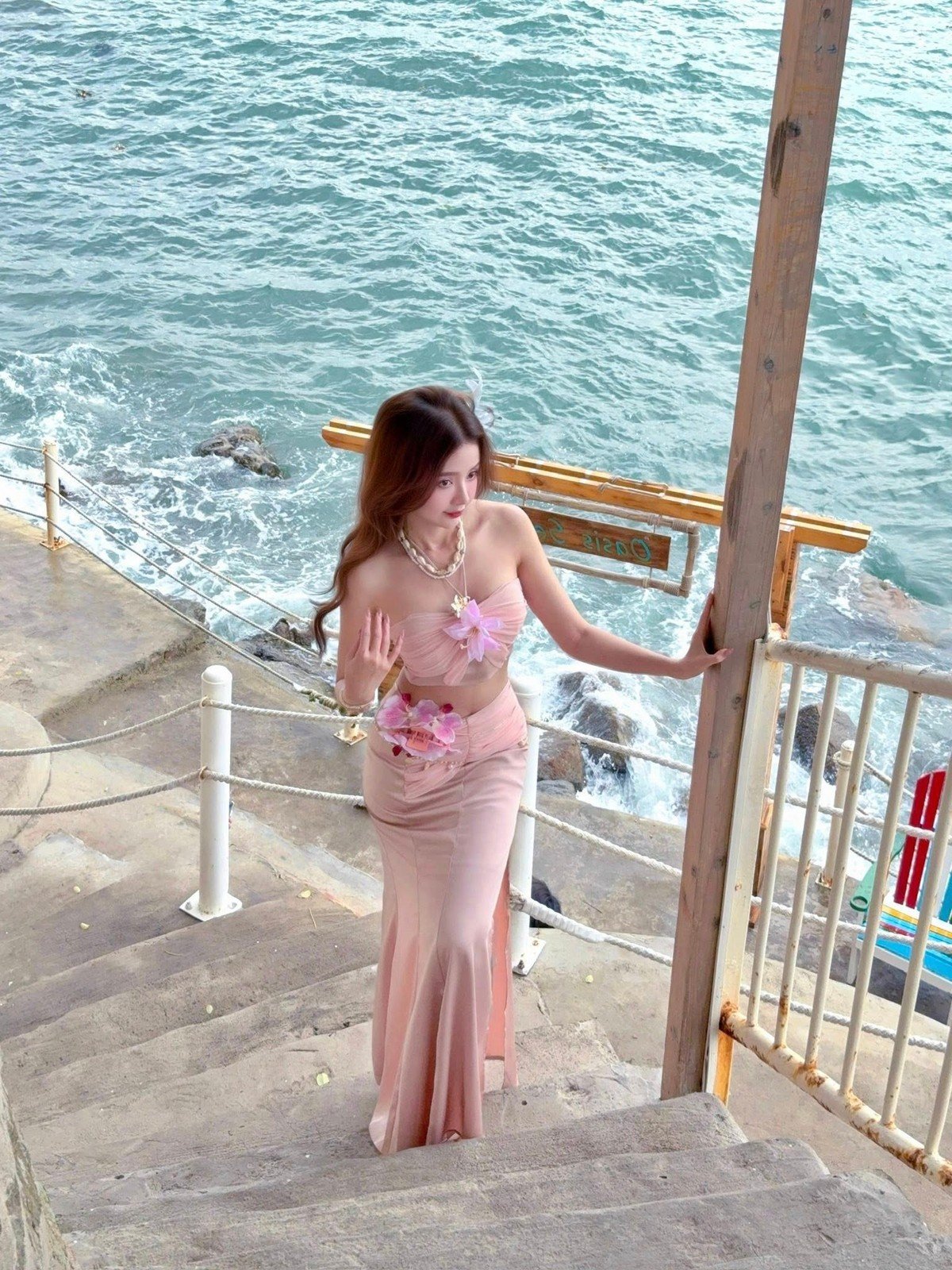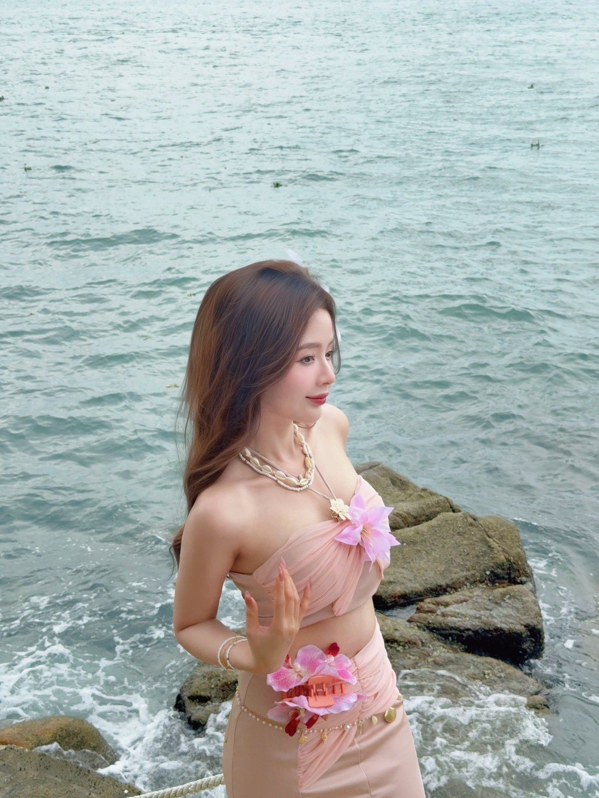 Le Ly Lan Huong the ID photo hot girl who once caused a stir now appears with a completely new image She showcases her seductive beauty and captivating beach style on the shore Her pastel pink outfit with delicate floral details enhances her alluring figure This image reveals a confident transformation from an innocent look to a bold and elegant lady Le Ly Lan Huong truly captivates viewers with her sophisticated aura and unique beach fashion sense She is enjoying a relaxing moment by the blue sea This is a testament to her personal growth and confidence in her personal style