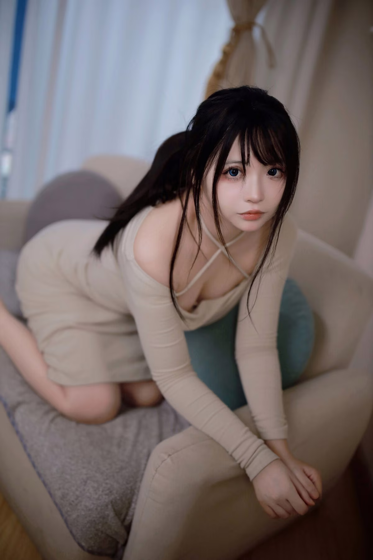 In this Coser Feng Mao Ss Goodnight photoshoot the model Feng Mao Ss transforms into an enchanting figure radiating gentle beauty and allure. She is captured in a soft beige knit dress subtly highlighting her elegant physique and alluring shoulders. Her kneeling pose on the sofa combined with a deep gaze creates a warm and emotionally rich moment. The image not only showcases Coser Feng Mao Ss's professionalism but also conveys a message of comfort and natural beauty within a private setting. This is a sensual and refined piece of photography capturing Feng Mao Ss's unforgettable grace offering a captivating visual experience for viewers.