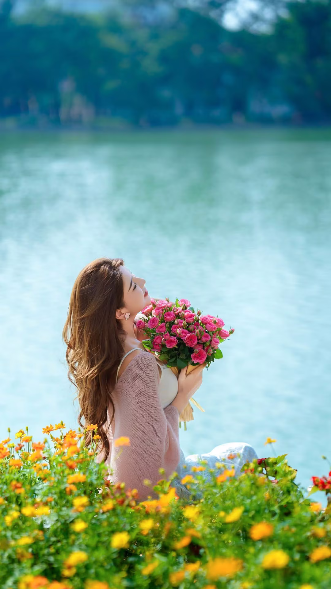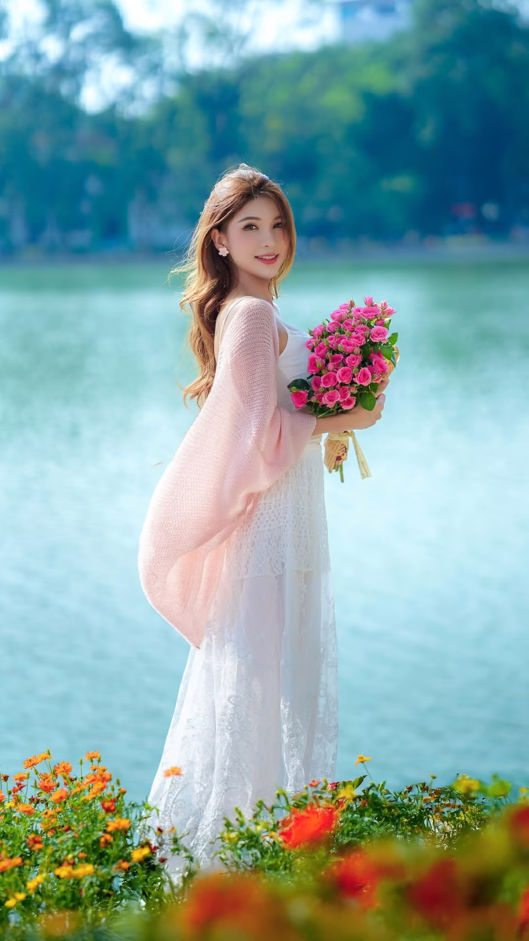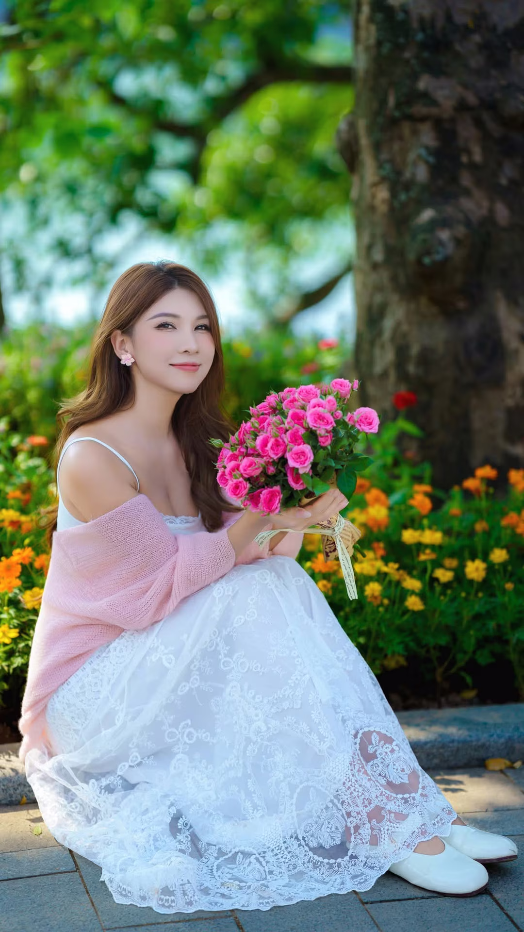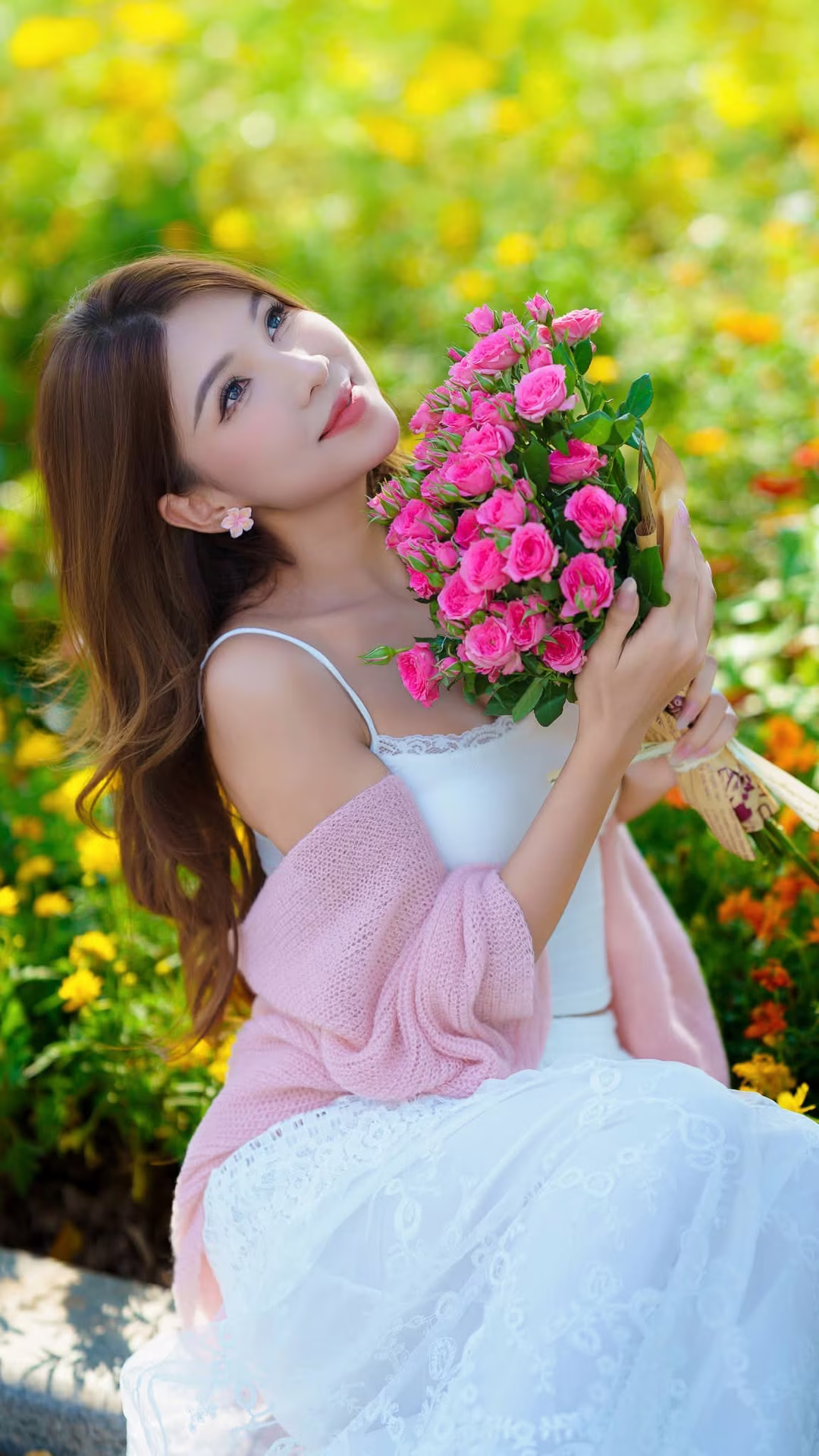 This captivating image features a beautiful young woman whose radiant smile and sparkling eyes convey pure joy She is elegantly dressed in a light pink knitted shrug complementing the charming bouquet of small pink roses she holds delicately in her hands The backdrop is a lush garden scene bursting with shades of pink and green creating an incredibly romantic and serene floral landscape Her natural grace and charming presence blend seamlessly with the vibrant energy of nature Her luminous smile not only brightens the entire frame but also radiates positive energy to the viewer This picture perfectly encapsulates the freshness happiness and pristine beauty of youth amidst a blooming garden