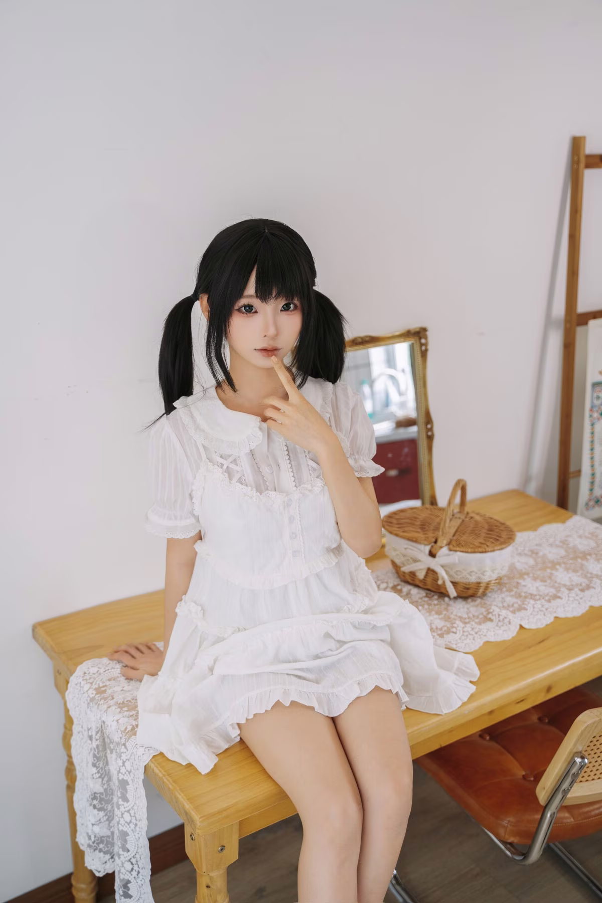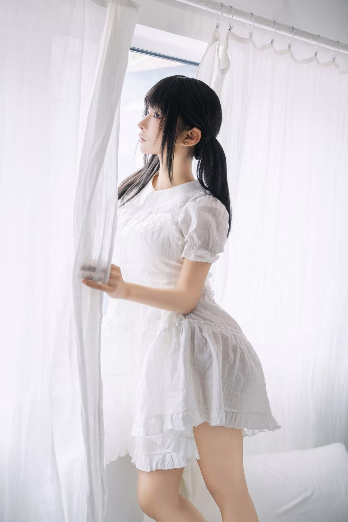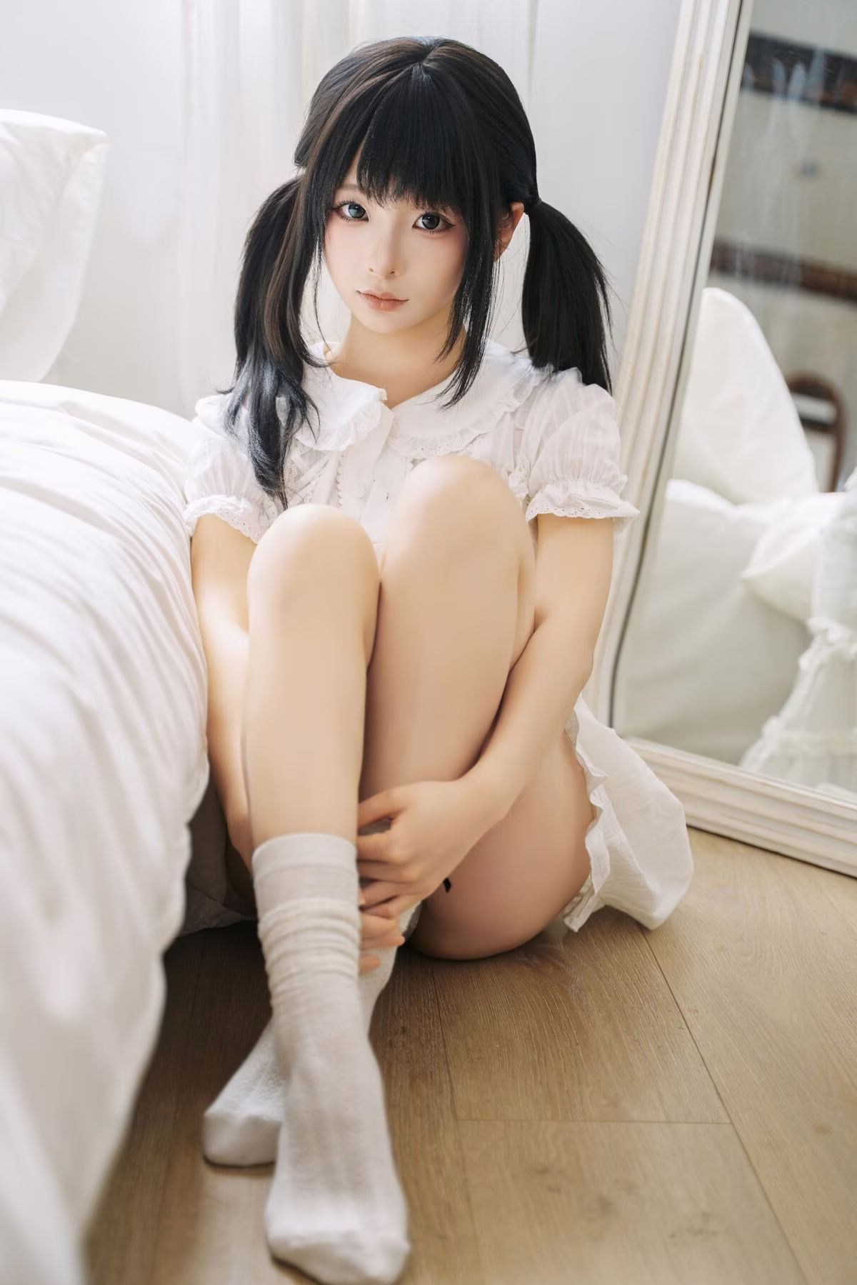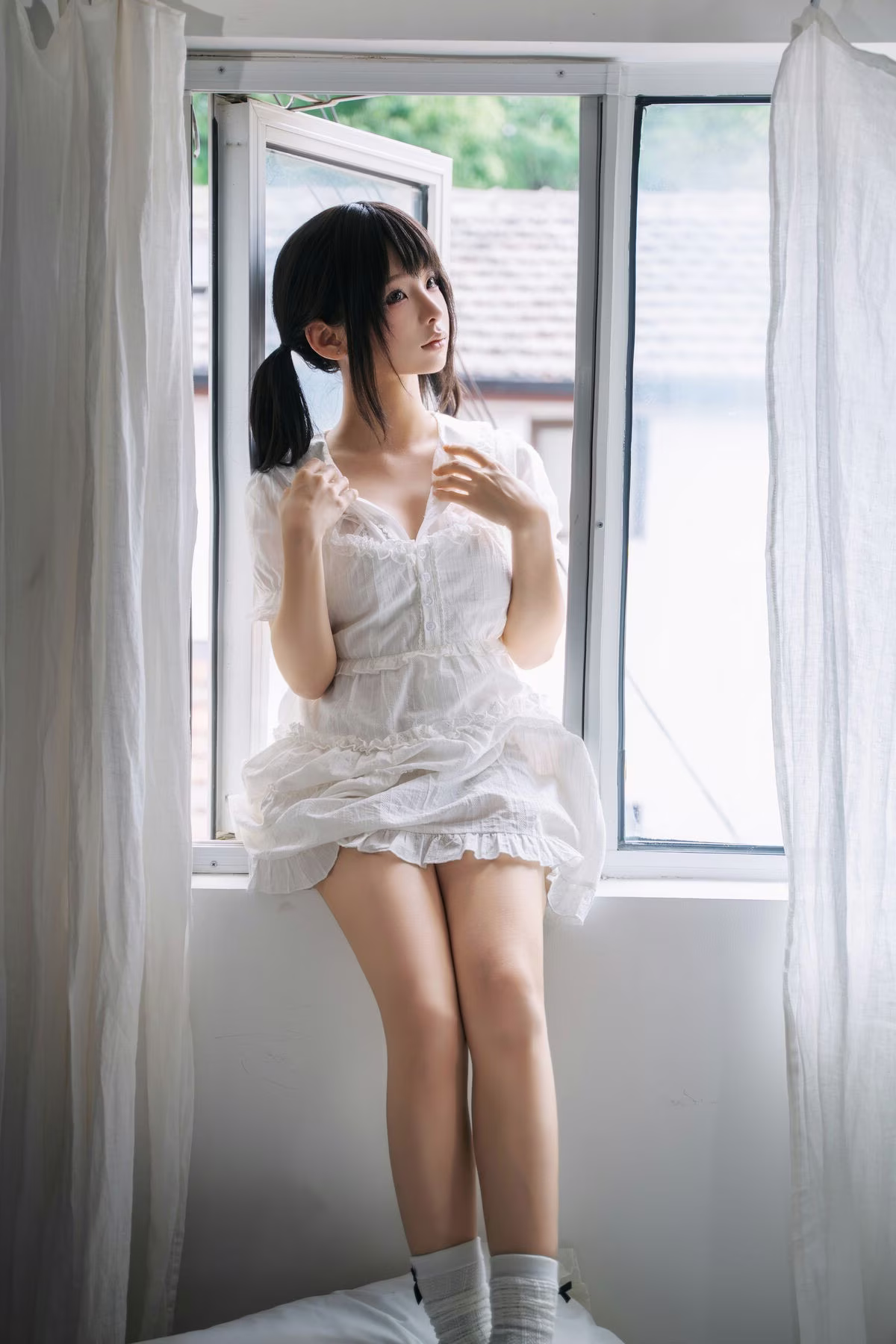 The August 2025 Selfies Part01 by Coser Chunmomo offer an enchanting glimpse into her innocent and delicate beauty. In this captivating image Chunmomo is seen with adorable pigtails adorned in a pristine white dress that evokes a sweet lolita style. She sits gracefully on a soft white bed bathed in natural light from a large window creating an intimate and dreamy ambiance. Her gentle gaze and subtle charming smile are truly mesmerizing sure to captivate every viewer. Each detail within the photograph from her refined posture to the serene backdrop highlights Chunmomo's irresistible allure as captured through her own lens.