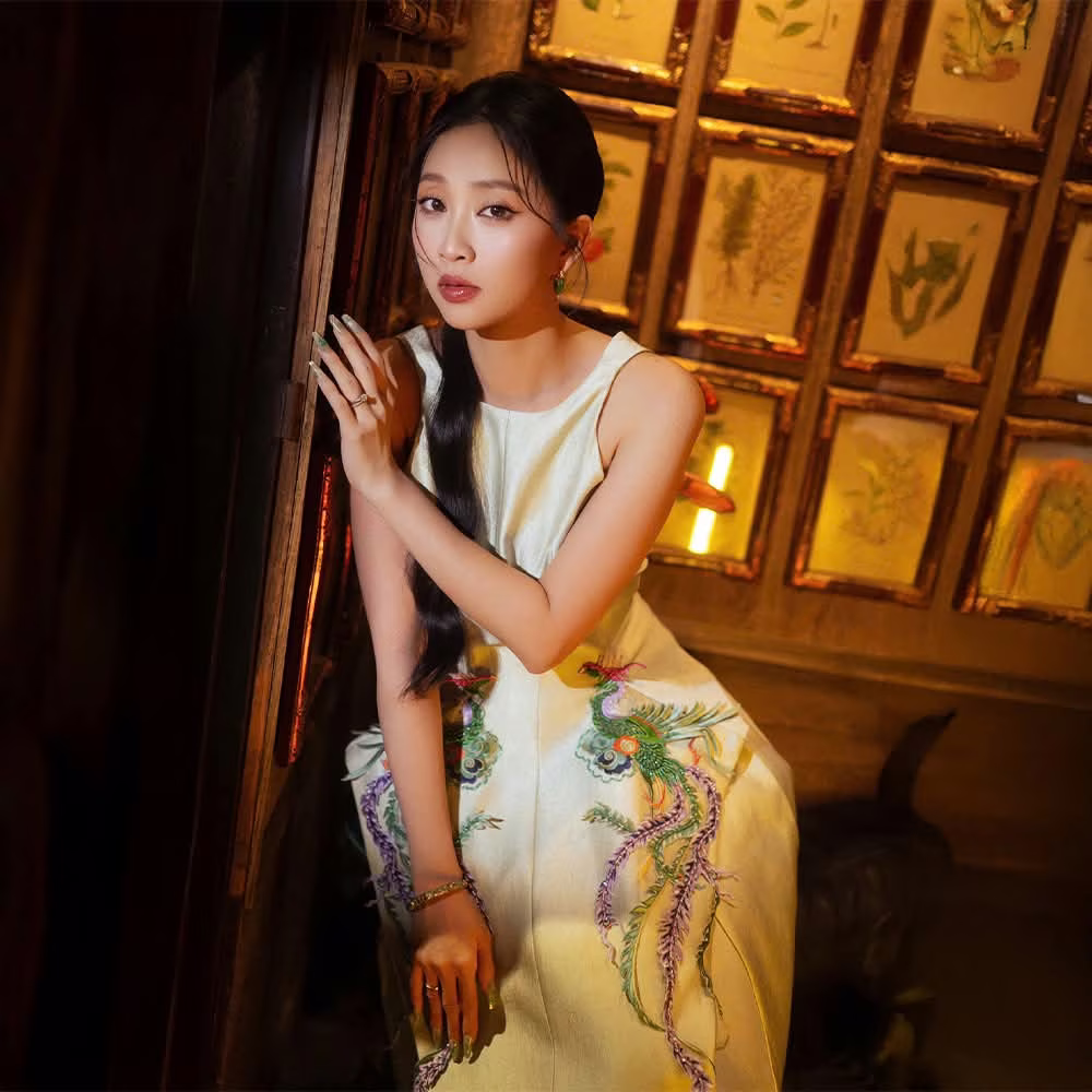 This image VGU No.4 captures a young woman exuding captivating Asian beauty. Her direct gaze into the camera reveals an aura of confidence and irresistible charm. Her dark hair and elegant attire further enhance her graceful presence. Behind her shelves of antique ceramics create an artistic and nostalgic atmosphere. The warm expertly utilized lighting beautifully accentuates her facial features and adds depth to this compelling portrait. The harmonious blend of the womans contemporary allure and the classic elegance of the pottery results in an emotionally rich composition inviting viewers to explore the story behind her every look. This is more than just a photograph it is an artistic moment where past and present converge.