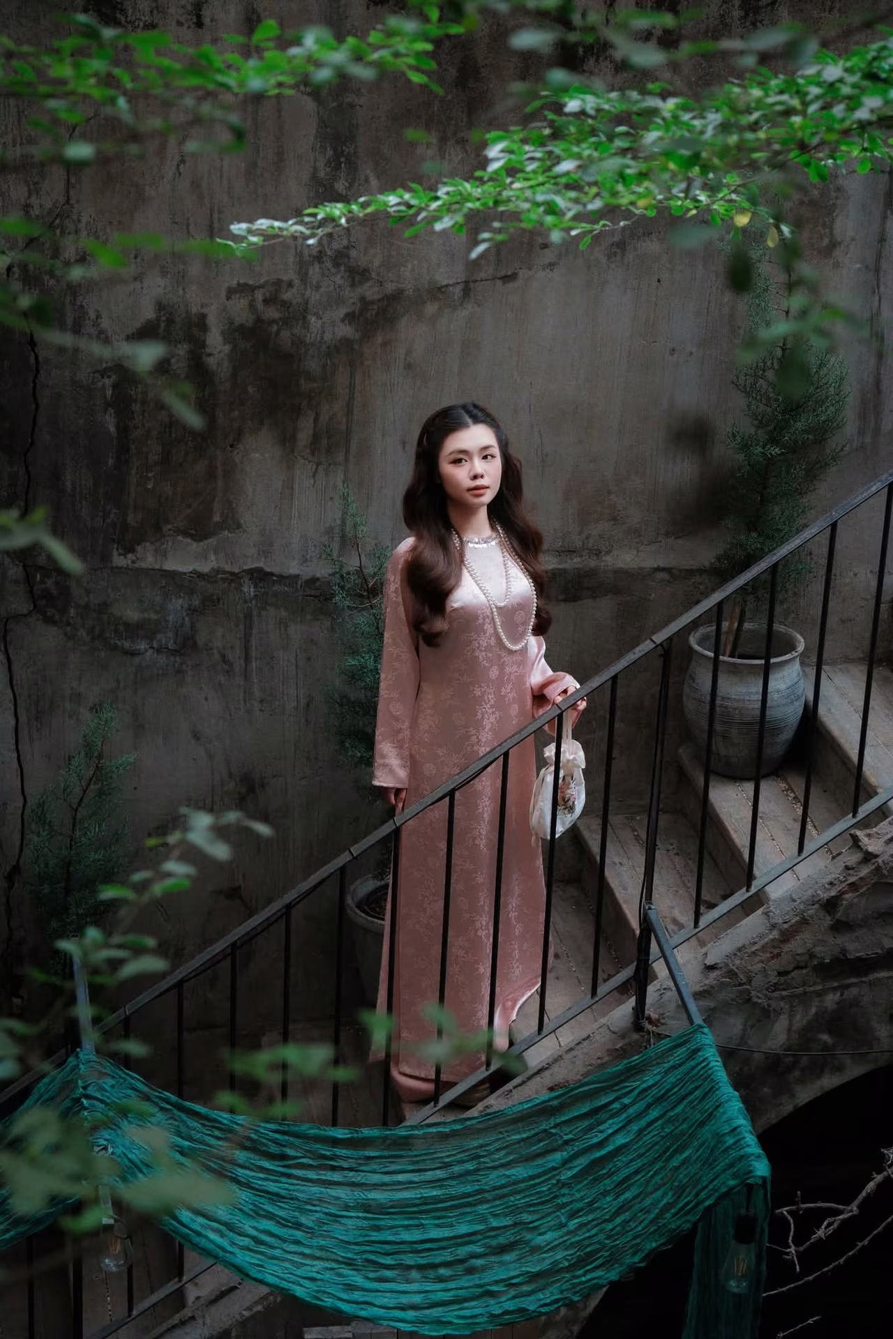 VGU No.80 captures the gentle and elegant beauty of a Vietnamese girl in a light pink ao dai Standing on an old staircase her gaze is deep reflecting the grace and traditional charm of an East Asian woman The flowing ao dai perfectly embraces her figure highlighting sophistication and poise The ancient backdrop with moss-covered walls and lush greenery creates a nostalgic atmosphere emphasizing the timeless beauty of the subject This is more than just a picture it is a story of Vietnamese culture and soul #Vietnamese #pretty #charm