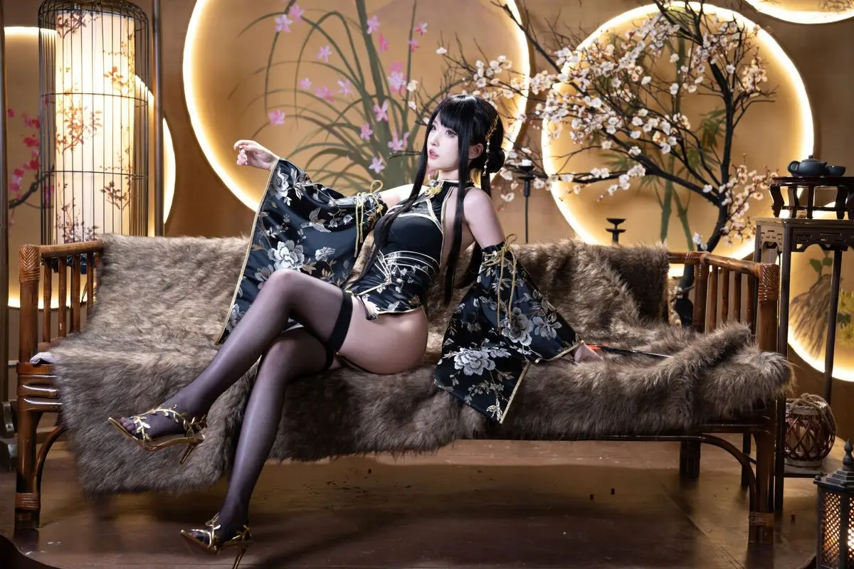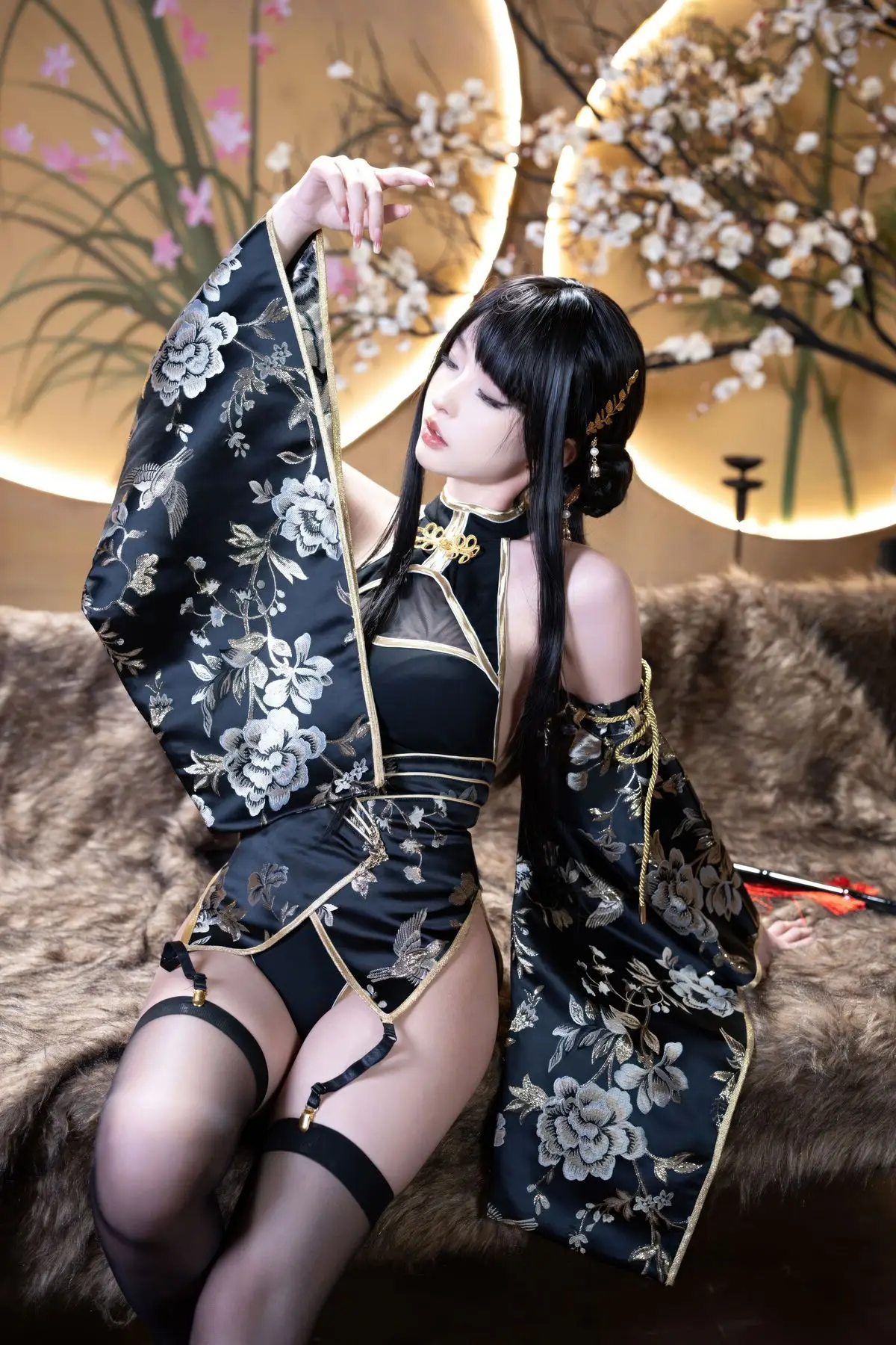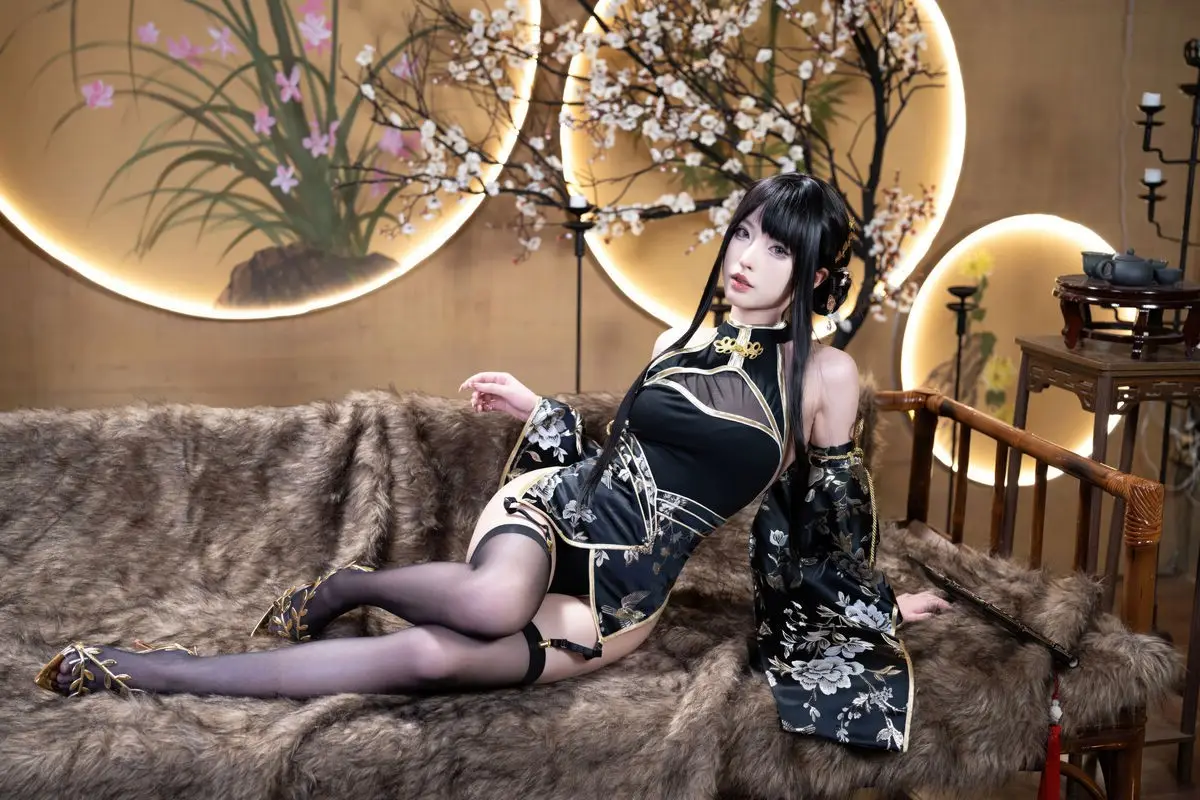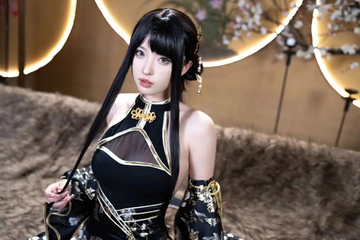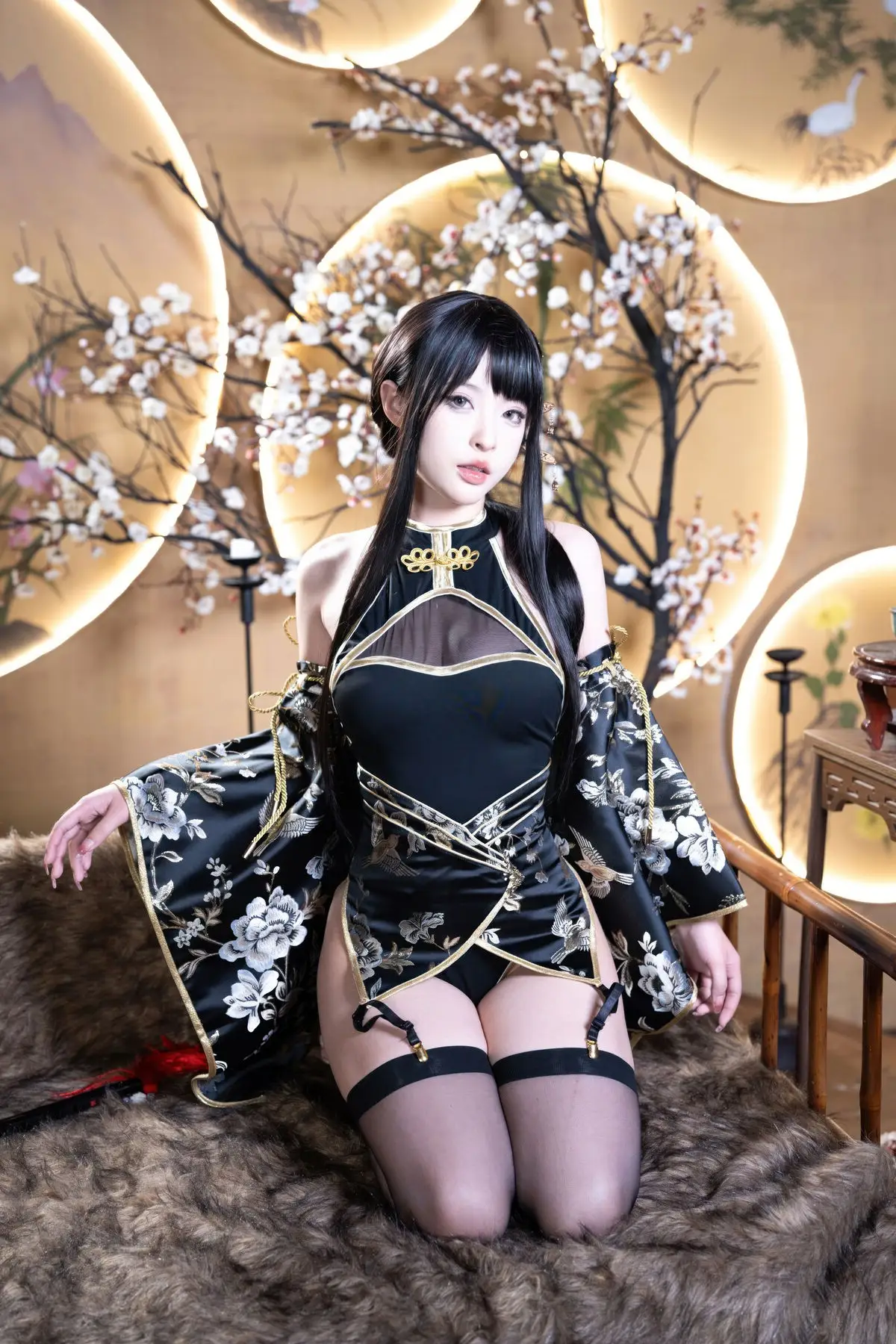This exquisite Jin Zhi Yu Ye photo set features Coser Qing Shui You Nai in a captivating and regal depiction. She dons a modernized traditional black gown intricately adorned with golden patterns exuding an aura of nobility and power. Her long sleek black hair and delicate facial features coupled with sharp expressive eyes highlight the character’s mysterious and alluring charm. The antique-inspired backdrop illuminated by warm lantern light further enhances the ethereal and sparkling beauty of the cosplayer. Each photograph showcases meticulous attention to detail from the elaborate costume to the subtle expressions offering a mesmerizing visual experience that draws viewers into the vibrant world of cosplay.