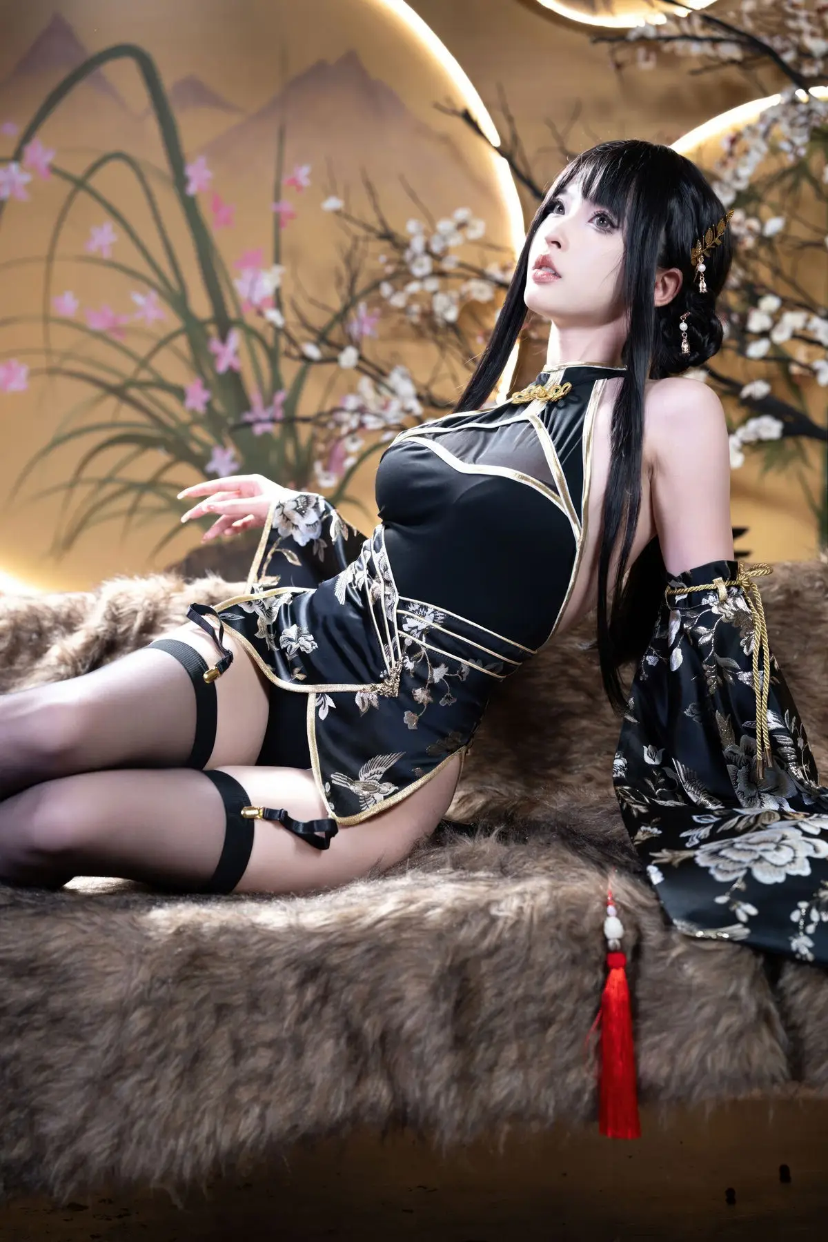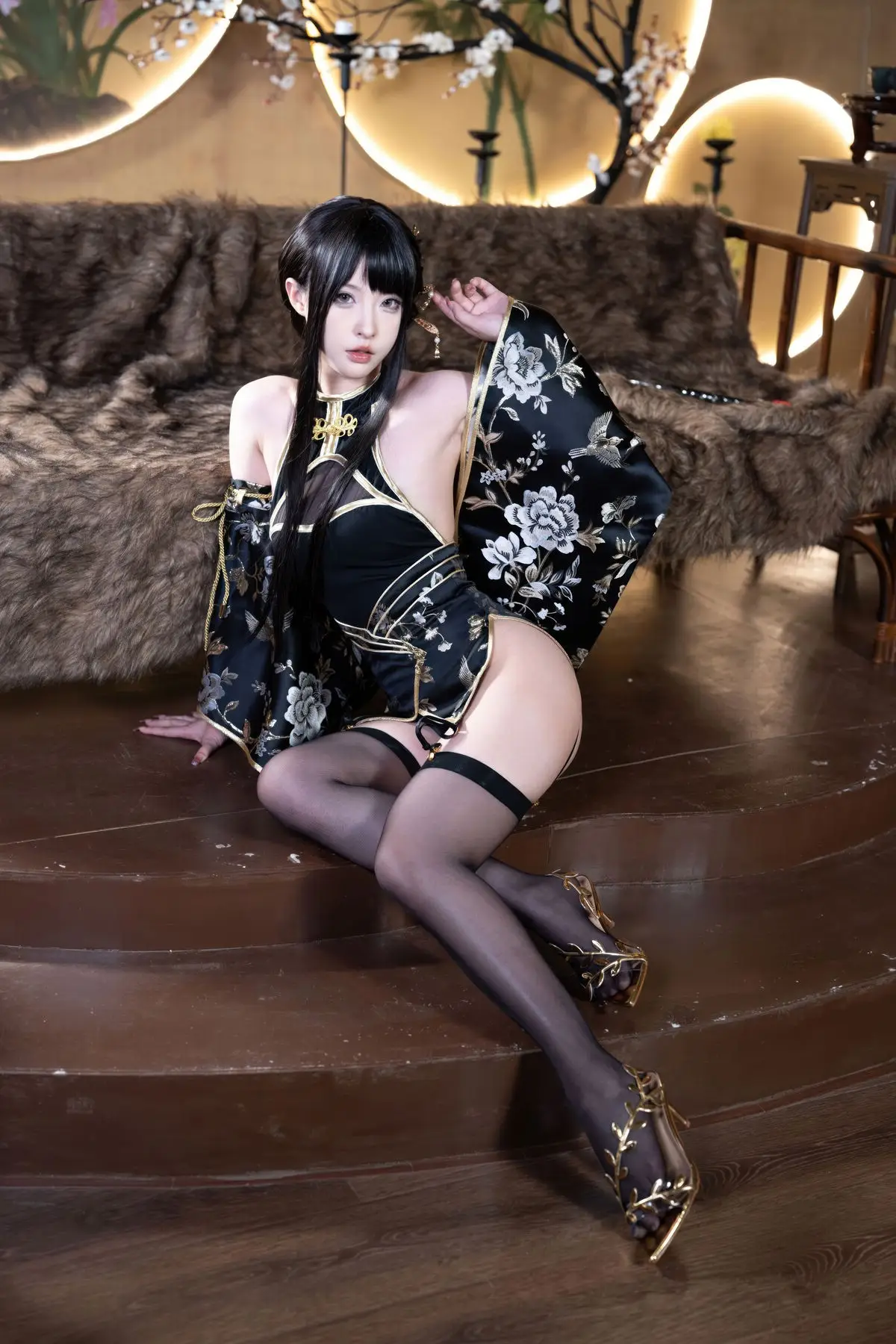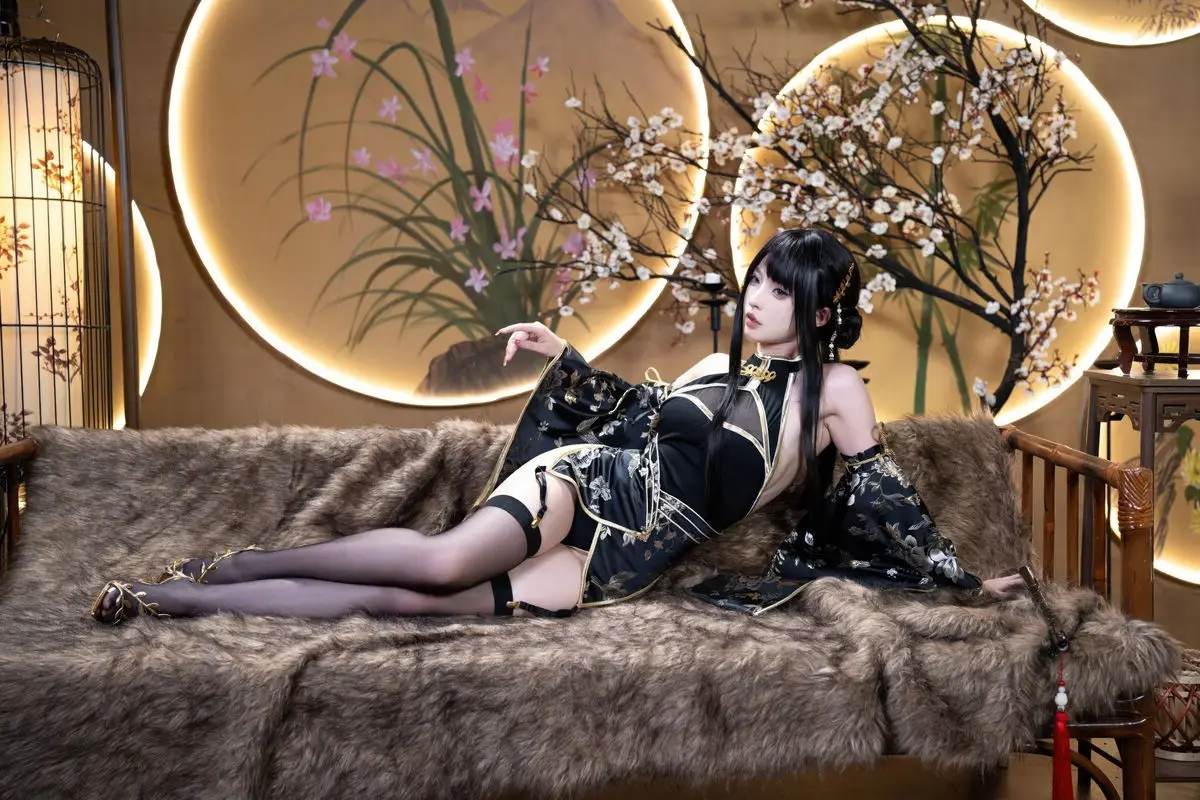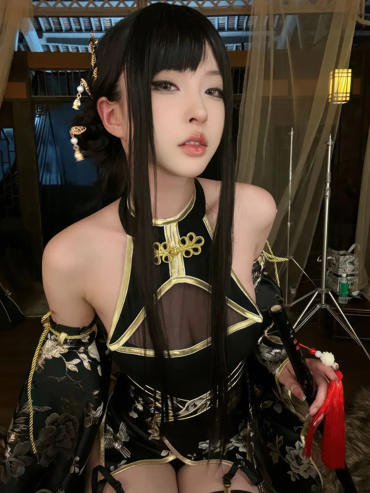 This exquisite Jin Zhi Yu Ye photo set features Coser Qing Shui You Nai in a captivating and regal depiction. She dons a modernized traditional black gown intricately adorned with golden patterns exuding an aura of nobility and power. Her long sleek black hair and delicate facial features coupled with sharp expressive eyes highlight the character’s mysterious and alluring charm. The antique-inspired backdrop illuminated by warm lantern light further enhances the ethereal and sparkling beauty of the cosplayer. Each photograph showcases meticulous attention to detail from the elaborate costume to the subtle expressions offering a mesmerizing visual experience that draws viewers into the vibrant world of cosplay.