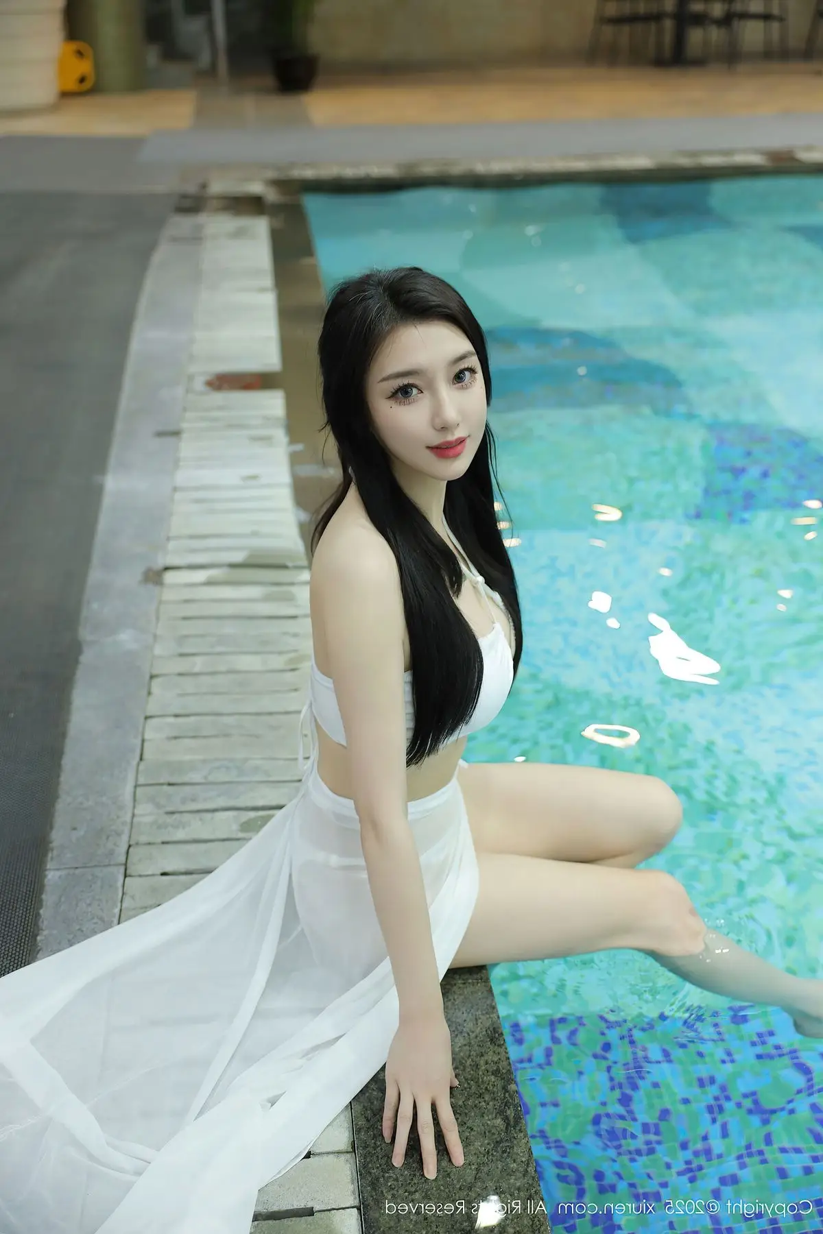 In this captivating image, model Su Yi Nuo radiates ethereal beauty by the serene blue swimming pool. She is elegantly dressed in a pristine white bikini top paired with a flowing sheer skirt, creating a look that is both alluring and sophisticated. Su Yi Nuo's direct gaze and gentle smile draw the viewer in, showcasing her confidence and graceful charm. The clear waters of the pool provide a tranquil backdrop, enhancing her natural allure and evoking a sense of relaxation and romance. This particular shot is part of a special collection from XiuRen, where Su Yi Nuo delivers memorable moments, embodying her unique and captivating style. Collection No10441 promises an enchanting visual experience.