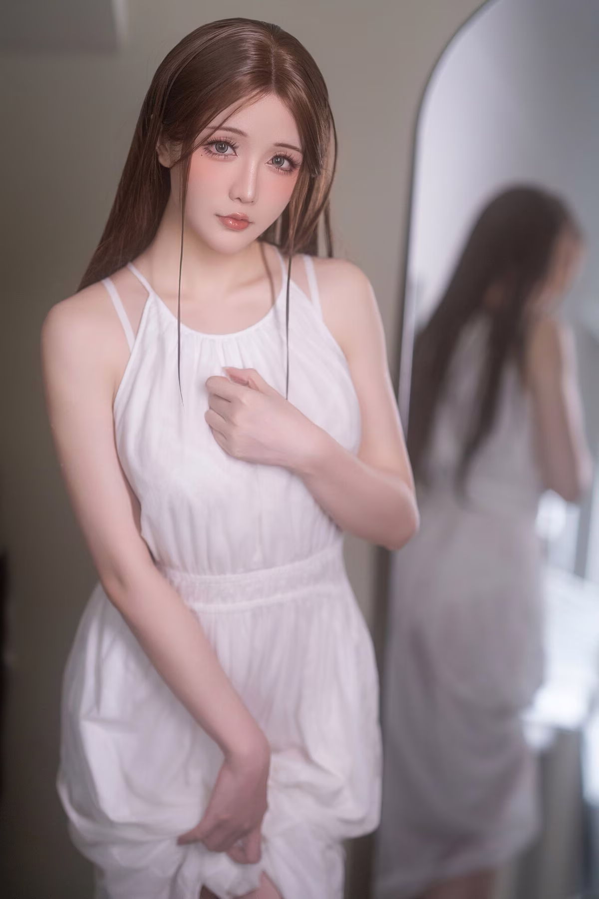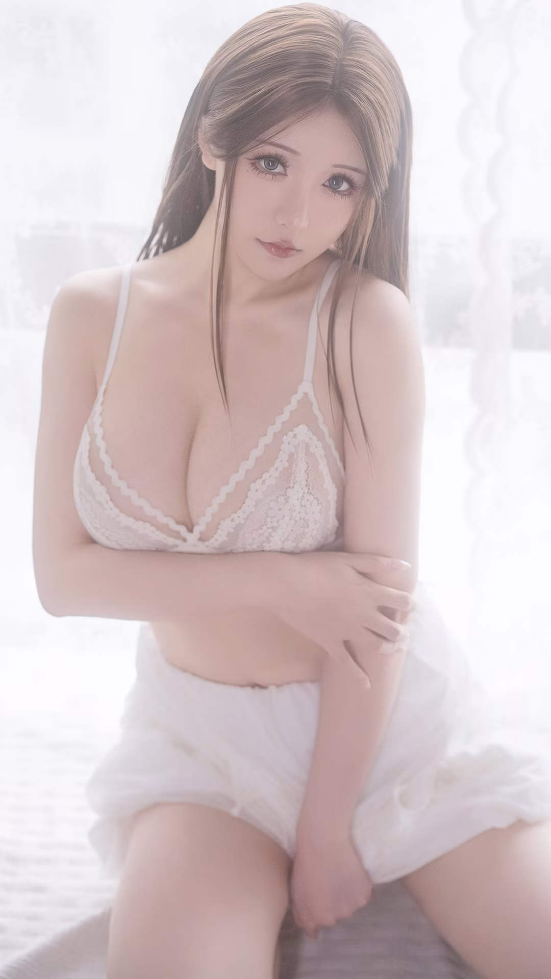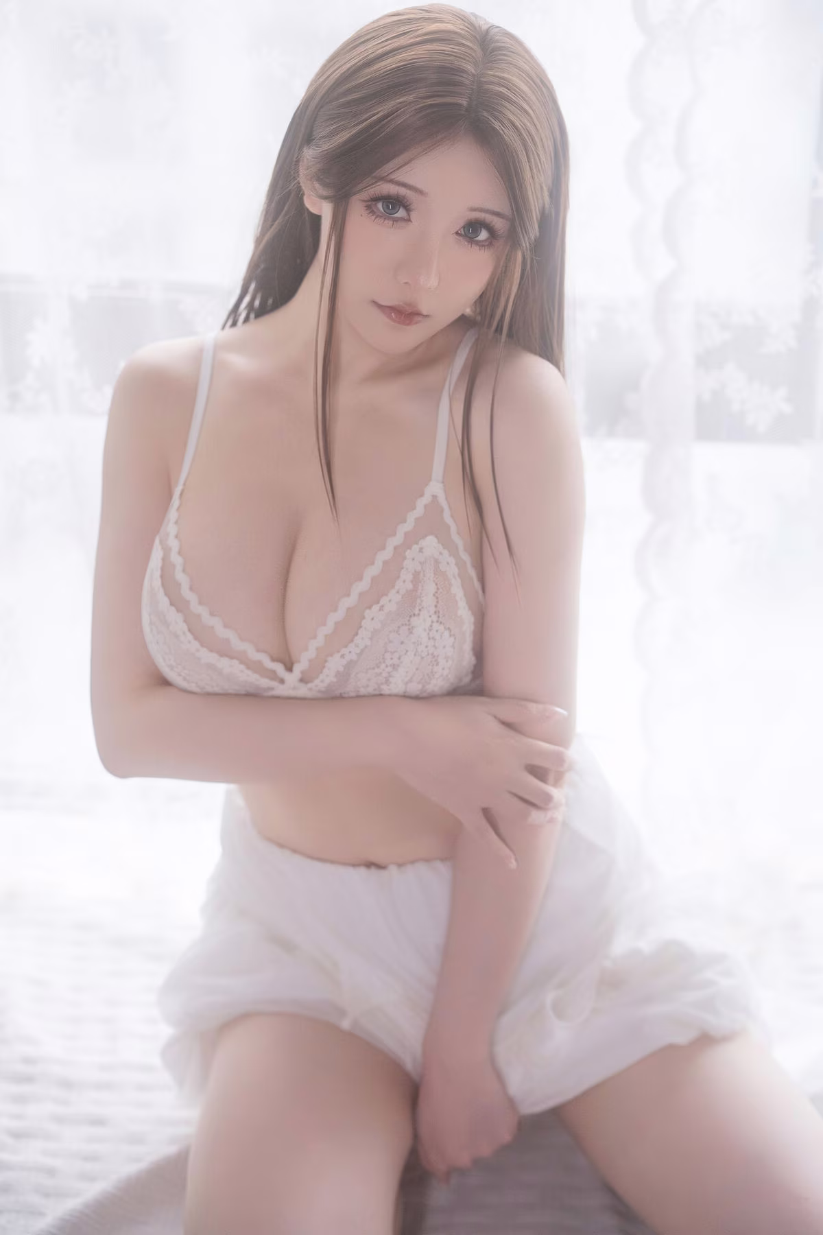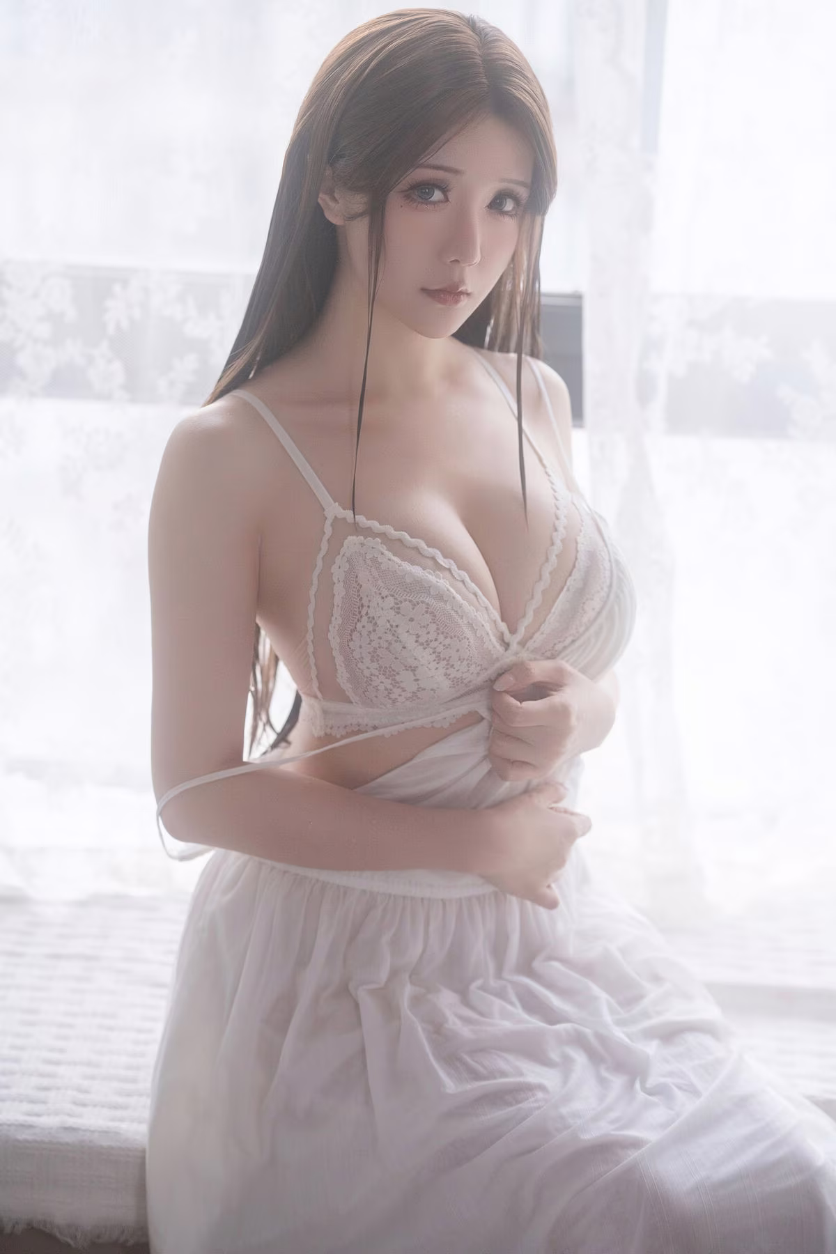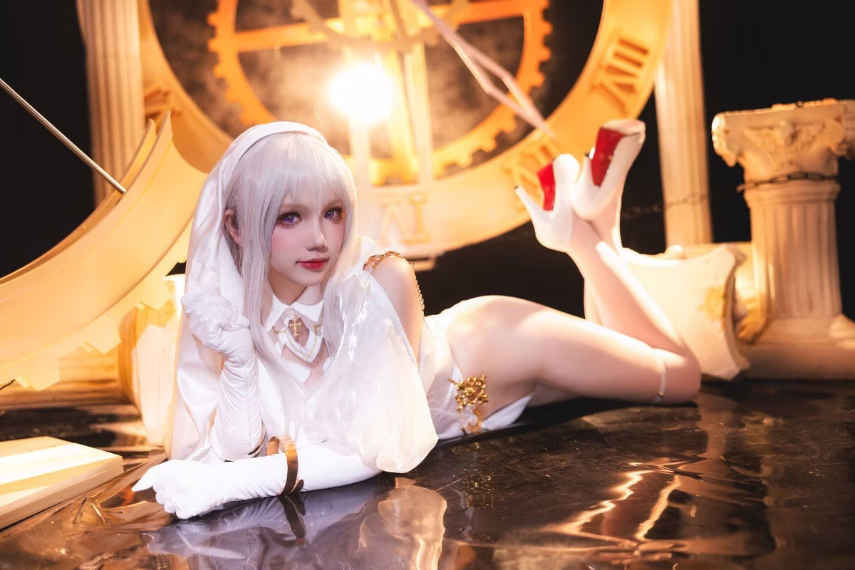 Coser Yuki Astra delivers an impressive and enchanting portrayal of the Holy Angel Nun. Dressed in a pristine white ensemble she emanates a beauty that is both ethereal and subtly alluring. Every intricate detail of the costume from the delicate veil to the form-fitting lines is meticulously crafted accentuating her figure and the celestial aura of an angelic presence. The cosplayers dreamy gaze and captivating expressions transport viewers into a mystical realm where sanctity and earthly allure beautifully intertwine. The classical backdrop further enhances the mystical ambiance creating a harmonious and emotionally resonant overall image. This collection is not merely a cosplay photoshoot but a true work of art inspiring imagination and profound admiration.