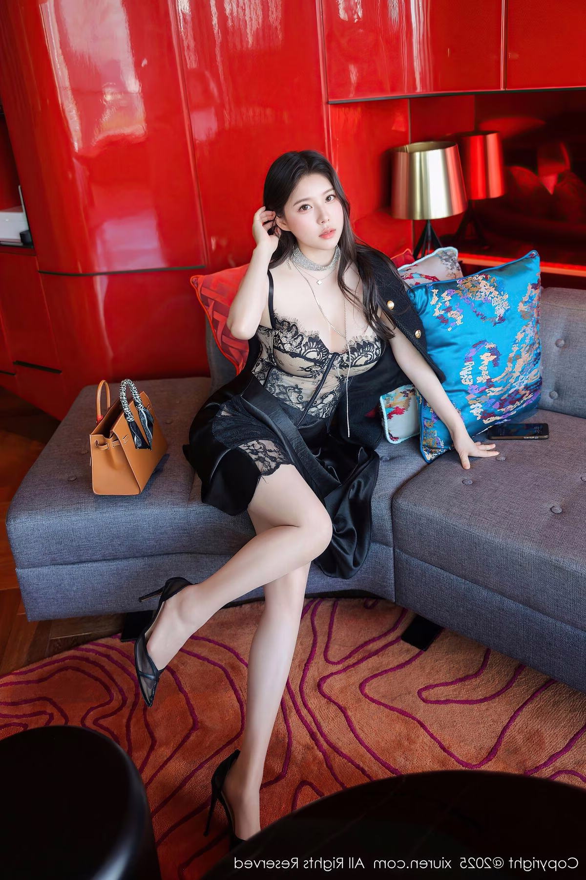 Discover the captivating beauty of model Bai Cong Yuan in the exclusive XiuRen No.10360 photo collection. In this striking image Bai Cong Yuan showcases her slender figure and incredibly long legs posing alluringly on a plush sofa. Her sensual black lace bodysuit elegantly hugs her form accentuating her graceful curves and mysterious charm. Soft natural light from the window illuminates her smooth skin and dark flowing hair. Every detail from her delicate high heels to her thoughtful expression contributes to an artistic and irresistibly appealing photograph inviting viewers to appreciate this exquisite beauty.