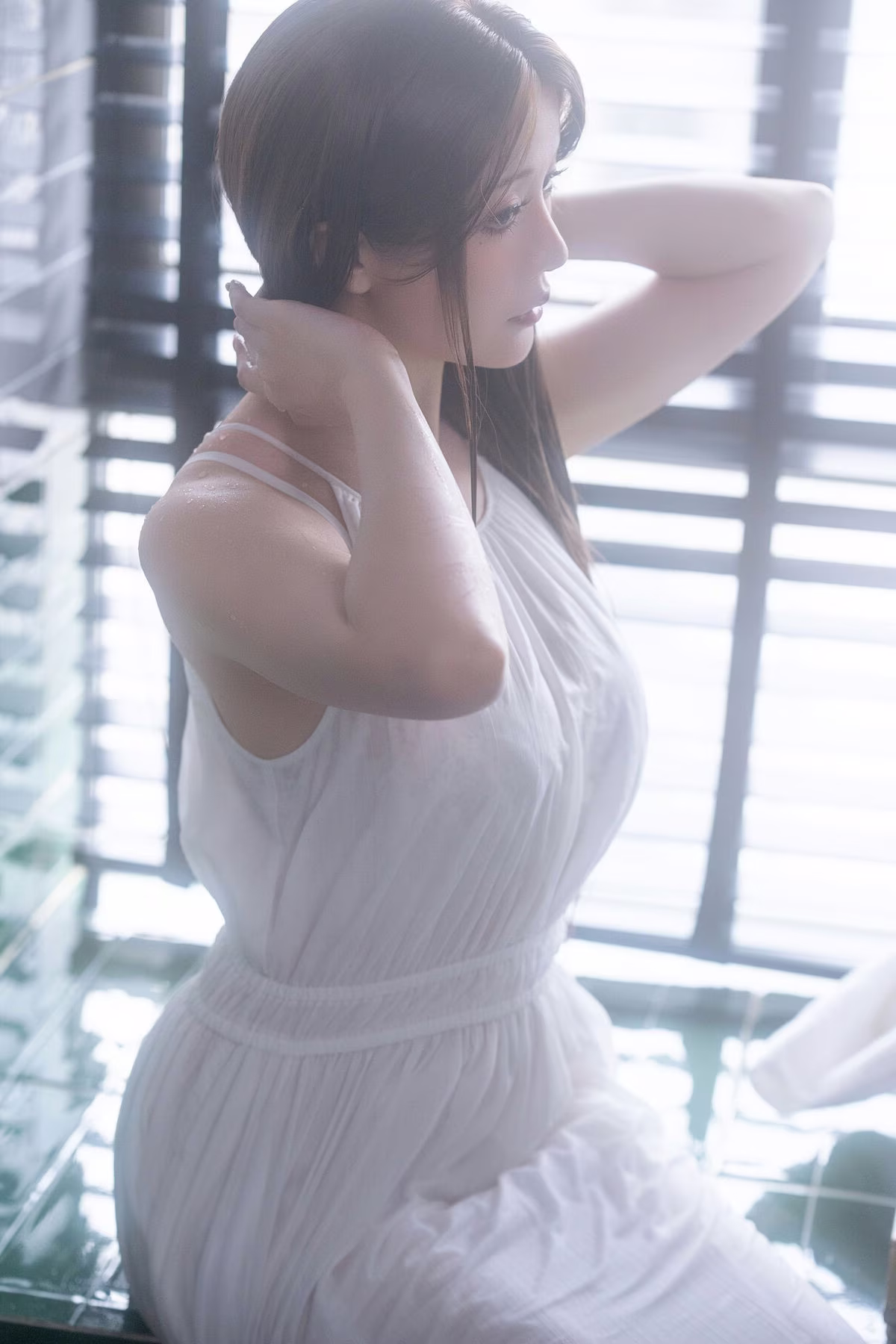 Immerse yourself in the captivating world of Coser Hoshilily (星之迟迟) with this stunning image from 'Wonderful Rainy Day Encounter' Part01. The renowned Chinese model Hoshilily radiates a delicate and irresistible charm. Bathed in soft, diffused light, she embodies an ethereal beauty, creating an intimate and serene atmosphere. Her gentle pose and contemplative expression evoke a sense of quiet introspection, perfectly complementing the 'rainy day' theme. This photograph beautifully captures a moment of grace and alluring elegance, inviting viewers to appreciate the subtle emotions and exquisite aesthetics presented by Hoshilily. Explore more from this unique collection.