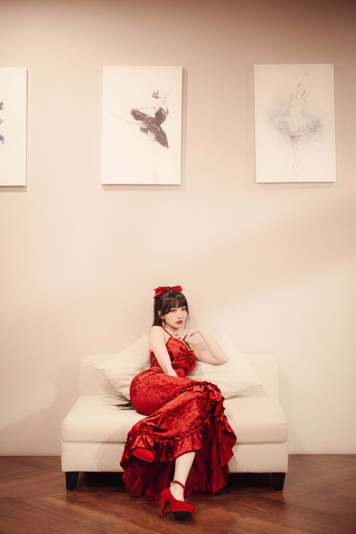 Coser Mu Mu Momo radiates captivating allure in this sensual photoshoot. Reclining gracefully on a sofa, she showcases her stunning figure in a vibrant red outfit complemented by matching high heels. Her mesmerizing gaze and relaxed expression create an intimate and alluring atmosphere hinting at moments after a delightful perhaps tipsy evening. Every detail from her styled hair to her elegant hand placement exudes the confidence and irresistible charm of a professional model. This collection not only highlights Mu Mu Momo's artistry but also offers emotionally rich and visually compelling moments inviting viewers to explore her multifaceted beauty and captivating presence.Stories
