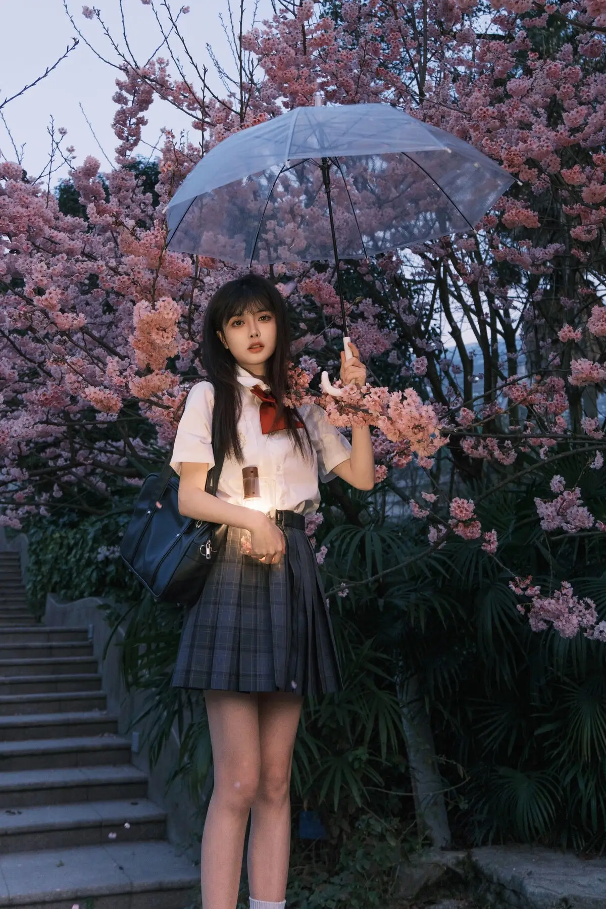 In the YiTuYu Vol8564 series model Xing Zhi Ka Tao embodies an ethereal muse amidst a magical setting Dressed in a delicate school uniform she gently cradles a glowing lantern its warm light illuminating her serene face and flowing hair Surrounding her are soft pink cherry blossoms weaving a romantic and dreamlike tapestry A clear umbrella overhead enhances the surreal beauty suggesting shes wandering through a twilight reverie This enchanting portrait evokes a sense of peace tenderness and a touch of mystery inviting viewers to immerse themselves in the captivating charm of this moment where dusk meets night#XingZhiKaTao #CherryBlossoms #EtherealBeauty #LanternLight #TwilightDreams