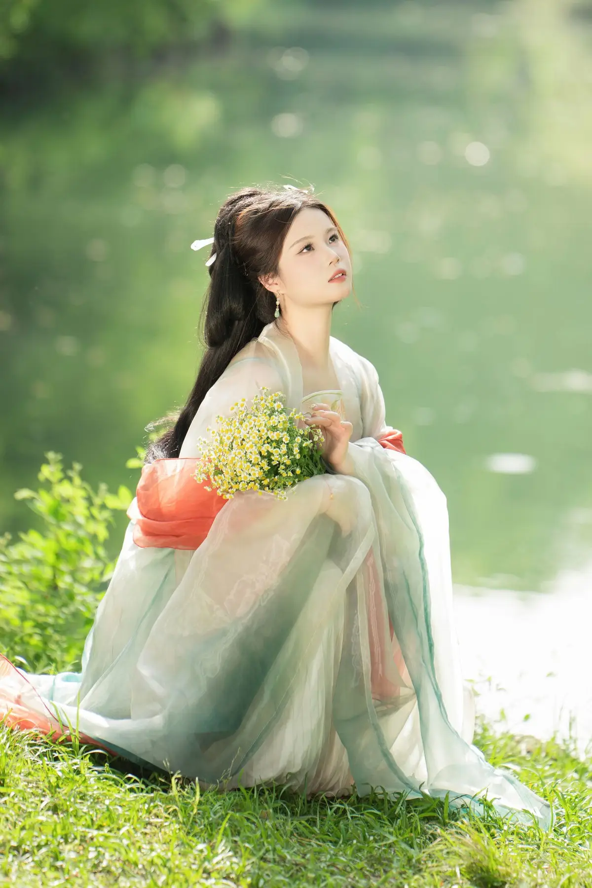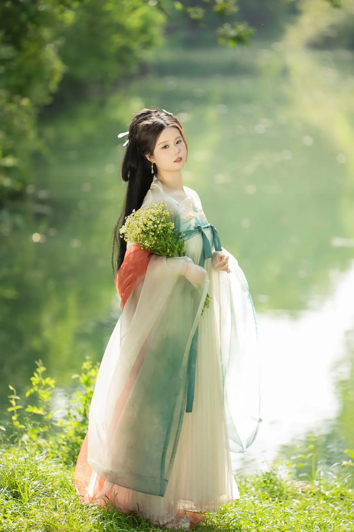 In the exquisite YiTuYu Vol.8558 collection, model Xi Gua embodies timeless grace, adorned in a stunning traditional Hanfu. Her ethereal gown, a delicate blend of ivory, soft teal, and vibrant orange-red sashes, creates a captivating visual symphony. Set amidst a lush natural backdrop, with dappled sunlight filtering through verdant leaves, Xi Gua's serene presence is highlighted, emphasizing the intricate details of her attire and her ethereal beauty. This photograph transcends a mere image, offering a tranquil escape into a poetic realm where classic elegance harmonizes effortlessly with the refreshing embrace of nature.#Hanfu #XiGua #YiTuYu #TraditionalChineseFashion #AsianBeauty