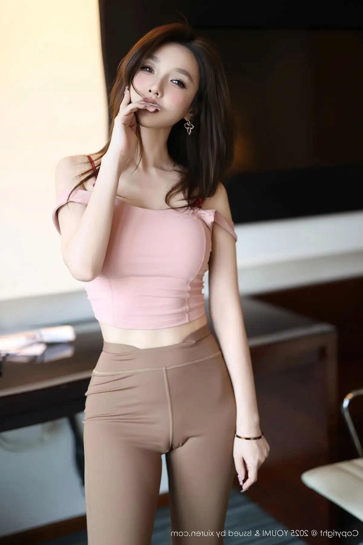 This stunning image from the YouMi Vol1167 collection showcases the exquisite beauty of a Chinese model. Bathed in soft natural light from a large window she strikes a captivating pose in delicate lace lingerie and stylish brown trousers. Her confident stance alluring gaze and flowing dark hair create a vibrant and sensual portrait. Every detail from her elegant attire to her subtle expression exudes the unique charm and appeal characteristic of the Tao Tao Yao Yao Twins style. This artistic moment celebrates modern East Asian beauty drawing every eye with its graceful allure and sophisticated charm.#YouMi #ChineseModel #TaoTaoYaoYaoTwins #AsianBeauty #SensualStyle