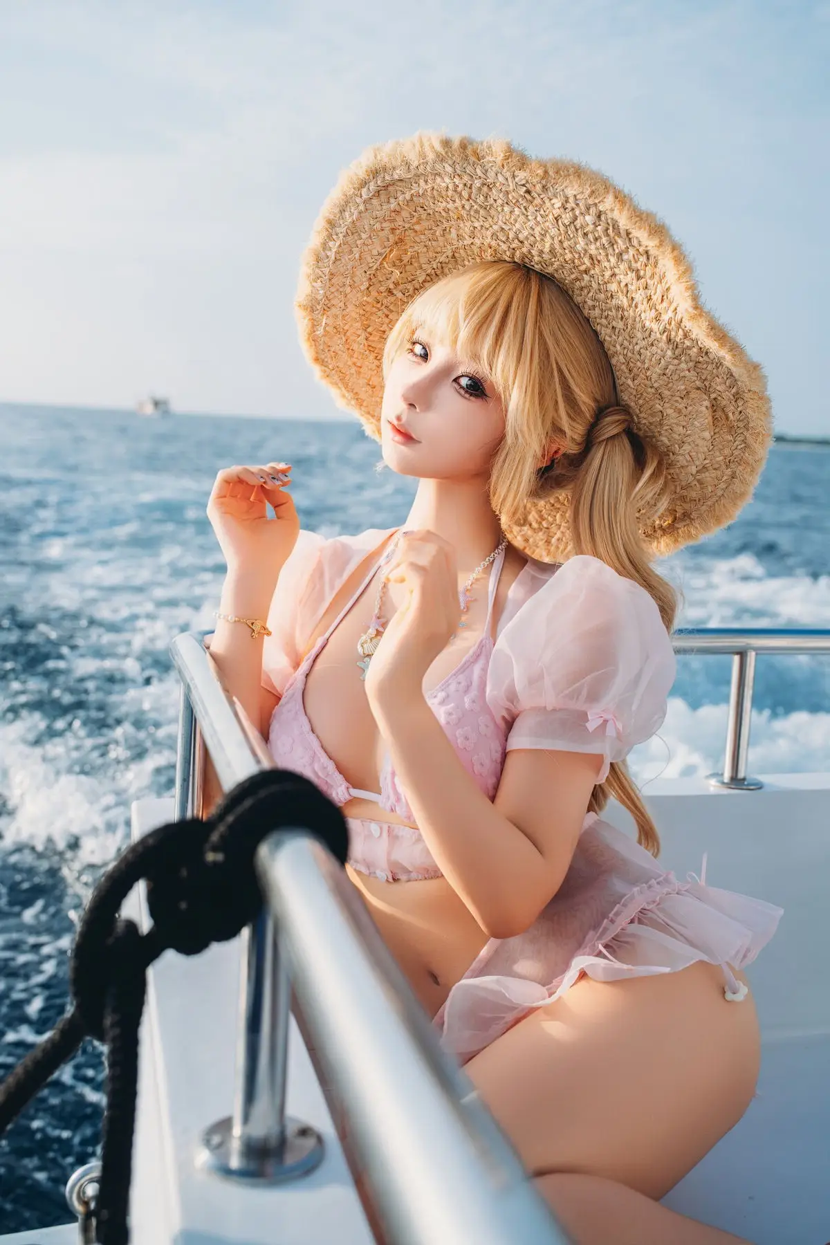 Immerse yourself in the captivating charm of Coser Chunmomo as she graces a luxurious yacht. Dressed in a delicate pastel pink swimsuit and a stylish straw hat, Chunmomo poses elegantly against the breathtaking backdrop of a vibrant ocean sunset. The golden hour light bathes the serene waters, creating a romantic tableau that enhances her ethereal beauty and alluring presence. This self-portrait series Part02 masterfully blends exquisite beach fashion with the artistry of cosplay, capturing moments of serene relaxation. It promises a truly unforgettable visual journey for viewers.#CoserChunmomo #YachtLife #SunsetVibes #BeachFashion #CosplayPhotography