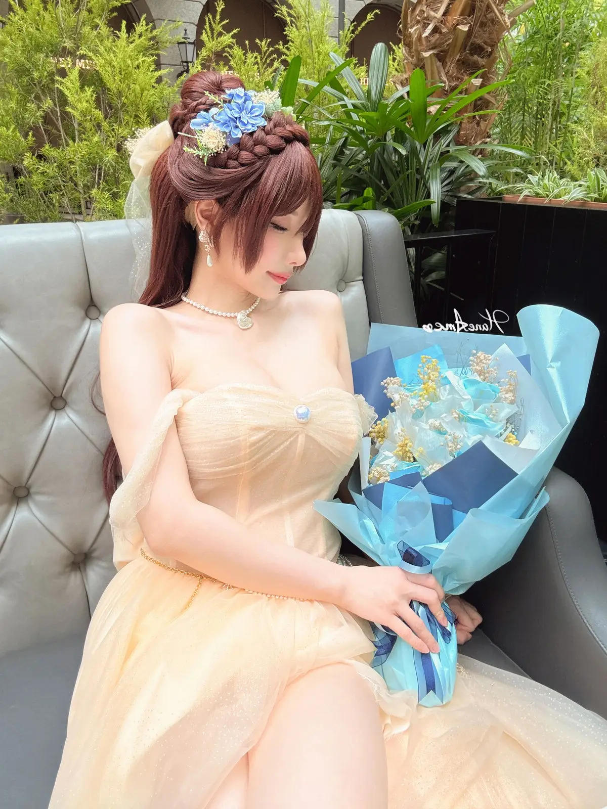 This stunning image features Coser Hane Ame in her exquisite 2025 Birthday Dress She radiates elegance and charm in a delicate cream strapless gown highlighting her graceful figure and soft contours Her intricately braided hair and a simple yet elegant pearl necklace complete the sophisticated look Hane Ame holds a vibrant bouquet of blue flowers adding a fresh and harmonious contrast to her overall appearance Her gentle gaze and charming smile invite viewers to admire her captivating beauty This is more than just a cosplay it is a refined blend of style and confidence creating a truly memorable and emotional moment#Coser #HaneAme #2025BirthdayDress #ElegantCosplay #StraplessGown #CosplayBeauty