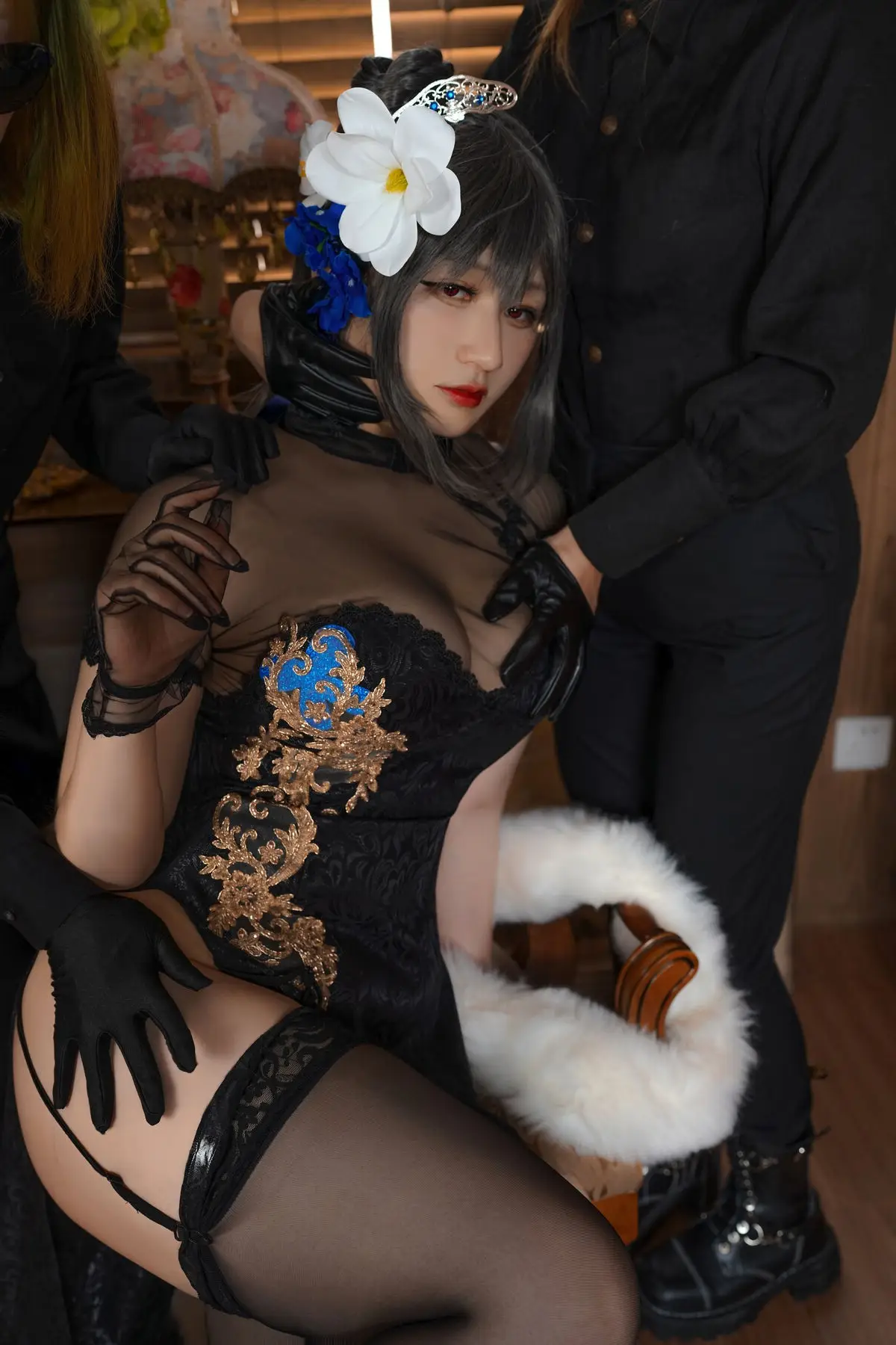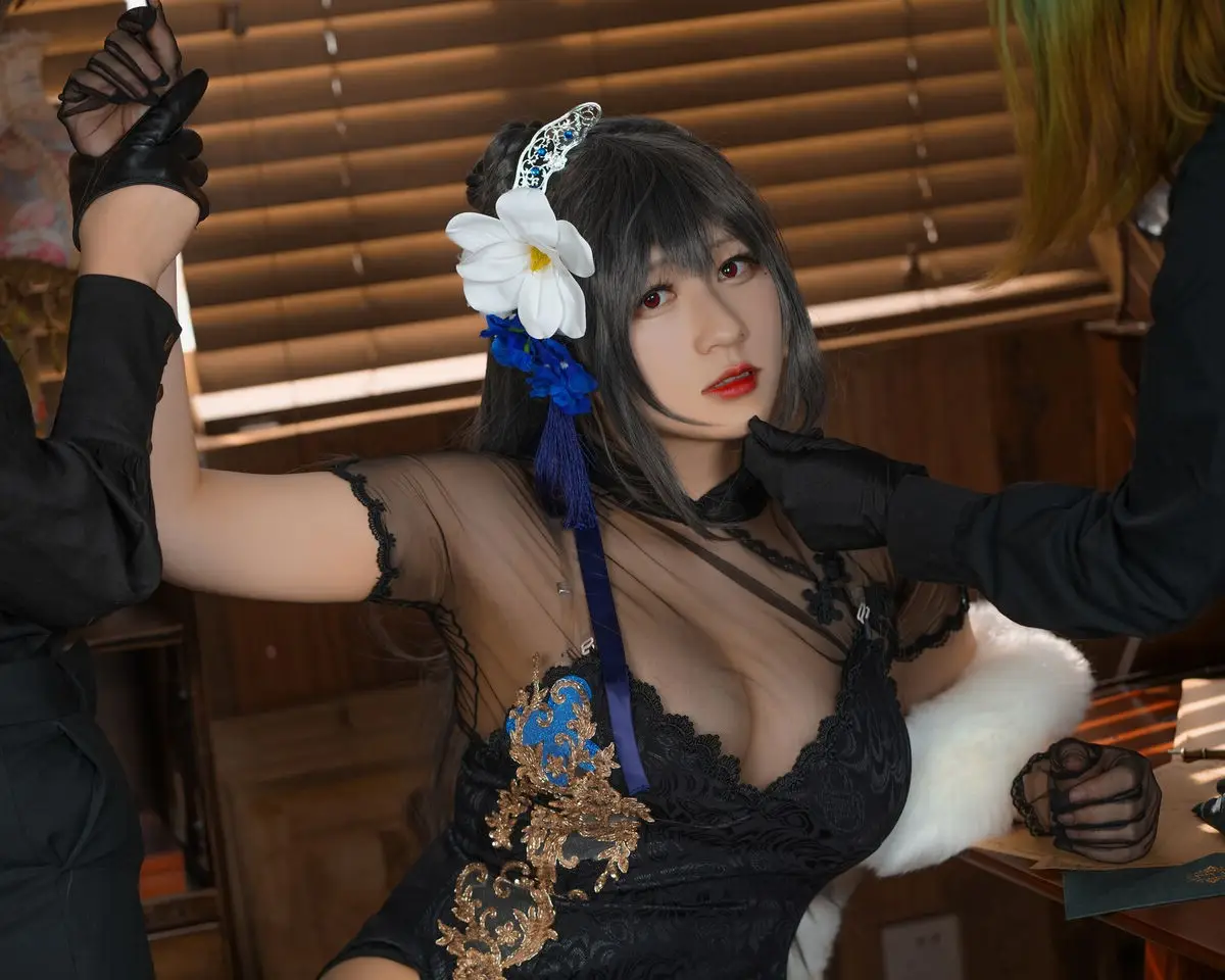 In this captivating image Coser Zyra Aki delivers a striking portrayal in the unique Louis IX Qipao exuding both allure and mystery. The exquisite design of the black cheongsam adorned with shimmering gold embroidery gracefully accentuates her elegant figure. Her dark hair complemented by a white floral and blue ribbon accessory frames a sharp expressive face. Zyra Aki's compelling expression coupled with the dramatic setting where she appears to be restrained weaves a fascinating and thought-provoking narrative. This is a masterful cosplay performance showcasing meticulous attention to costume detail and exceptional character embodiment destined to captivate all who behold it.#Coser #ZyraAki #LouisIXQipao #CosplayFashion #CheongsamStyle #DramaticCosplay