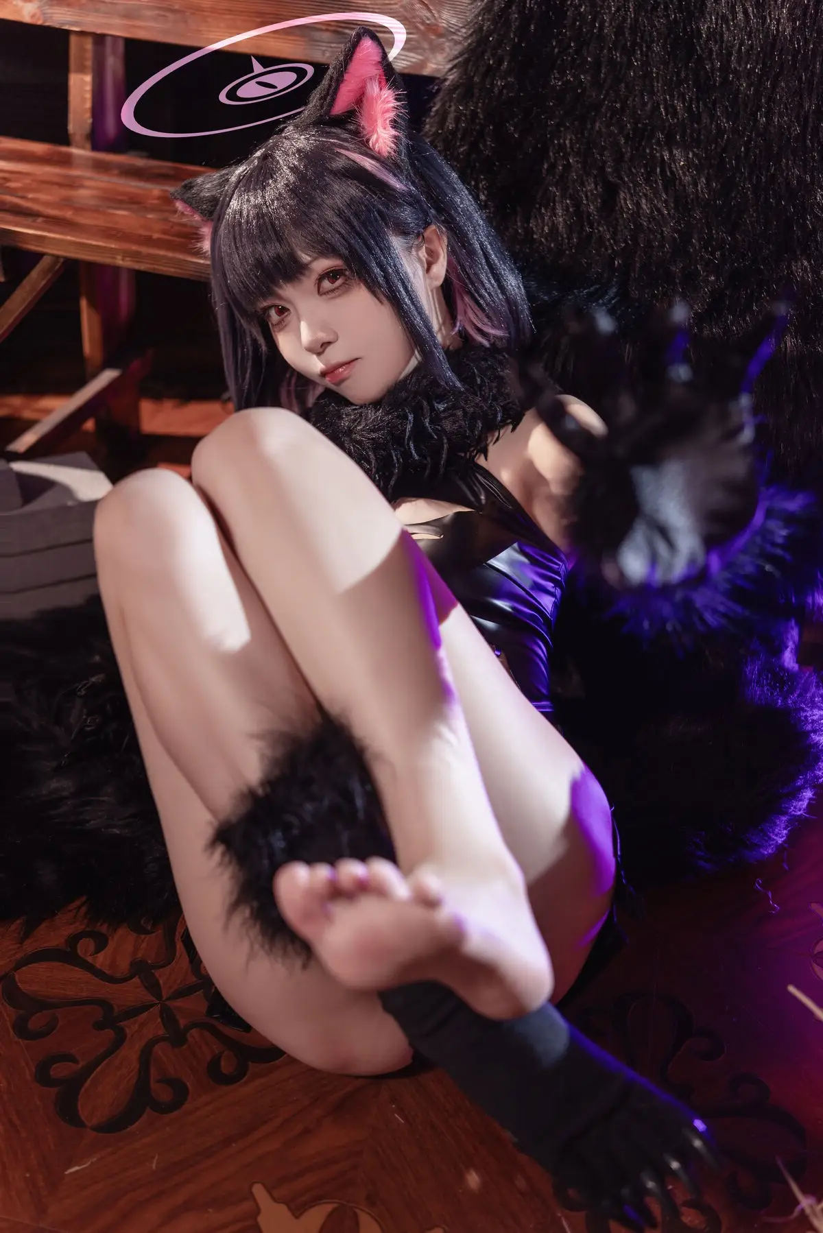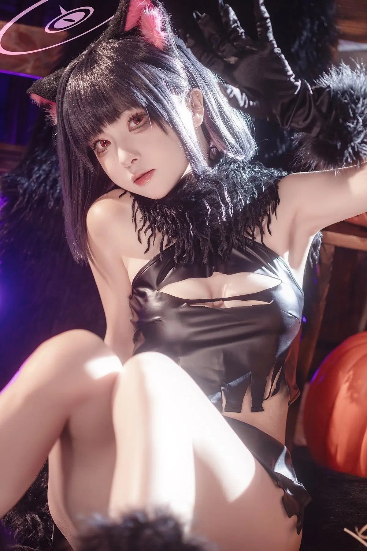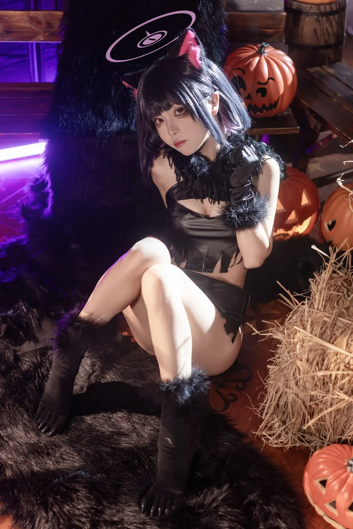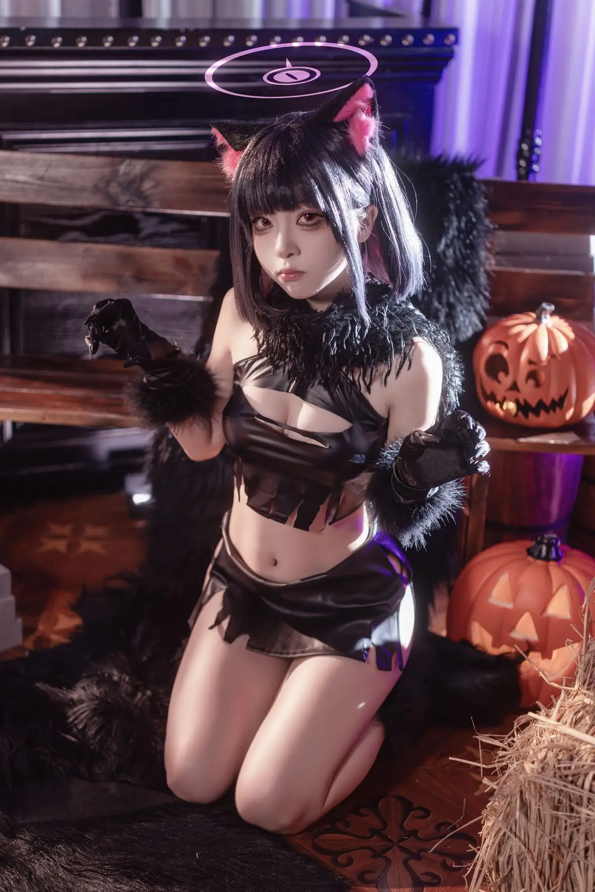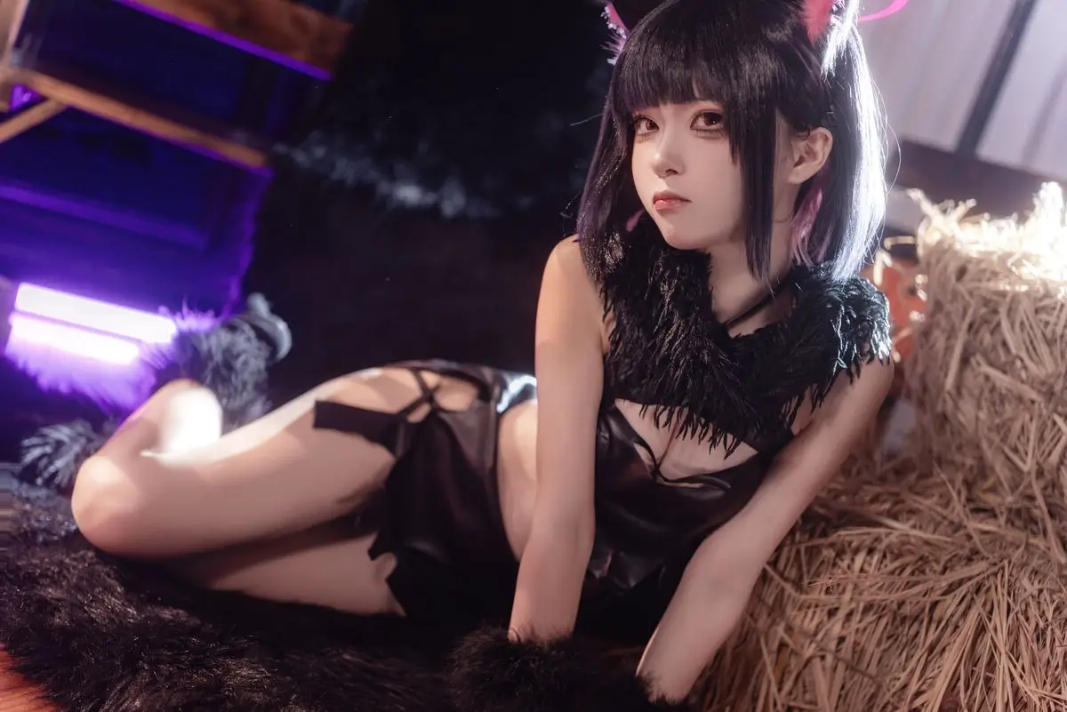 In this striking photo set featuring Coser Shi Liang Yu as Kazuha Halloween viewers are invited to witness her captivating and alluring portrayal of a mysterious character. With prominent pink cat ears adorning her sleek dark hair and a form-fitting black outfit that accentuates her graceful figure she masterfully embodies an image that is both adorable and utterly enchanting. Her deep gaze and subtle smile create an irresistible charm sparking curiosity in anyone who beholds her. The dark mystical backdrop enhanced by soft purple lighting further amplifies the enigmatic Halloween atmosphere. This is more than just a simple cosplay it is a meticulous work of art showcasing incredible attention to detail from the costume to the expressive demeanor transforming Kazuha Halloween into a symbol of allure and mystery for the masquerade night.#Coser #ShiLiangYu #HalloweenCosplay #KazuhaHalloween #AlluringCosplay #MysteriousCatgirl