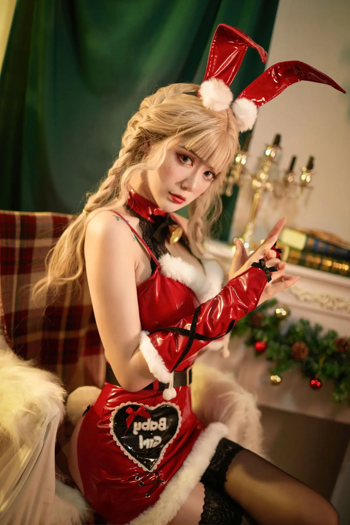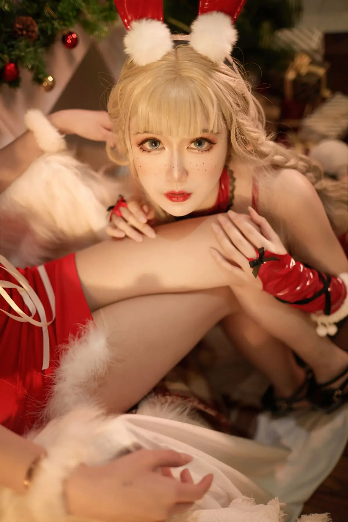 Coser Yi Mi Ba De Da Li Zi brings a unique festive spirit to Christmas 2021 with her captivating cosplay photoshoot She embodies an alluring Santa bunny girl seamlessly blending the playful charm of vibrant red bunny ears with the classic elegance of a red and white Santa outfit Every detail from the black bow with a tiny golden bell to the long red gloves enhances her enchanting appearance Her compelling gaze and golden braided hair set against a twinkling Christmas tree backdrop create a mesmerizing holiday scene This collection not only showcases creative cosplay but also radiates a warm and inviting Christmas cheer making it a truly memorable holiday visual#Coser #YiMi #BaDeDa #LiZi #Christmas2021 #SantaBunnyCosplay #HolidayOutfit #AlluringCosplay