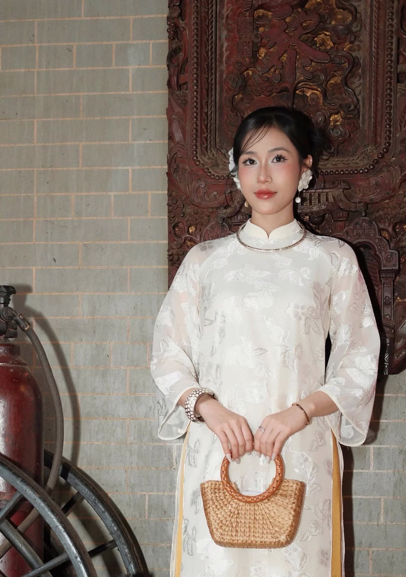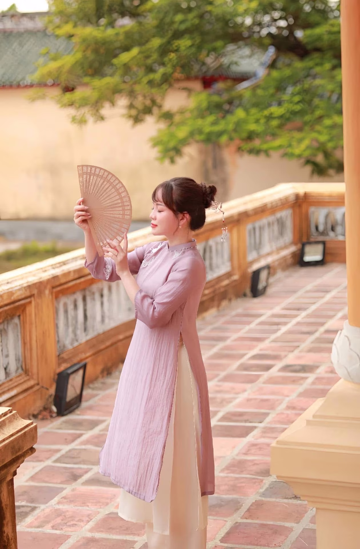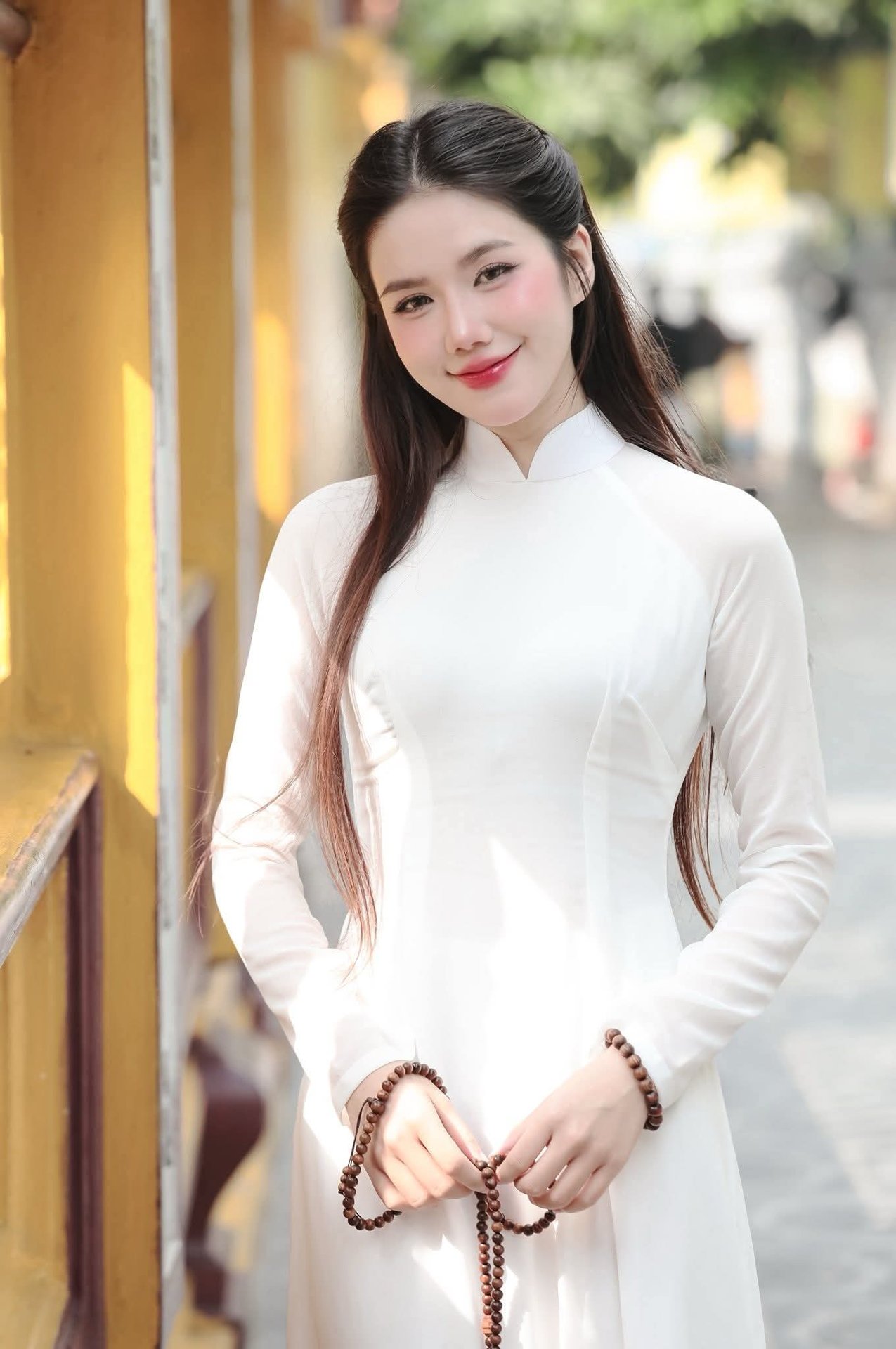This stunning photo captures the elegant and graceful beauty of a Vietnamese girl in a traditional patterned dress. The form-fitting dress accentuates her slender figure, combined with exquisite patterns reflecting a distinct Oriental style. She poses gracefully beside an ancient yellow railing, holding a white paper fan that adds a delicate touch. Her radiant face and clear eyes exude youthful charm and vitality. This image is not just a fashion moment but a harmonious blend of modern beauty and traditional cultural values. It is an ideal picture for those who appreciate pure beauty and unique Oriental fashion style.Elegant White Ao Dai: Capturing Graceful Vietnamese Traditional Beauty with a Radiant Smile