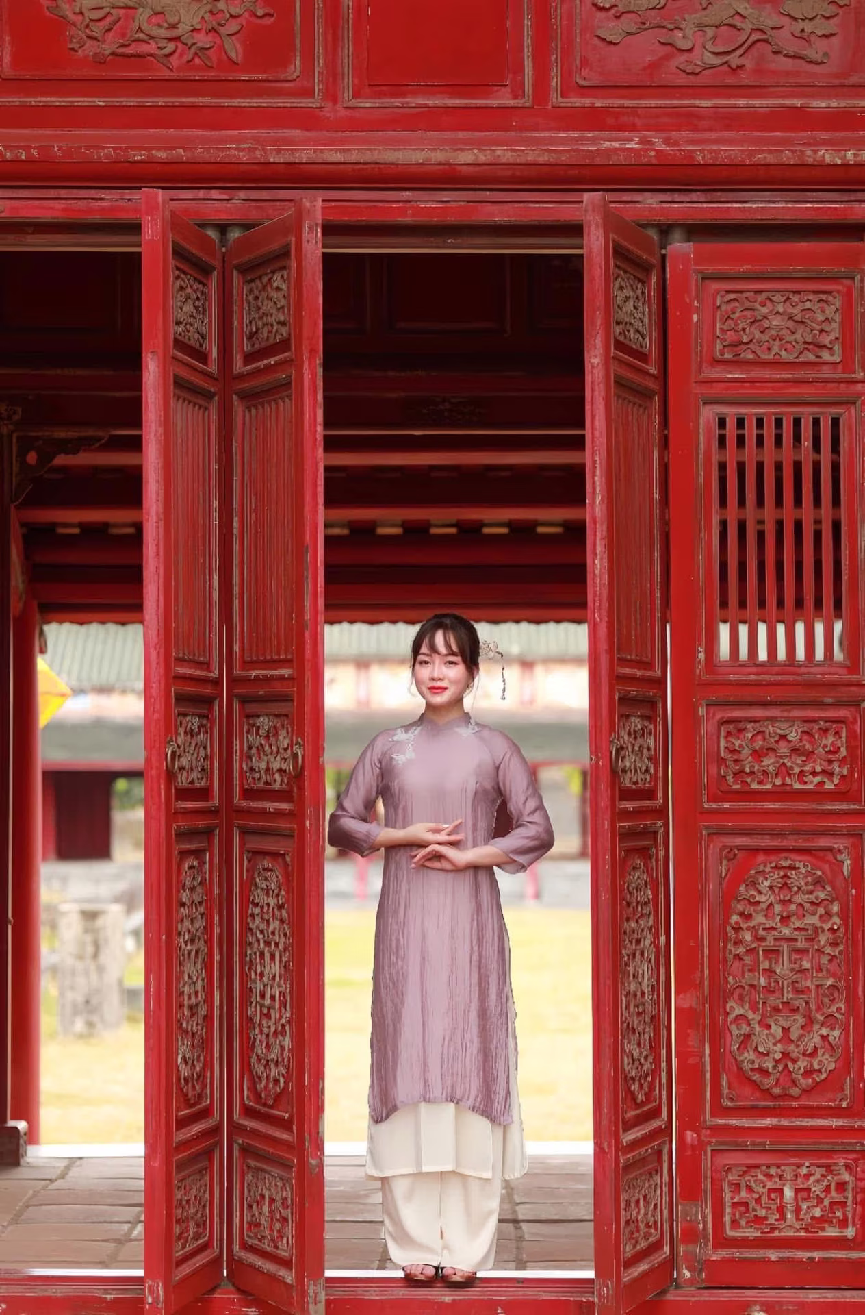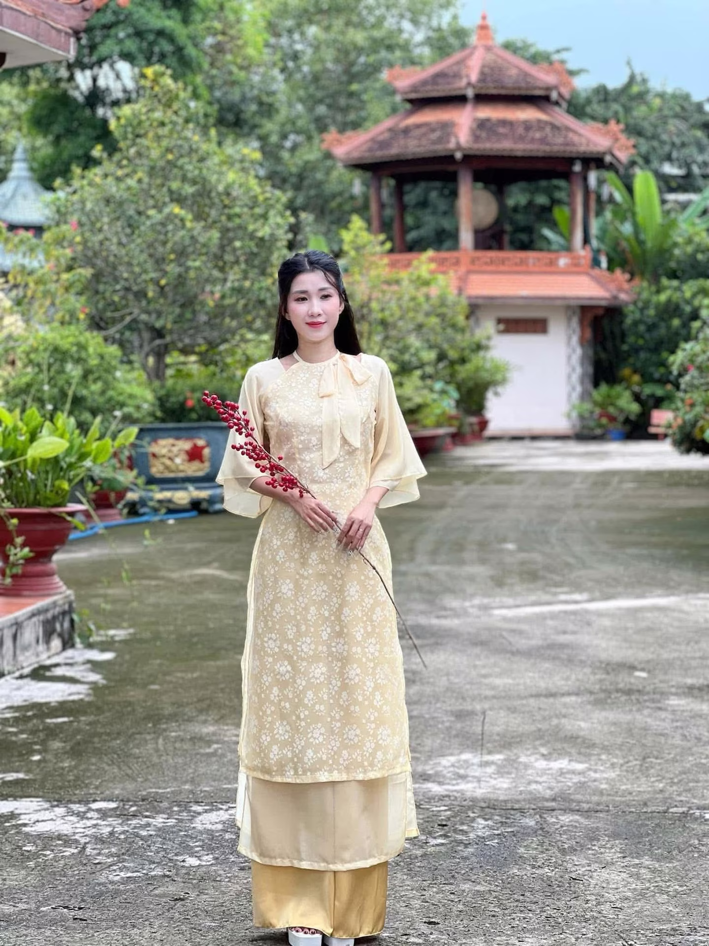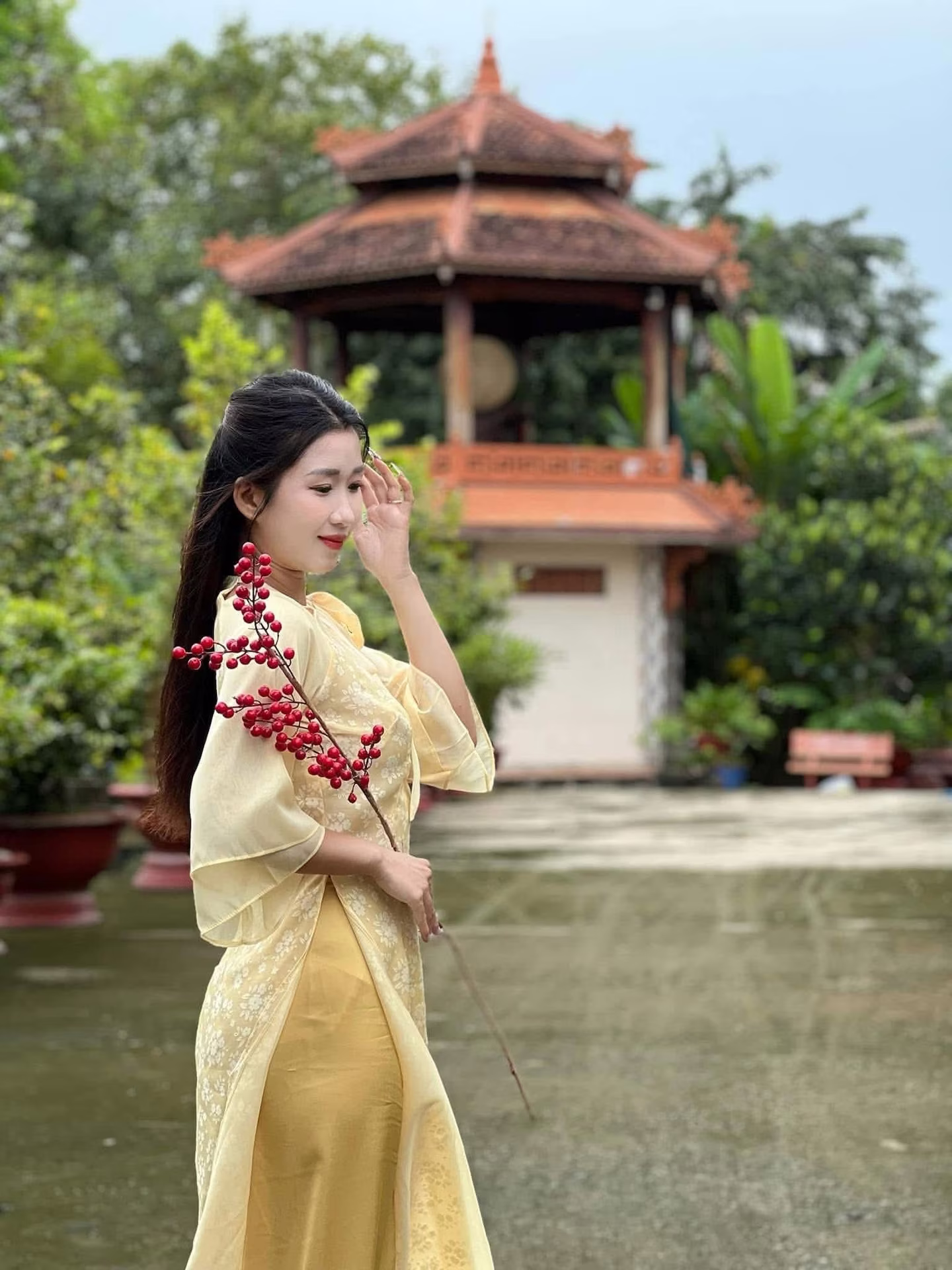 This exquisite photograph captures a Vietnamese young woman embodying gentle and ethereal beauty adorned in a refined pastel purple Ao Dai. The traditional dress is delicately embellished with subtle white embroidery accentuating the inherent grace of an East Asian woman. She stands demurely within an ancient red wooden doorway her gaze softly cast downwards hands tenderly poised as if adjusting a small item creating a moment of thoughtful introspection and tranquility. Her beauty transcends the attire emanating from her serene and elegant demeanor reminiscent of enduring cultural values. This image epitomizes the pure and noble beauty of Vietnamese women evoking a sense of peace and nostalgia for a golden era of traditional aesthetics. The photograph harmoniously blends ancient architecture with human grace highlighting profound cultural significance.XVG No.32: Discover the Graceful Beauty of a Vietnamese Woman in Traditional Ao Dai with Red Berries