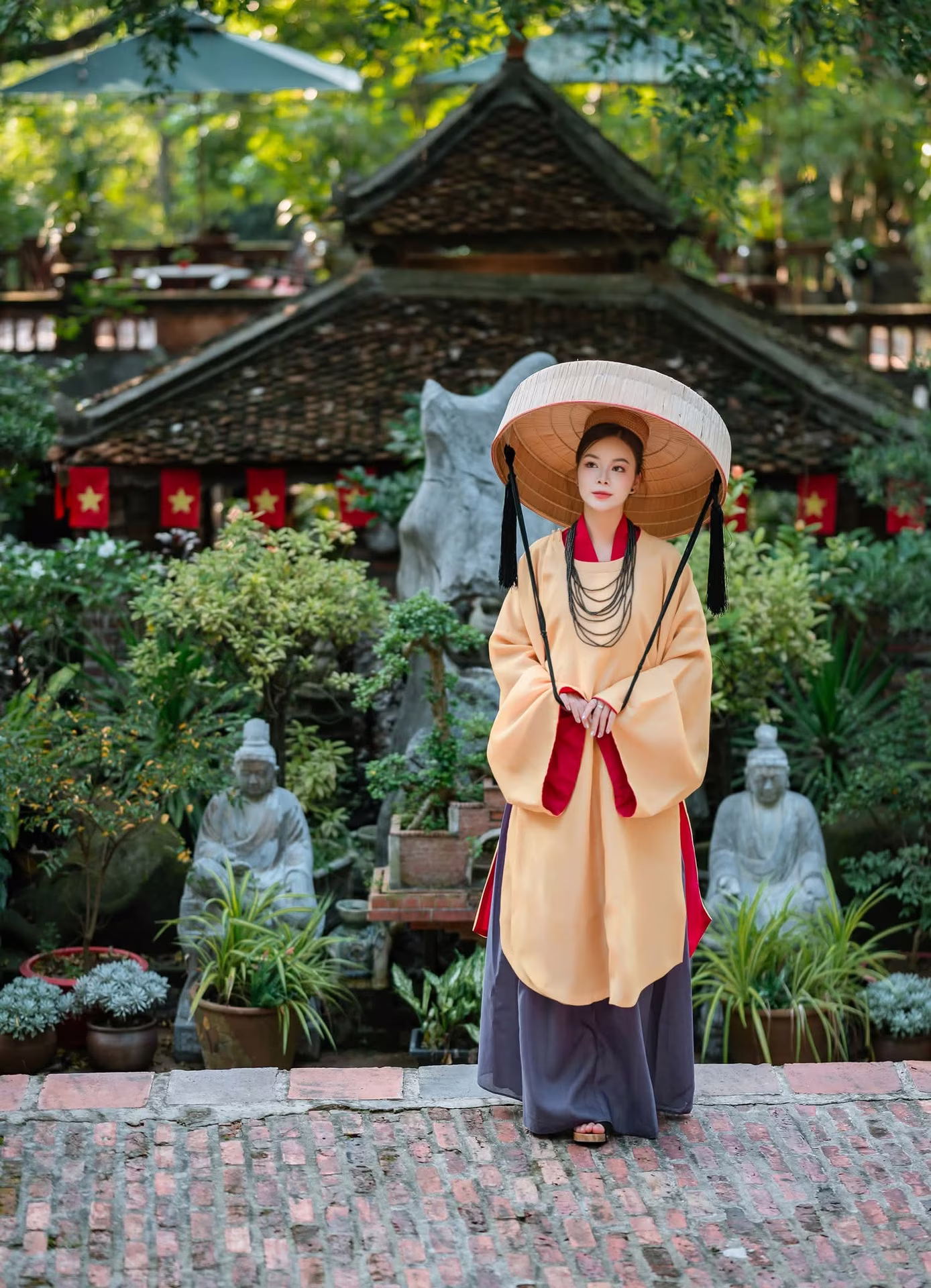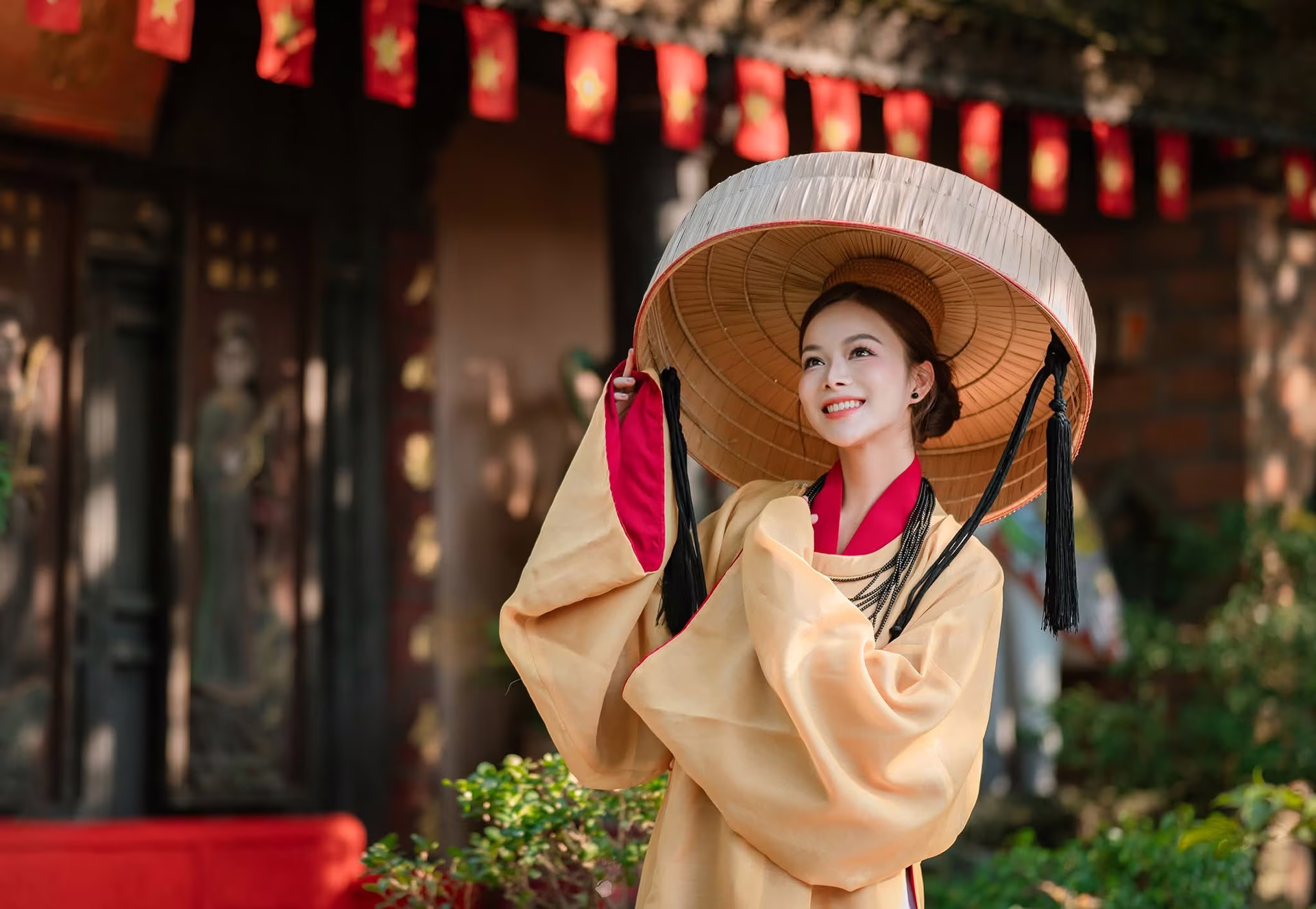 This stunning photograph captures a graceful Vietnamese woman with a radiant smile emanating peace and happiness. She wears an exquisite ancient traditional costume in subtle earthy yellow and deep red hues complemented by a unique wide-brimmed conical hat creating a look that is both classic and elegant. Behind her is temple architecture bearing the distinctive cultural imprint of Vietnam with intricate carvings and a sacred atmosphere. This image not only celebrates the beauty of the woman but also serves as a vibrant symbol of Vietnam's traditional cultural essence. The timeless beauty of the attire blends with the ancient architecture creating an emotional tableau of heritage and national identity. This is a peaceful moment of pride for a Vietnam rich in character.