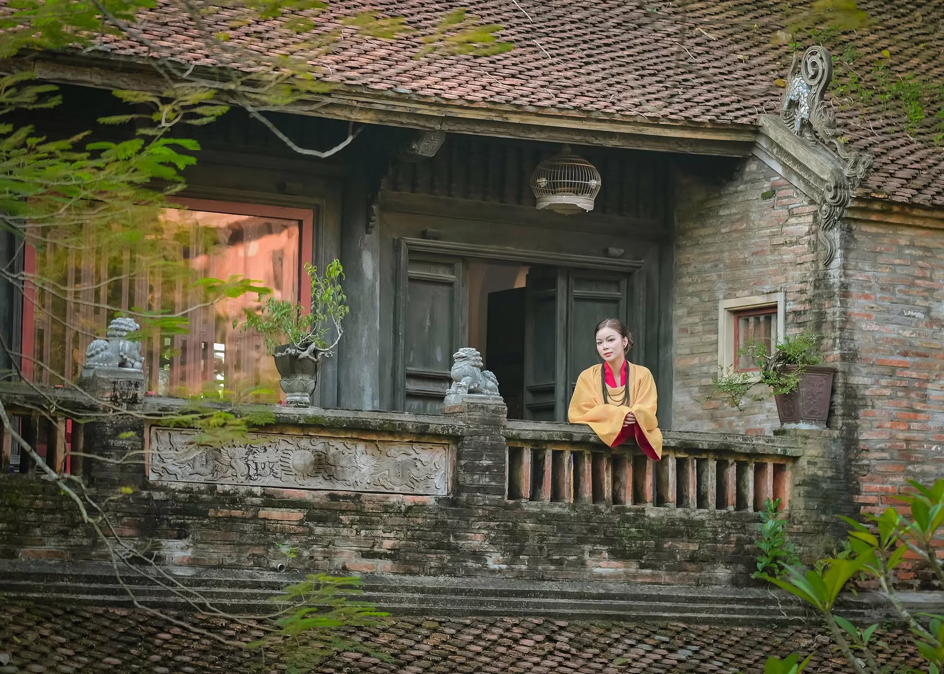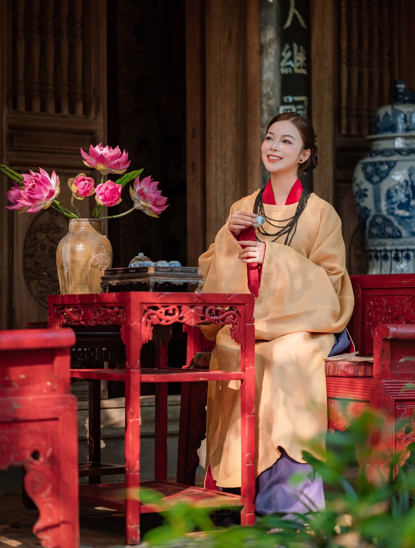 XVG No.24 captures a stunning moment of an elegant young woman in a flowing intricately pleated pink dress. The gown not only highlights her graceful beauty but also adds a soft romantic touch to her appearance. She gently holds a bouquet of blue hydrangeas her gaze dreamy as she embraces the serene ambiance of Hoan Kiem Lake. In the background the ancient Turtle Tower and lush green trees create a picturesque distinctly Vietnamese setting. This photograph is a perfect blend of natural human beauty and charming scenery evoking a sense of tranquility and allure.XVG No.18 - Elegant Vietnam: Captivating Traditional Beauty in a Sacred Setting