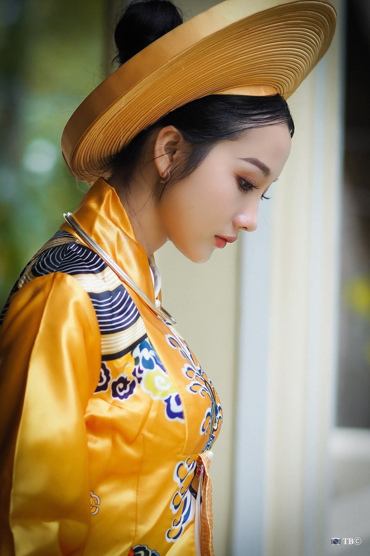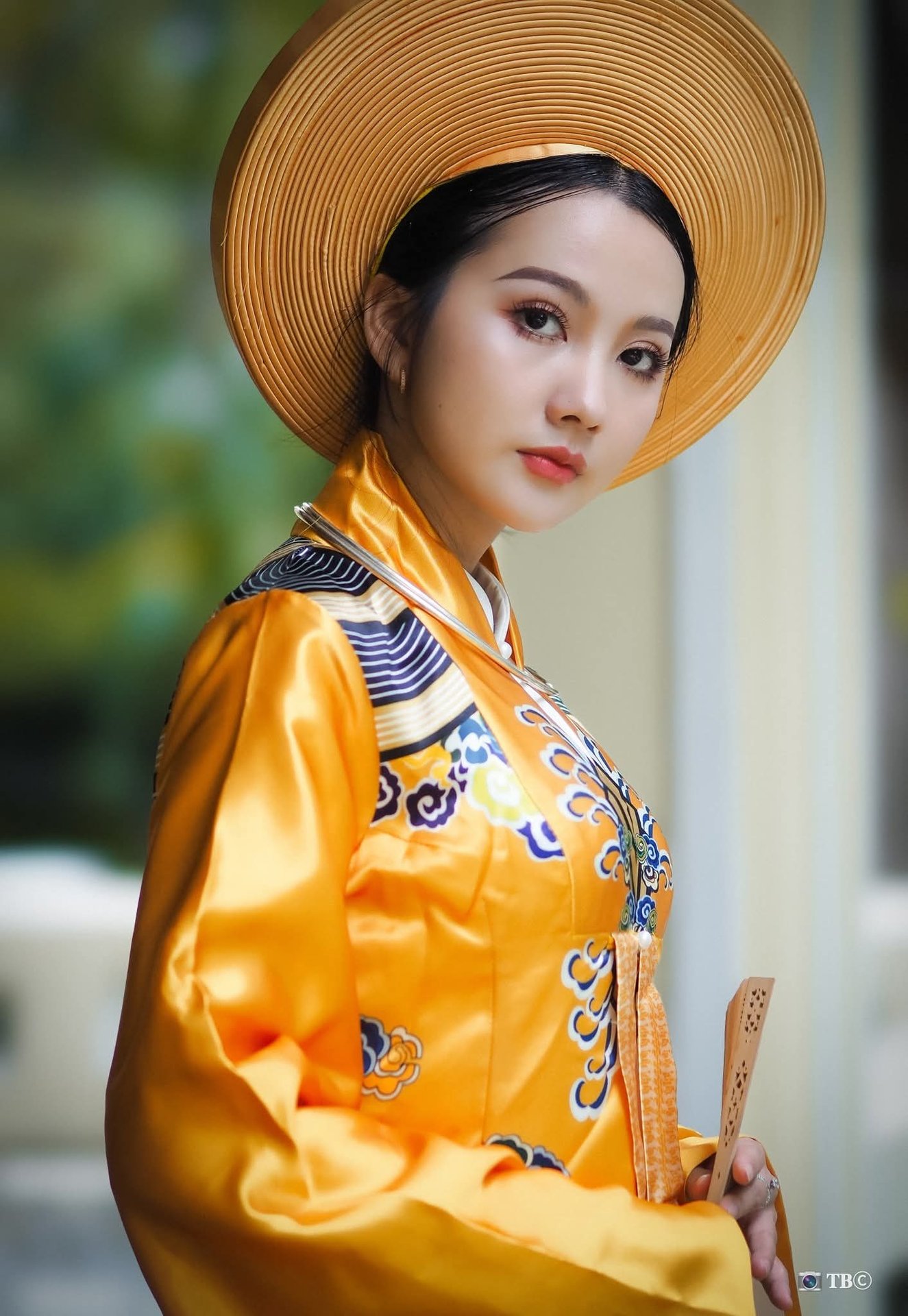 This captivating image beautifully captures the traditional grace of Vietnamese women through the portrayal of an elegant young lady in royal court attire She dons a vibrant golden Ao Nhat Binh adorned with exquisite embroidered patterns exuding the sophistication and nobility of ancient Vietnamese culture The traditional Non Quai Thao hat and the delicate hand fan further enhance her refined classic charm Her gaze is distant and contemplative as if conveying deep sentiments evoking memories of a golden era in history This is more than just a photograph it is a narrative of a rich cultural heritage a source of pride for the distinctive traditional costumes of the Vietnamese people This image will undoubtedly stir feelings of affection and appreciation for traditional values in everyoneElegant Woman in Pink Ao Dai at Hanoi Grand Cathedral - Vietnamese Cultural Charm