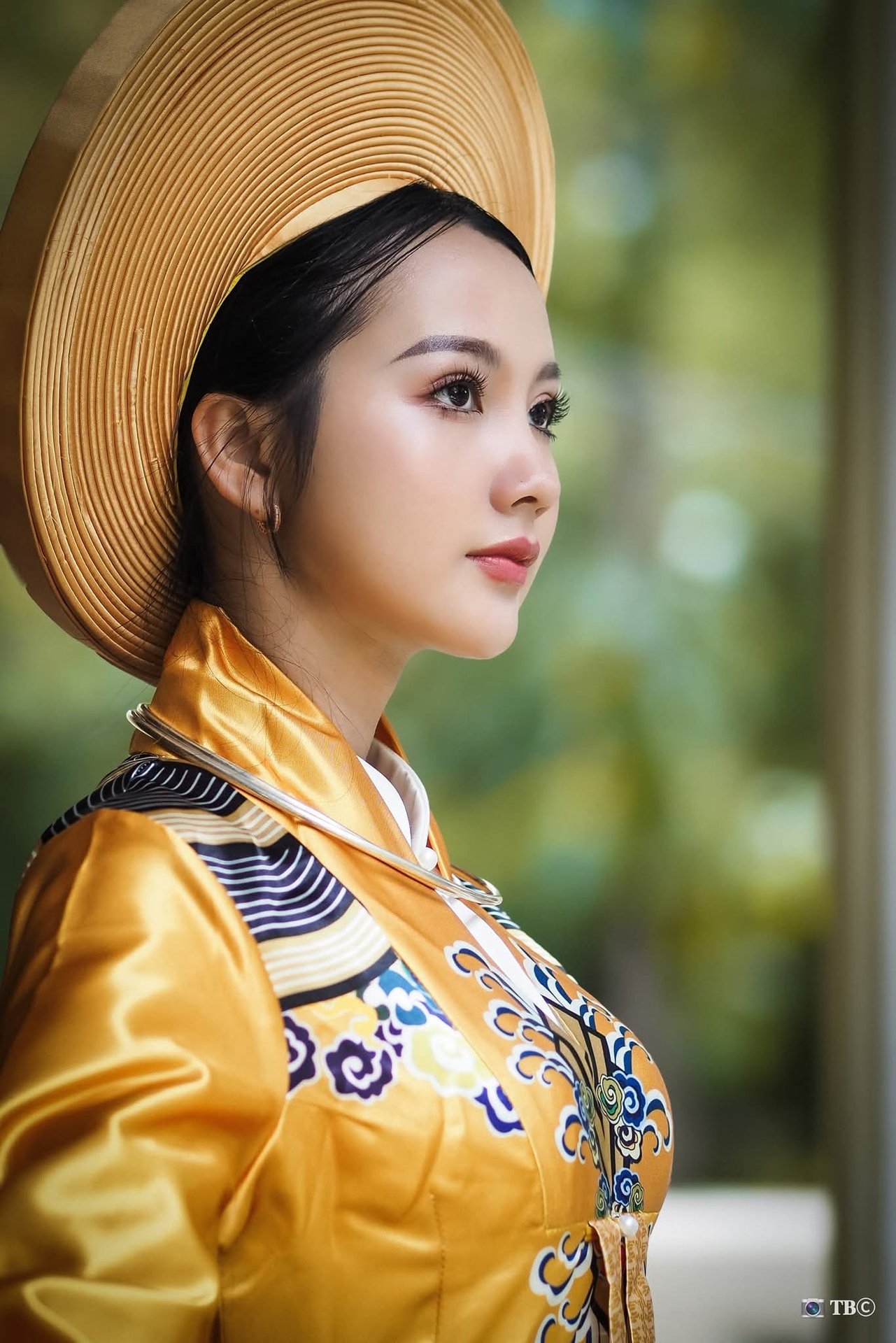 This image captures the exquisite grace of a Vietnamese woman adorned in sophisticated traditional attire. She wears a modern interpretation of the Ao Dai in a serene teal hue, its gentle silhouette exuding elegance and refinement. In her hands, she delicately holds a bouquet of fresh pink lotus flowers, symbols of purity and the soulful beauty of Vietnam. Her contemplative gaze, looking into the distance, seems to narrate a story of nostalgia and the preservation of cultural values. The ancient architecture in the background further accentuates the traditional charm, transporting viewers into a space of tranquility and pride in Vietnam's heritage. It is a moment where past and present converge, celebrating traditional beauty with subtle artistry.Traditional Vietnamese Beauty: Elegant Lady in Royal Attire & Conical Hat