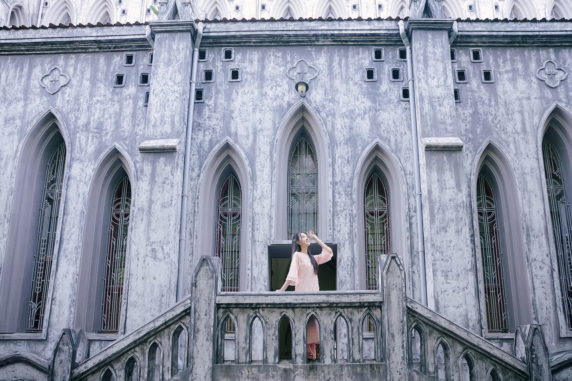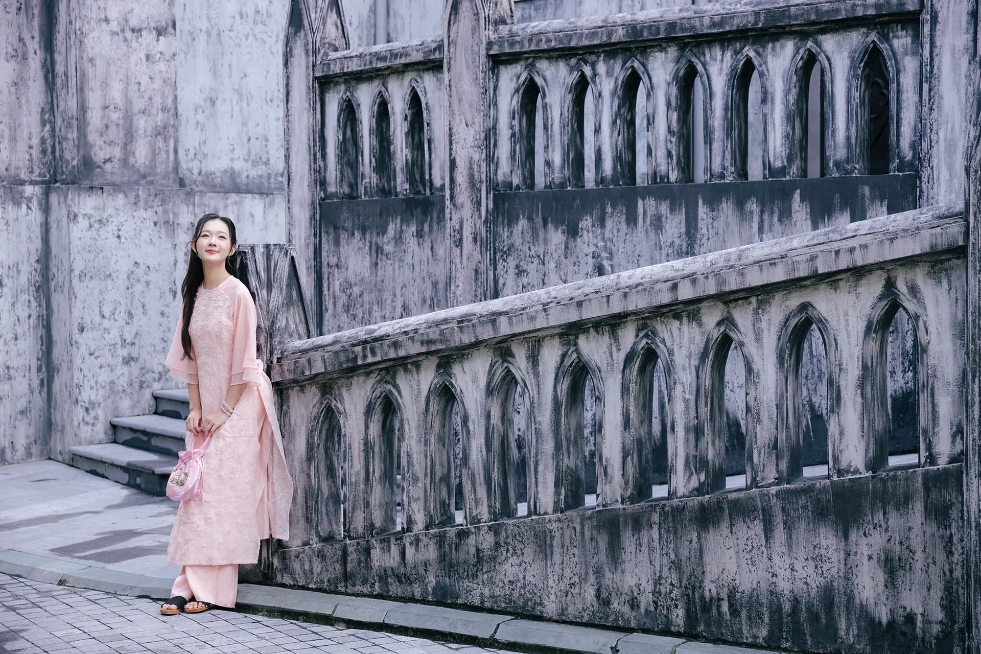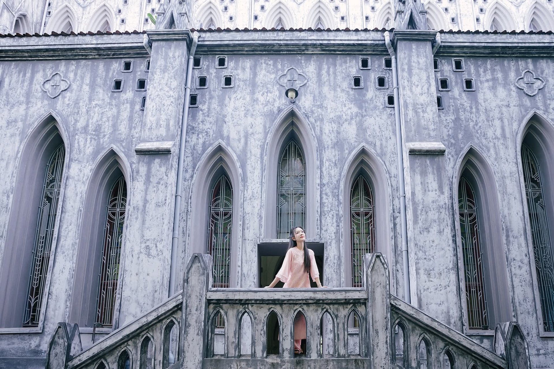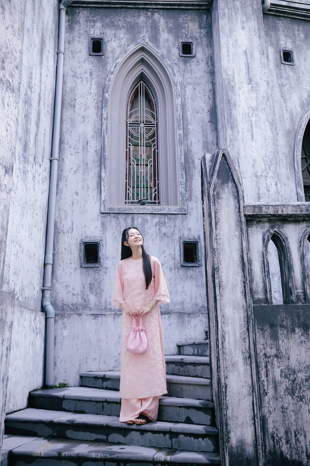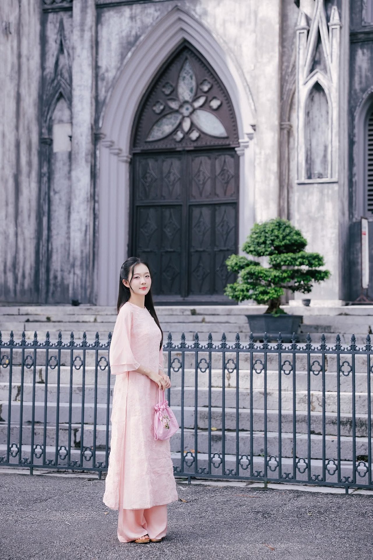 This captivating image beautifully captures a young Vietnamese woman gracefully adorned in a traditional pink Ao Dai standing elegantly before the iconic Hanoi Grand Cathedral. The soft pink hue of her attire harmonizes exquisitely with the ancient Gothic architecture creating a striking yet harmonious contrast between contemporary grace and timeless heritage. She embodies the refined elegance and charm of Vietnamese women. More than just a fashion statement this photograph invites viewers to explore Hanois unique culture and architectural splendor. It evokes a sense of serenity and pride in a city rich with history where tradition and modernity intertwine enchantingly.Explore East Asian Traditional Beauty: An Elegant Muse in Soft Pastel Attire.