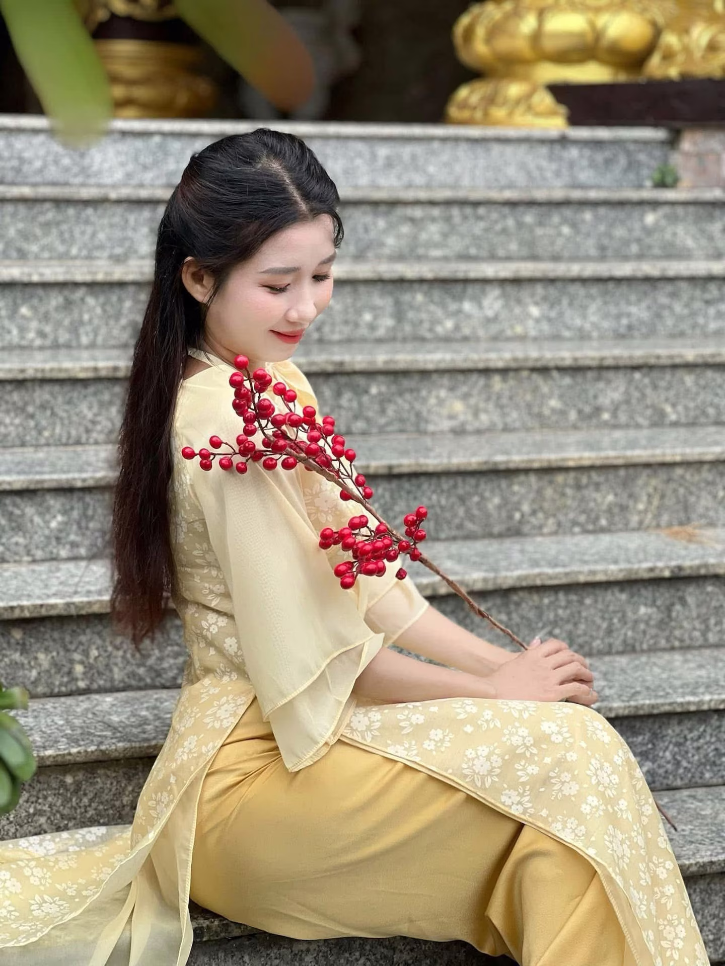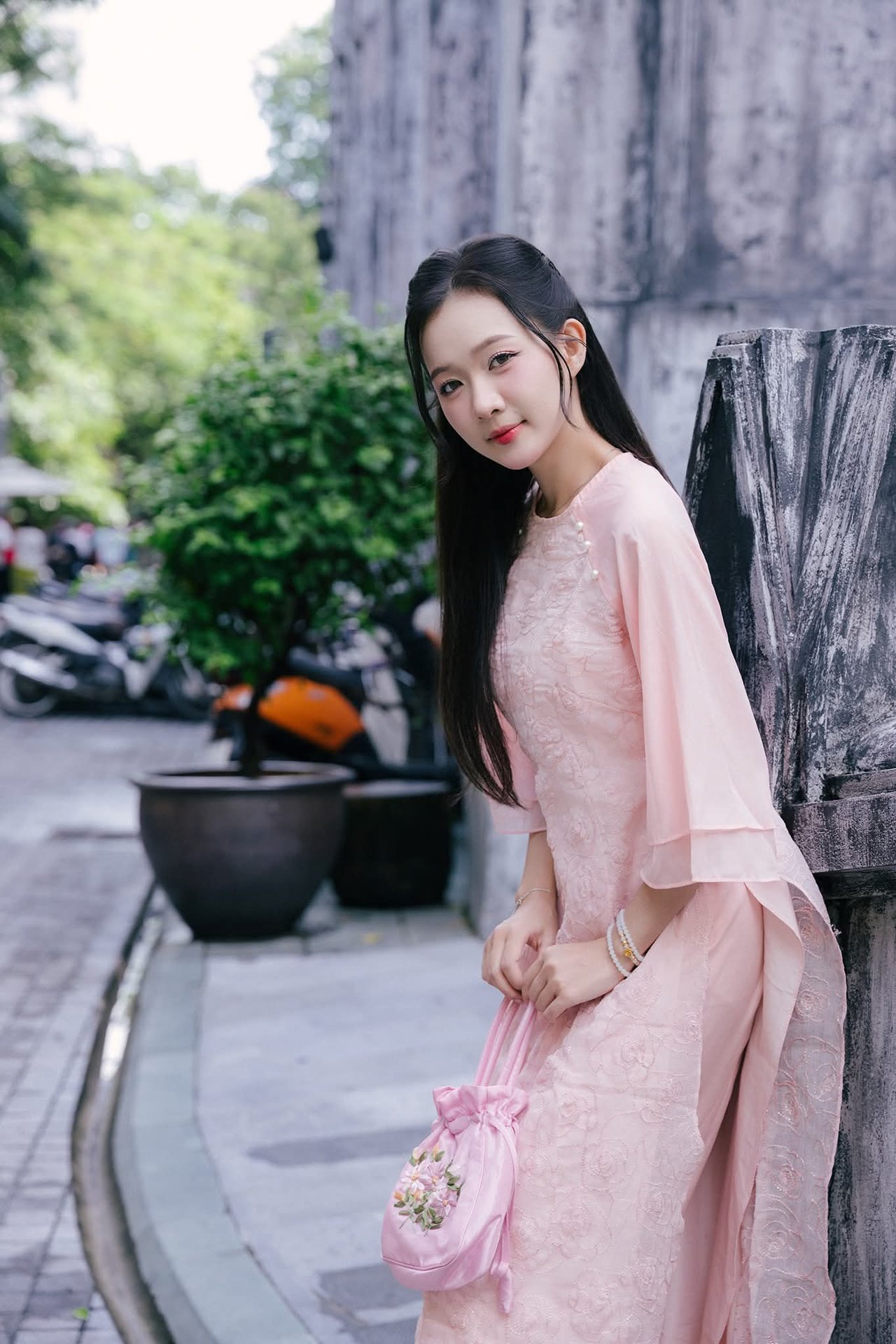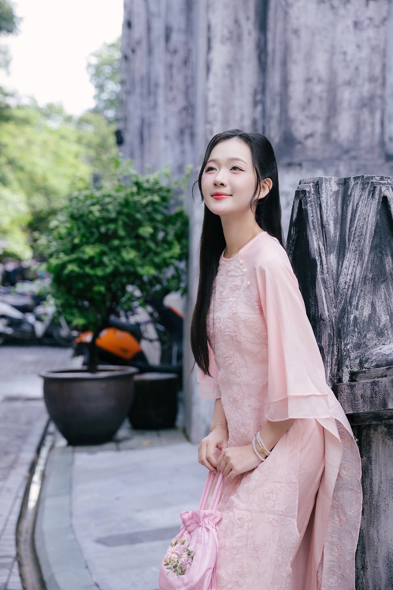This stunning photograph captures the serene grace of a young Vietnamese woman. Dressed in a delicate cream-yellow ao dai, intricately embroidered, she embodies traditional beauty and elegance. The flowing lines of her attire accentuate her graceful figure as she sits gently on ancient stone steps. Her long hair cascades softly, and her gaze is cast downwards, suggesting a moment of peaceful contemplation. A vibrant branch of red berries held delicately in her hand provides a beautiful color contrast, adding a touch of freshness and vitality to the scene. This image is more than just a snapshot; it tells a story of Vietnamese soulfulness, a harmonious blend of human beauty and traditional surroundings, evoking feelings of purity and gentleness.XVG No.24: Discover the Graceful Beauty of a Young Woman in Pink by Hoan Kiem Lake