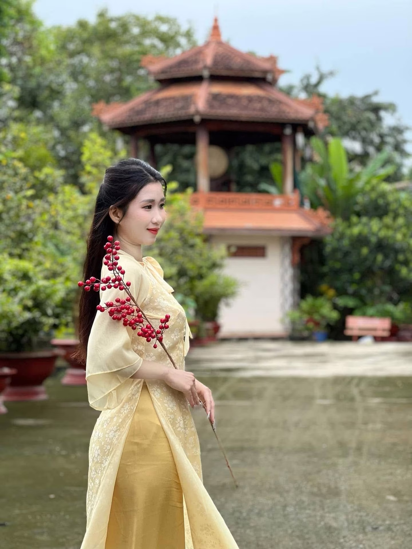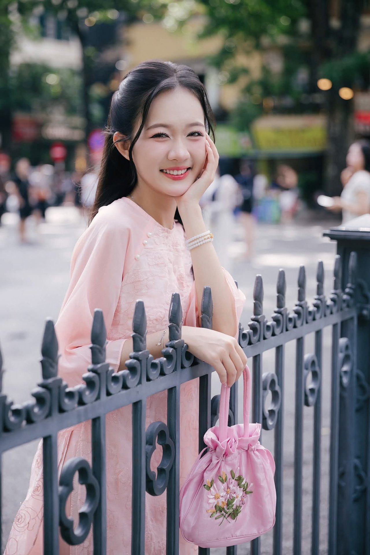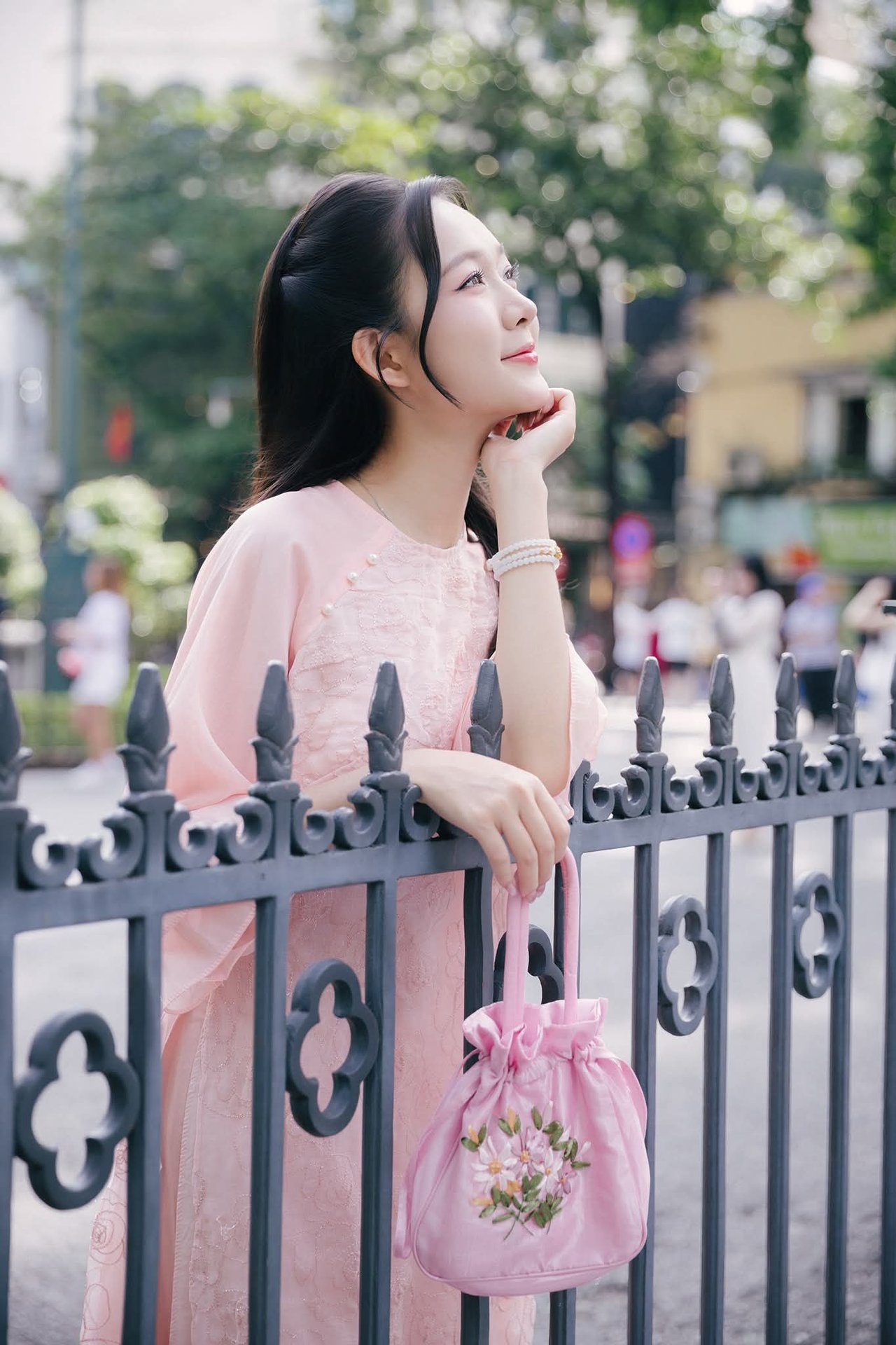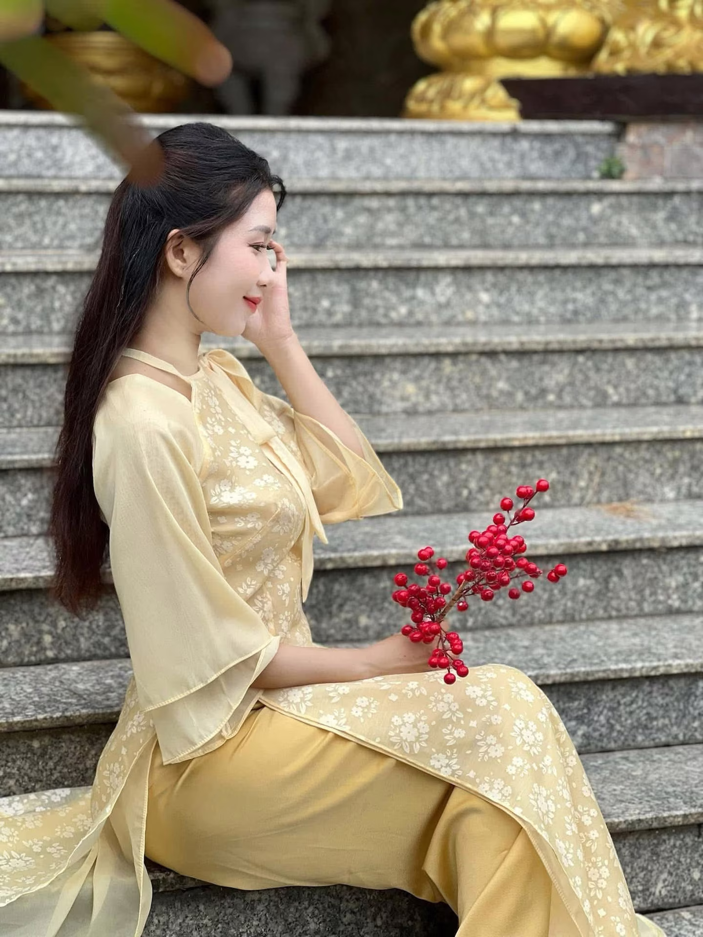 This stunning photograph captures the serene grace of a young Vietnamese woman. Dressed in a delicate cream-yellow ao dai, intricately embroidered, she embodies traditional beauty and elegance. The flowing lines of her attire accentuate her graceful figure as she sits gently on ancient stone steps. Her long hair cascades softly, and her gaze is cast downwards, suggesting a moment of peaceful contemplation. A vibrant branch of red berries held delicately in her hand provides a beautiful color contrast, adding a touch of freshness and vitality to the scene. This image is more than just a snapshot; it tells a story of Vietnamese soulfulness, a harmonious blend of human beauty and traditional surroundings, evoking feelings of purity and gentleness.XVG No.24: Discover the Graceful Beauty of a Young Woman in Pink by Hoan Kiem Lake