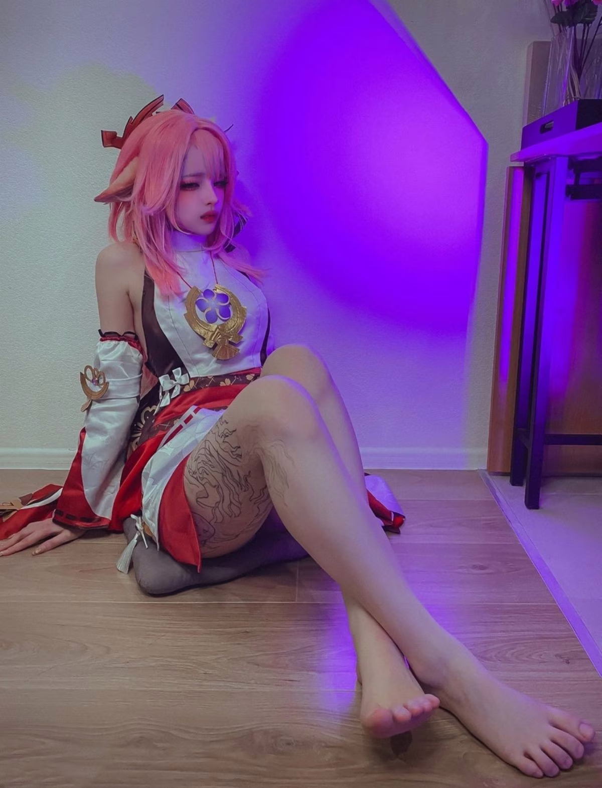 This stunning image captures Coser Bao Zou Li Yu Wangs beautiful portrayal of Yae Miko from Genshin Impact The cosplay outfit is meticulously recreated with striking pink and white colors creating an elegant and mystical appearance She sits amidst an ancient forest on a decaying tree stump evoking a sense of harmony with wild nature Her flowing pink hair and gentle gaze highlight the characters charm and grace Every detail from accessories to posing demonstrates the dedication and passion of the cosplay artist This is part of Bao Zou Li Yu Wangs December collection Part04 promising many more impressive visuals for fans and those who appreciate the art of costume play