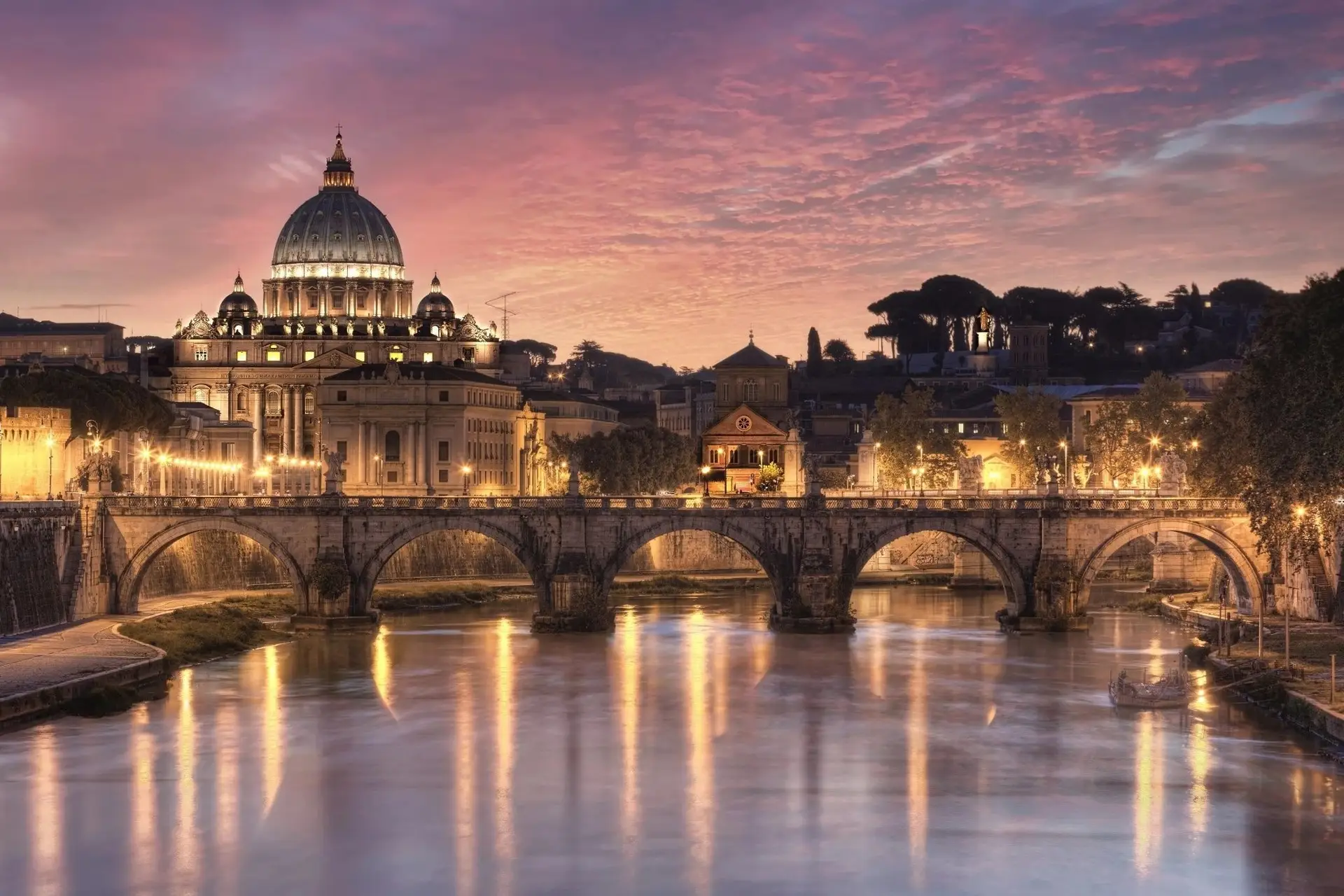 This stunning image captures the ethereal twilight over the Tiber River, where the shimmering lights from ancient bridges and architectural marvels reflect upon the tranquil water. At the heart of this panorama stands St. Peter's Basilica Vatican, a magnificent Renaissance architectural icon, grandly asserting its presence with Michelangelo's splendid dome prominently against the pink and purple sky. More than just a paramount religious center, this edifice is a Vatican historical site, deeply marked by time and the genius of renowned architects. Every detail tells a story of creation, faith, and supreme art. This glorious night scene invites visitors to admire its eternal beauty and feel the sacred, majestic aura of a global architectural masterpiece.