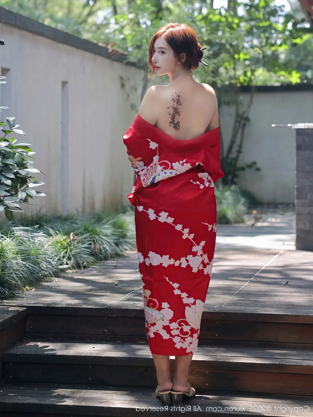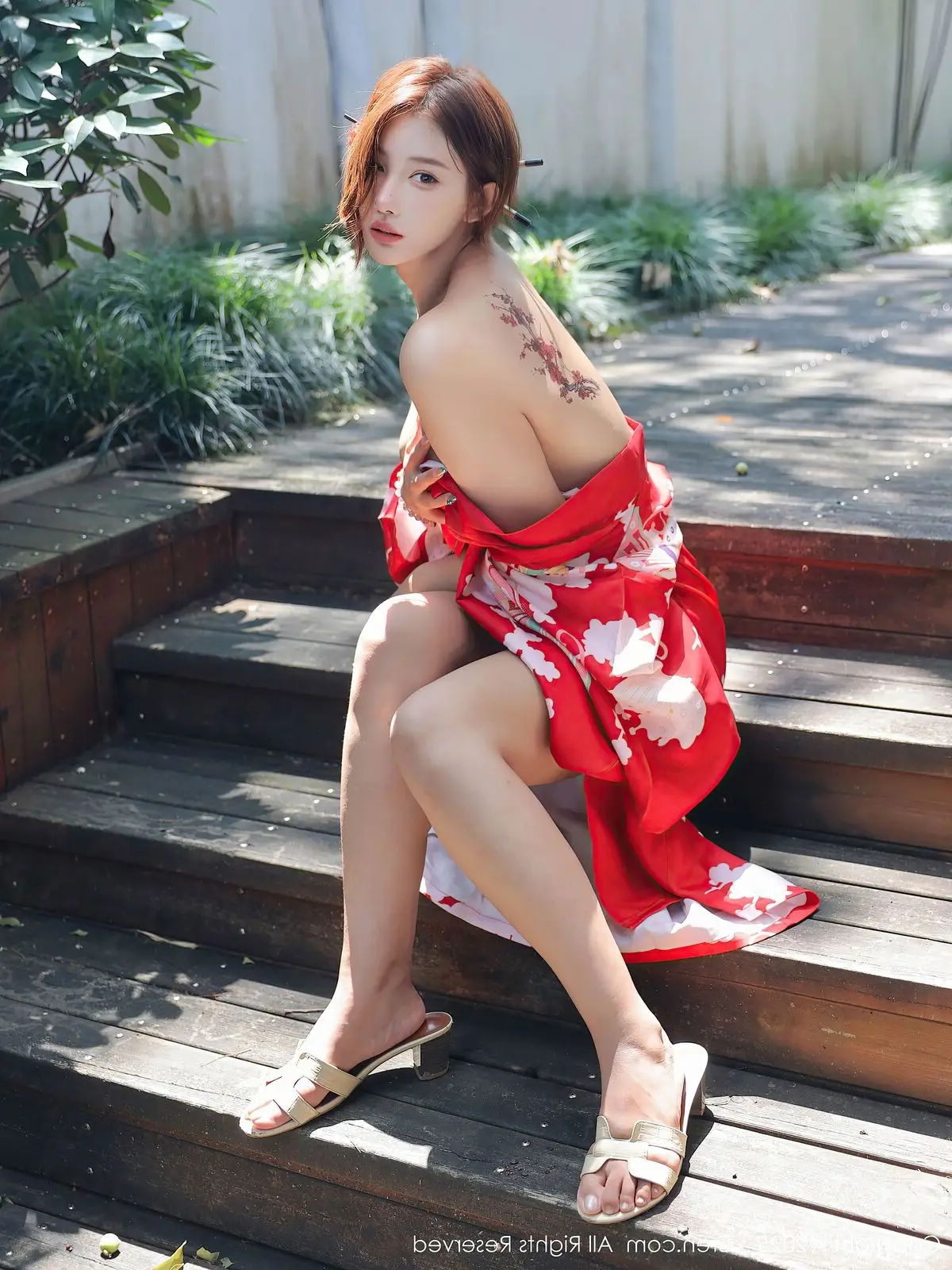 Jin Yun Xi Yuki radiates brilliantly in a traditional red kimono, yet styled with captivating allure. The striking red hue, adorned with delicate white floral patterns, highlights her graceful and elegant beauty. The kimono is artfully draped, revealing alluring bare shoulders, creating a harmonious blend of classic charm and modern appeal. Jin Yun Xi Yuki’s captivating gaze and confident demeanor make it impossible for viewers to look away. She stands on wooden steps amidst a lush green setting, forming a picturesque and enchanting scene. This is not merely a fashion photograph but a sophisticated expression of East Asian beauty, exuding an irresistible charm.