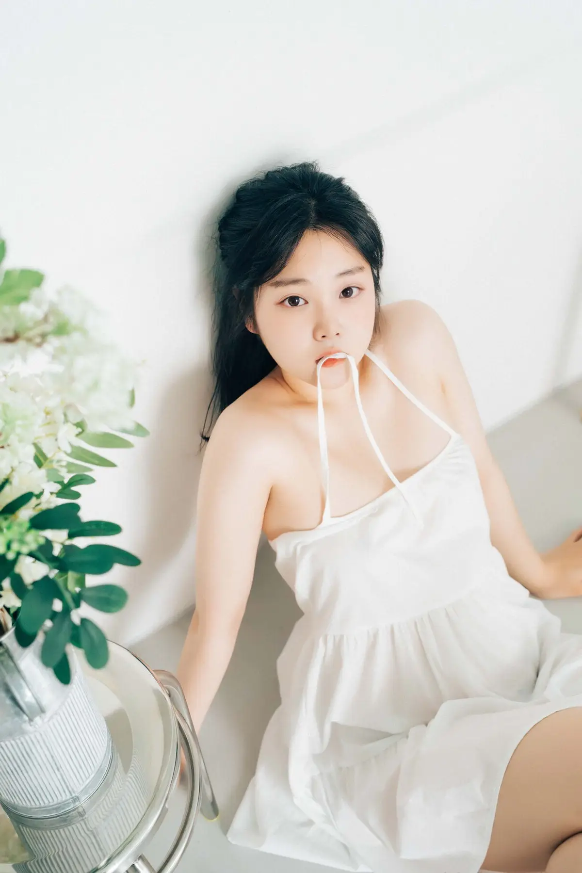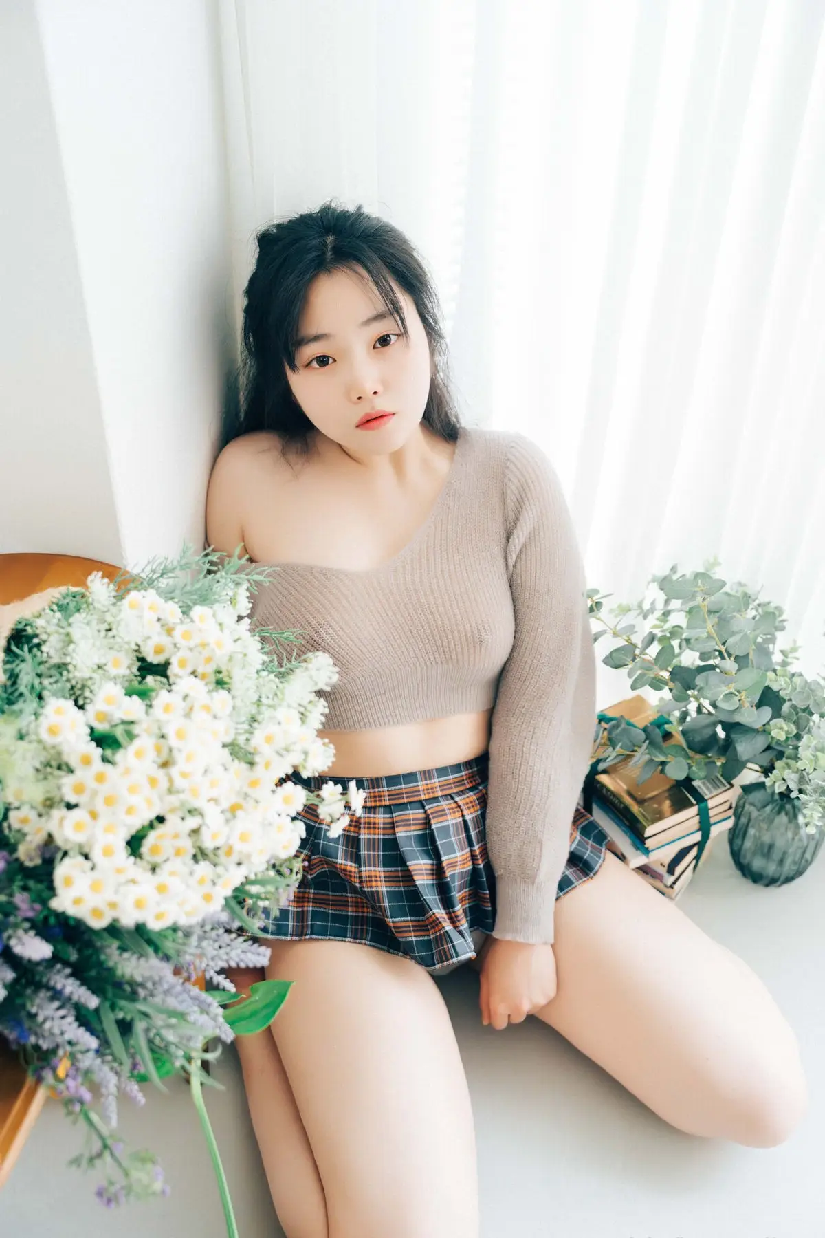 In this captivating image Haivia RAMI embodies an elegant and gentle beauty. She is seated gracefully against a soft white background adorned with fresh floral arrangements creating a serene and picturesque scene. Haivia RAMI's radiant fair skin is beautifully highlighted by the natural light enhancing her captivating allure. Her simple yet stylish outfit a beige crop top and a plaid mini skirt subtly accentuates her slender figure. Haivia RAMI's direct gaze carries a hint of confidence and contemplation inviting viewers to delve deeper. This photograph not only captures her stunning features but also conveys a sense of delicate sophistication. It is a cherished piece from the exclusive collection showcasing Haivia RAMI and her beautiful fair skin.#HaiviaRAMI #FairSkinBeauty #AsianModel #Graceful #Portrait